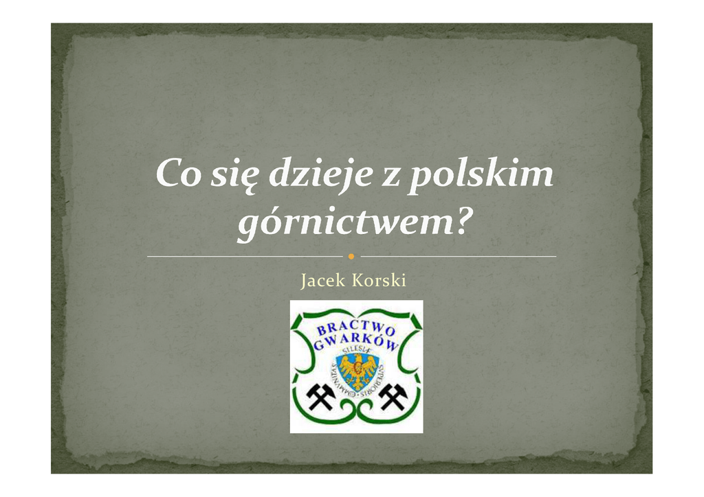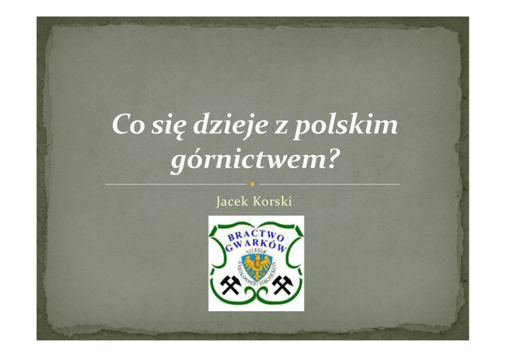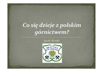 Jacek Korski Kiedy spotkaliśmy się w Bractwie Gwarków w marcu 2015 rozmawialiśmy o kryzysie w Polskim Górnictwie Węglowym próbowaliśmy zidentyfikować przyczyny, stan aktualny i perspektywy. Bractwo Gwarków - 21 stycznia 2016 2 Obowiązująca w UE polityka dekarbonizacji gospodarki jako sposób na walkę z globalnym ociepleniem. Rosnące zadłużenie branży. Zapasy węgla przekraczające łącznie 15mln Mg łącznie w górnictwie i energetyce; Mała elastyczność kosztowa polskich producentów węgla kamiennego, w tym wysoki udział kosztów pracy, Malejące wydobycie atrakcyjnych rynkowo węgli (koksowy typu „Hard” i węgle opalowe, w tym tzw. węgle grube i paliwa ekologiczne; powodują, że niemal wszyscy polscy producenci węgla kamiennego stoją na granicy utraty płynności finansowej. Mimo opracowania przez firmę Roland Berger pod koniec 2013 raportu o sytuacji w śląskim górnictwie i jej przyczynach nie podjęto żadnych działań naprawczych dla usunięcia tych przyczyn i przeciwdziałaniu dalszemu pogarszaniu się zaistniałej sytuacji. Spektakularne akcje protestacyjne doprowadzały do zmian w składach zarządów spółek węglowych i podpisywania kolejnych porozumień, których podstawowym celem jest doraźne przywracanie spokoju społecznego. Zamiast pogłębionej diagnozy i analizy źródeł i przyczyn złej sytuacji śląskich spółek węglowych politycy przyjęli ocenę sytuacji przedstawioną przez liderów związkowych – istotne było „lanie oliwy na wzburzone fale”. Zapomniano jednak lub zaakceptowano wiedzę, że „fale uspokajają się do czasu wyczerpania zapasów oliwy”. Wzrost gospodarczy Polski nie przekłada się proporcjonalnie na wzrost zużycia energii elektrycznej, Dotowane projekty termomodernizacji i nowe technologie w budownictwie zmniejszają zapotrzebowanie na energię do ogrzewania, Jeżeli powstaną nowe bloki energetyczne na węgiel kamienny to będą miały znacznie niższe od obecnych jednostkowe zużycie paliwa (węgla kamiennego) – przy tej samej mocy będą potrzebować znacząco mniej węgla. W tzw. mikście energetycznym będzie malał udział węgla (także kamiennego) Przestała działać tzw. renta geograficzna chroniąca przed konkurencją zewnętrzną. Nie występują obiektywne czynniki wskazujące na wzrost zapotrzebowania na węgiel kamienny wydobywany przez polskie kopalnie (ilość, jakość, cena) Maleje w Polsce wydobycie węgla kamiennego o jakości spełniającej wymagania obrotu międzynarodowego przy wysokim koszcie wydobycia, To mimo, że węgle kopalne stanowić będą jeszcze przez wiele lat podstawowe nośnik w produkcji energii elektrycznej w Polsce zapotrzebowanie polskiej gospodarki na węgiel kamienny będzie szybko maleć! Zawarte porozumienia społeczne i nowe regulacje prawne w istocie nie rozwiązują, żadnego z fundamentalnych problemów polskiego górnictwa węgla kamiennego, a jedynie odsuwają w czasie katastrofę i łagodzą konflikty społeczne. Program Naprawczy dla KW nie rozwiązuje problemu zadłużenia tej spółki, a tylko nieznacznie ograniczy podaż węgla kamiennego. W konsekwencji po 2020 roku przetrwa w Polsce 10-12 kopalń węgla kamiennego Bractwo Gwarków - 21 stycznia 2016 8 W wyniku wyborów parlamentarnych w dniu 25 pażdziernika 2015 zwyciężyła dotychczasowa partia opozycyjna i w konsekwencji utworzono nowy Rząd. W ramach rządu górnictwo węglowe trafiło pod nadzór nowoutworzonego Ministerstwa Energii Wg ostatnich informacji utrzymano, w stosunku do Kompanii Węglowej, ostatnią koncepcję poprzedniego Rządu. Bractwo Gwarków - 21 stycznia 2016 9 w Kompanii Węglowej: Rozpoczęto sprzedaż węgla ze zwałów po bardzo obniżonych cenach (poniżej kosztu wydobycia) Kopalnie Makoszowy, Centrum i Brzeszcze trafiły do Spółki Restrukturyzacji Kopalń. Grupa Tauron odkupiła za symboliczną złotówkę część kopalni Brzeszcze od SRK. Kopalnie Bobrek i Piekary trafiły do grupy Weglokoksu W oparciu o Węglokoks i innych udziałowców (energetyka zawodowa? TI Silesia) ma powstać Polska Grupa Górnicza). Bractwo Gwarków - 21 stycznia 2016 10 w Katowickim Holdingu Węglowym: Ruch Boże Dary Kopalni Murcki-Staszic i kopalnia Kazimierz- Juliusz trafił do Spółki Restrukturyzacji Kopalń. Poszukuje się intensywnie rozwiązań zwiększających wychód atrakcyjnych sortymentów węglowych, Konsekwentnie realizuje się inne działania restrukturyzacyjne Bractwo Gwarków - 21 stycznia 2016 11 w Jastrzębskiej Spółce Węglowej: Spółka traci płynność finansową Dyskutuje się o „wygaszeniu” kop. Krupiński Podjęto decyzje o sprzedaży spółek z Grupy Kapitałowej (np. SEJ). Związki zawodowe wykazują większą niż poprzednio elastyczność w podejściu do ratowania spółki. Bractwo Gwarków - 21 stycznia 2016 12 LW Bogdanka obniżyła wydobycie i prowadzi intensywne działania dostosowawcze do istniejącej sytuacji rynkowej. Bractwo Gwarków - 21 stycznia 2016 13 Nadal spadają ceny ropy naftowej, wpływające na poziom cen węgli energetycznych. Histerię klimatyczną i antywęglową pogłębia fakt, że kolejny rok 2015 (po rekordowym 2014) okazał się najgorętszym na Ziemi od czasu wprowadzenia regularnych pomiarów. Prognozy klimatologów, że ok. 2030 roku czeka nas kolejna Mała Epoka Lodowcowa giną w ogólnym hałasie. W Polsce wprowadzono przepisy niesprzyjające zwiększeniu popytu na węgiel (ustawa „antysmogowa” , decyzje krakowskich i małopolskich samorządów. Bractwo Gwarków - 21 stycznia 2016 14 Koncentracja na problemach Kompanii Węglowej sprawia, że umyka uwadze fakt, że problemy mają wszystkie przedsiębiorstwa wydobywające w Polsce węgiel kamienny. Potrzebne jest więc całościowe podejście do problemu górnictwa węglowego w naszym Kraju i zapotrzebowania na węgiel. Bractwo Gwarków - 21 stycznia 2016 15 Ostatnie zamieszanie wokół Polski w organach Unii Europejskiej może spowodować jeszcze większą ich