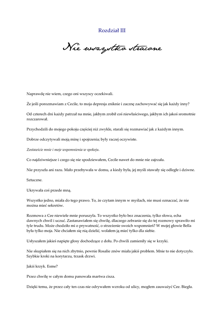 Rozdział III Nie wszystko stracone Naprawdę nie wiem, czego oni wszyscy oczekiwali. Że jeśli porozmawiam z Cecile, to moja depresja zniknie i zacznę zachowywać się jak każdy inny? Od czterech dni każdy patrzał na mnie, jakbym zrobił coś niewłaściwego, jakbym ich jakoś sromotnie rozczarował. Przychodzili do mojego pokoju częściej niż zwykle, starali się rozmawiać jak z każdym innym. Dobrze odczytywali moją minę i spojrzenia; były raczej oczywiste. Zostawicie mnie i moje wspomnienia w spokoju. Co najdziwniejsze i czego się nie spodziewałem, Cecile nawet do mnie nie zajrzała. Nie przyszła ani razu. Mało przebywała w domu, a kiedy była, jej myśli stawały się odległe i dziwne. Sztuczne. Ukrywała coś przede mną. Wszystko jedno, miała do tego prawo. To, że czytam innym w myślach, nie musi oznaczać, że nie można mieć sekretów. Rozmowa z Cee niewiele mnie poruszyła. To wszystko było bez znaczenia, tylko słowa, echa dawnych chwil i uczuć. Zastanawiałem się chwilę, dlaczego zebranie się do tej rozmowy sprawiło mi tyle trudu. Może chodziło mi o prywatność, o strzeżenie swoich wspomnień? W mojej głowie Bella była tylko moja. Nie chciałem się nią dzielić, wolałem ją mieć tylko dla siebie. Usłyszałem jakieś napięte głosy dochodzące z dołu. Po chwili zamieniły się w krzyki. Nie skupiałem się na nich zbytnio, pewnie Rosalie znów miała jakiś problem. Mnie to nie dotyczyło. Szybkie kroki na korytarzu, trzask drzwi. Jakiś krzyk. Esme? Przez chwilę w całym domu panowała martwa cisza. Dzięki temu, że przez cały ten czas nie odrywałem wzroku od ulicy, mogłem zauważyć Cee. Biegła. Zdecydowanie za szybko jak na ludzkie możliwości. Wyglądała na poruszoną i jednocześnie zdeterminowaną. Po dwóch sekundach zniknęła za rogiem. Dokładnie w tym momencie drzwi od mojego pokoju otworzyły się z hukiem. Jasper. Wyglądał na dość mocno poruszonego i takie też były jego myśli. Często przewijały się w nich dwa imiona: Cecile i Sebastian. No świetnie. - Mógłbyś zejść na dół? Carlisle chce z nami wszystkimi porozmawiać. Rzuciłem ostatnie spojrzenie na ponurą londyńską ulicę i podążyłem za nim. Szybko znaleźliśmy się w salonie. Esme była roztrzęsiona, Rosalie zniesmaczona, Emmett rozbawiony. Carlisle, przede wszystkim, się martwił. Przeszukałem szybko ich myśli, by odnaleźć sedno całej sprawy. - Nie będziesz mi mówił, co mam robić! Chcę sama za siebie decydować! Nie możesz… - Cecile, uspokój się. Spróbuj porozmawiać ze mną rozsądnie. Myślałem, że ta sprawa jest już dawno zapomniana. Przecież rozumiałaś, że Sebastian nie jest dla ciebie, że raniłby cię tylko. - Nikt nie pozwolił mi samej o tym zadecydować! Wszyscy myślą, że wiedzą, co jest dla mnie najlepsze, ale nikt nie pyta się mnie o zdanie! - Cecile, proszę… - Nie! Chcę sama decydować za siebie! Idę do Sebastiana, chcę z nim być, chcę sama móc… Wspomnienie się urwało. Westchnąłem cicho. Wiesz już to, co konieczne? Myśl Carlisle’a. Skinąłem lekko głową i skierowałem swą uwagę na Alice. Sondowała przyszłość w poszukiwaniu tego, co było niezbędne, by odnaleźć Cee i powstrzymać ją przed zrobieniem tego idiotyzmu. Czekaliśmy na to w ciszy. Esme nerwowo wygładzała frędzle od poduszki, bawiła się nimi, szybko przeplatała je między sobą, by po chwili znów je rozplątać. Spoglądała co chwilę na okno lub drzwi, jakby łudziła się, że za moment Cee w nich stanie i zapyta, dlaczego mamy takie ponure miny. W pewnej chwili wyrwała jej się myśl: Tak bym chciała, by Edward… Nie dałem po sobie poznać, że cokolwiek usłyszałem. Wiem, czego ona chciała. Swojego syna, Edwarda. Nie wiecznego, złamanego mężczyzny, żyjącego we wspomnieniach. Nie mogłem jej tego dać. Zauważyłem jaskółkę przelatującą ulicą. Dziwne. Tu, w Londynie? O tej porze? Jaskółka była zwiastunem wiosny, odrodzenia, radości. Nadziei. Nie pasowała do tej ponurej scenerii, pełnej dymu, ciemności i okrucieństwa. Dołączyła do niej druga. Latały dookoła siebie, wyglądały… jakby się przytulały lub całowały. Co za kretyńska myśl. Ptaki nie mogą się całować i przytulać. Odwróciłem od nich wzrok. Nie wiem dlaczego patrzenie na jaskółki było jeszcze gorsze, niż patrzenie na zakochanych ludzi. Wtedy Alice coś zobaczyła. Cee biegnącą po lesie. Najpewniej na umówione spotkanie z Sebastianem. A potem nagle wizja się urwała, zanikła. Spojrzałem na nią i upewniłem się, że dobrze zrozumiałem jej myśli. Odpowiedziała mi poważnym spojrzeniem. To się miało zacząć dziać w ciągu najbliższych minut. ******** Wyruszyliśmy szybko poza granice miasta. W wizji Alice był to gęsty las, więc zawężało nam to trochę pole działania. Najpewniej była to jedna z tych dzikszych puszcz, w których polowaliśmy od czasu przyjazdu. Starałem się wychwycić gdzieś myśli Cecile, odkąd zaczęliśmy opuszczać zabudowania i zbliżać się do mrocznych brzegów angielskich lasów. Cisza. Wszyscy dookoła mnie martwili się. Było to dość męczące, sam wystarczająco się niepokoiłem, nie musiałem być pobudzany przez ich myśli. Wtem, nagle dobiegły mnie znajome tony. Mam nadzieję, że się nie spóźnię… Co za idiotyczny pomysł spotykać się w lesie… Ech, wydawało mi się to takie… - Jest tutaj, w tym lesie. Jeszcze się z nim nie spotkała. – mruknąłem. Emmett, który prowadził, zareagował natychmiast. Zahamował z piskiem opon. Wszyscy wysiedli i zaczęliśmy biec w pokazanym przeze mnie kierunku. Robiło się coraz ciemniej. Podążaliśmy za jej zapachem, który, mimo deszczu, wciąż się utrzymywał. Była już daleko przed nami, zajmie nam kilka minut dopadnięcie jej. Powietrze było przesycone różnymi zapachami zwierząt i roślin. Podobało mi się, sprawiało wrażenie swobody, wolności, pierwotności. Moż