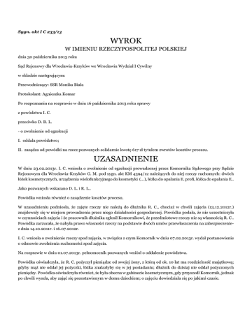 Sygn. akt I C 233/13 WYROK W IMIENIU RZECZYPOSPOLITEJ POLSKIEJ dnia 30 października 2013 roku Sąd Rejonowy dla Wrocławia-Krzyków we Wrocławiu Wydział I Cywilny w składzie następującym: Przewodniczący: SSR Monika Biała Protokolant: Agnieszka Komar Po rozpoznaniu na rozprawie w dniu 16 października 2013 roku sprawy z powództwa I. C. przeciwko D. R. L. - o zwolnienie od egzekucji I. oddala powództwo; II. zasądza od powódki na rzecz pozwanych solidarnie kwotę 617 zł tytułem zwrotów kosztów procesu. UZASADNIENIE W dniu 23.02.2013r. I. C. wniosła o zwolnienie od egzekucji prowadzonej przez Komornika Sądowego przy Sądzie Rejonowym dla Wrocławia-Krzyków G. M. pod sygn. akt KM 4394/12 należących do niej rzeczy ruchomych: dwóch łóżek kosmetycznych, urządzenia wielofunkcyjnego do kosmetyki (...), łóżka do opalania E. profi, łóżka do opalania E.. Jako pozwanych wskazano D. L. i R. L.. Powódka wniosła również o zasądzenie kosztów procesu. W uzasadnieniu podniosła, że zajęte rzeczy nie należą do dłużnika R. C., chociaż w chwili zajęcia (13.12.2012r.) znajdowały się w miejscu prowadzenia przez niego działalności gospodarczej. Powódka podała, że nie uczestniczyła w czynnościach zajęcia i że pracownik dłużnika zgłosił Komornikowi, że przedmiotowe rzeczy nie są własnością R. C.. Powódka zarzucała, że nabyła prawo własności rzeczy na podstawie dwóch umów przewłaszczenia na zabezpieczeniez dnia 14.10.2011r. i 16.07.2012r. I. C. wniosła o zwolnienie rzeczy spod zajęcia, w związku z czym Komornik w dniu 07.02.2013r. wydał postanowienie o odmowie zwolnienia ruchomości spod zajęcia. Na rozprawie w dniu 01.07.2013r. pełnomocnik pozwanych wniósł o oddalenie powództwa. Powódka oświadczyła, że R. C. pożyczył pieniądze od swojej żony, z którą od ok. 10 lat ma rozdzielność majątkową; gdyby mąż nie oddał jej pożyczki, łóżka znalazłyby się w jej posiadaniu; dłużnik do dzisiaj nie oddał pożyczonych pieniędzy. Powódka oświadczyła również, że była obecna w gabinecie kosmetycznym, gdy przyszedł Komornik, jednak po chwili wyszła, aby zająć się pozostawionym w domu dzieckiem; o zajęciu dowiedziała się po jakimś czasie. Na rozprawie 16.10.2013r. pełnomocnik pozwanych wskazał, że umowa przewłaszczenia na zabezpieczenie została sporządzona fikcyjnie na potrzeby przewlekania egzekucji. Pełnomocnik pozwanych wniósł o zasądzenie kosztów procesu. Sąd ustalił następujący stan faktyczny: I. C. i R. C. sporządzili dokument zatytułowany „Umowa przewłaszczenia na zabezpieczenie”. W dokumencie tym wskazano, że umowa została zawarta w dniu 14.10.2011r. we W. pomiędzy I. C. (Pożyczkodawcą) oraz R. C. (Pożyczkobiorcą) i że na jej podstawie celem zabezpieczenia umowy pożyczki kwoty 30.000 zł z dnia 17.03.2010r. Pożyczkobiorca przenosi na rzecz Pożyczkodawcy prawo własności następujących rzeczy ruchomych: białego solarium łóżka do opalania (...) 43/4, urządzenia kosmetycznego kombajn (...) B., białego fotela kosmetycznego A210, taboretu kosmetycznego (...), myjki ultradźwiękowej oraz stolika kosmetycznego (...), o łącznej wartości wynoszącej 8.000 zł. W dokumencie wskazano, że Pożyczkodawca zobowiązał się do przeniesienia z powrotem prawa własności wskazanych rzeczy na Pożyczkobiorcę po dokonaniu całkowitej spłaty pożyczki. I. C. i R. C. sporządzili dokument zatytułowany „Umowa przewłaszczenia na zabezpieczenie”. W dokumencie tym wskazano, że umowa została zawarta w dniu 16.07.2012r. we W. pomiędzy I. C. (Pożyczkodawcą) oraz R. C. (Pożyczkobiorcą) i że na jej podstawie celem zabezpieczenia umowy pożyczki kwoty 30.000 zł z dnia 17.03.2010r. Pożyczkobiorca przenosi na rzecz Pożyczkodawcy prawo własności niebieskiego solarium łóżka do opalania (...) 500 o wartości wynoszącej 1.100 zł. W dokumencie wskazano, że Pożyczkodawca zobowiązał się do przeniesienia z powrotem prawa własności wskazanej rzeczy na Pożyczkobiorcę po dokonaniu całkowitej spłaty pożyczki. (dowód: umowa przewłaszczenia na zabezpieczenie z 14.10.2011r.- k. 3- 4, umowa przewłaszczenia na zabezpieczenie z 16.07.2012r.- k. 5- 6) W dniu 11.04.2012r. D. L. i R. L. wnieśli o wszczęcie postępowania egzekucyjnego przeciwko dłużnikowi R. C. na podstawie tytułu wykonawczego stanowiącego wyrok Sądu Apelacyjnego we Wrocławiu z dnia 28.09.2012r., I ACa 792/11. Wierzyciele wnieśli o skierowanie egzekucji m. in. do ruchomości dłużnika znajdujących się w miejscu prowadzenia działalności gospodarczej pod firmą (...) R. C. we W. przy ul. (...) oraz w miejscu zamieszkania dłużnika. W dniu 13.12.2012r. Komornik Sądowy przy Sądzie Rejonowym dla Wrocławia-Krzyków G. M. w sprawie prowadzonej z wniosku wierzycieli pod sygn. akt KM 4394/12 zajęła następujące ruchomości znajdujące się w gabinecie kosmetycznym położonym we W. przy ul. (...): dwa łóżka kosmetyczne, urządzenie wielofunkcyjne do kosmetyki (...), łóżko do opalania E. profi, łóżko do opalania E., o łącznej wartości 4.700 zł. Czynności dokonano w obecności m. in. żony dłużnika, która w trakcie dokonywania zajęcia oddaliła się z miejsca czynności, oraz powołanego świadka (pracownika gabinetu kosmetycznego) M. F., która oświadczyła, że łóżko kosmetyczne zostało zakupione za jej środki pieniężne. Zajęte ruchomości pozostawiono we władaniu dłużnika. Wskazane ruchomości zostały wymienione w dokumentach zatytułowanych „Umowa przewłaszczenia na zabezpieczenie”. W piśmie z dnia 29.01.2013r., które wpłynęło do Kancelarii (...) w dniu 30.01.2013r., I. C. wniosła o zwolnienie zajętych rzeczy. W załączeniu przedłożyła dokumenty zatytułowane: „Umowa przewłaszczenia na zabezpieczenie” oraz umowę majątkową małżeńską, zgodnie z którą od dnia 04.08.2005r. pomiędzy małżonkami I. C. i R. C. istnieje ustrój rozdziel