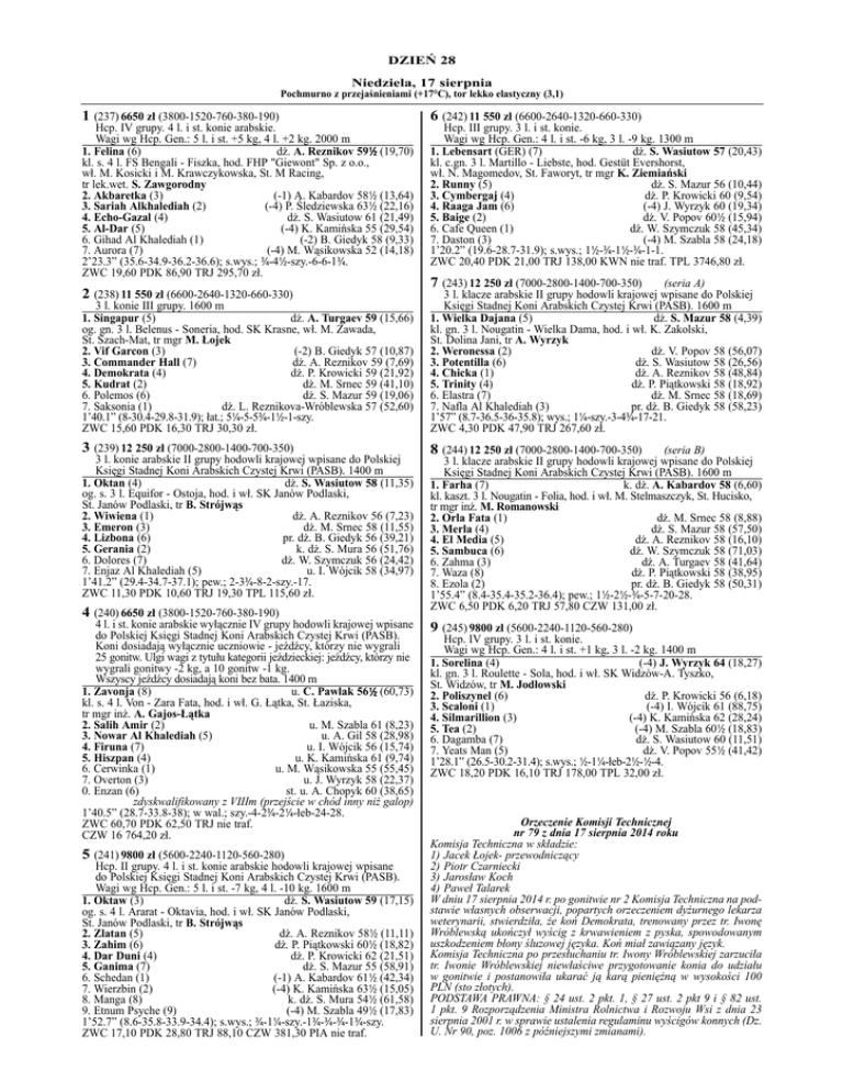 DZIEŃ 28 Niedziela, 17 sierpnia Pochmurno z przejaśnieniami (+17°C), tor lekko elastyczny (3,1) 1 (237) 6650 zł (3800-1520-760-380-190) Hcp. IV grupy. 4 l. i st. konie arabskie. Wagi wg Hcp. Gen.: 5 l. i st. +5 kg, 4 l. +2 kg. 2000 m 1. Felina (6) dż. A. Reznikov 59½ (19,70) kl. s. 4 l. FS Bengali - Fiszka, hod. FHP "Giewont" Sp. z o.o., wł. M. Kosicki i M. Krawczykowska, St. M Racing, tr lek.wet. S. Zawgorodny 2. Akbaretka (3) (-1) A. Kabardov 58½ (13,64) 3. Sariah Alkhalediah (2) (-4) P. Śledziewska 63½ (22,16) 4. Echo-Gazal (4) dż. S. Wasiutow 61 (21,49) 5. Al-Dar (5) (-4) K. Kamińska 55 (29,54) 6. Gihad Al Khalediah (1) (-2) B. Giedyk 58 (9,33) 7. Aurora (7) (-4) M. Wąsikowska 52 (14,18) 2’23.3” (35.6-34.9-36.2-36.6); s.wys.; ¾-4½-szy.-6-6-1¾. ZWC 19,60 PDK 86,90 TRJ 295,70 zł. 6 (242) 11 550 zł (6600-2640-1320-660-330) Hcp. III grupy. 3 l. i st. konie. Wagi wg Hcp. Gen.: 4 l. i st. -6 kg, 3 l. -9 kg. 1300 m 1. Lebensart (GER) (7) dż. S. Wasiutow 57 (20,43) kl. c.gn. 3 l. Martillo - Liebste, hod. Gestüt Evershorst, wł. N. Magomedov, St. Faworyt, tr mgr K. Ziemiański 2. Runny (5) dż. S. Mazur 56 (10,44) 3. Cymbergaj (4) dż. P. Krowicki 60 (9,54) 4. Raaga Jam (6) (-4) J. Wyrzyk 60 (19,34) 5. Baige (2) dż. V. Popov 60½ (15,94) 6. Cafe Queen (1) dż. W. Szymczuk 58 (45,34) 7. Daston (3) (-4) M. Szabla 58 (24,18) 1’20.2” (19.6-28.7-31.9); s.wys.; 1½-¾-1½-¾-1-1. ZWC 20,40 PDK 21,00 TRJ 138,00 KWN nie traf. TPL 3746,80 zł. 7 (243) 12 250 zł (7000-2800-1400-700-350) 3 l. konie III grupy. 1600 m 1. Singapur (5) dż. A. Turgaev 59 (15,66) og. gn. 3 l. Belenus - Soneria, hod. SK Krasne, wł. M. Zawada, St. Szach-Mat, tr mgr M. Łojek 2. Vif Garcon (3) (-2) B. Giedyk 57 (10,87) 3. Commander Hall (7) dż. A. Reznikov 59 (7,69) 4. Demokrata (4) dż. P. Krowicki 59 (21,92) 5. Kudrat (2) dż. M. Srnec 59 (41,10) 6. Polemos (6) dż. S. Mazur 59 (19,06) 7. Saksonia (1) dż. L. Reznikova-Wróblewska 57 (52,60) 1’40.1” (8-30.4-29.8-31.9); łat.; 5¼-5-5¾-1½-1-szy. ZWC 15,60 PDK 16,30 TRJ 30,30 zł. (seria A) 3 l. klacze arabskie II grupy hodowli krajowej wpisane do Polskiej Księgi Stadnej Koni Arabskich Czystej Krwi (PASB). 1600 m 1. Wielka Dajana (5) dż. S. Mazur 58 (4,39) kl. gn. 3 l. Nougatin - Wielka Dama, hod. i wł. K. Zakolski, St. Dolina Jani, tr A. Wyrzyk 2. Weronessa (2) dż. V. Popov 58 (56,07) 3. Potentilla (6) dż. S. Wasiutow 58 (26,56) 4. Chicka (1) dż. A. Reznikov 58 (48,84) 5. Trinity (4) dż. P. Piątkowski 58 (18,92) 6. Elastra (7) dż. M. Srnec 58 (18,69) 7. Nafla Al Khalediah (3) pr. dż. B. Giedyk 58 (58,23) 1’57” (8.7-36.5-36-35.8); wys.; 1¼-szy.-3-4¾-17-21. ZWC 4,30 PDK 47,90 TRJ 267,60 zł. 3 (239) 12 250 zł (7000-2800-1400-700-350) 8 (244) 12 250 zł (7000-2800-1400-700-350) 2 (238) 11 550 zł (6600-2640-1320-660-330) 3 l. konie arabskie II grupy hodowli krajowej wpisane do Polskiej Księgi Stadnej Koni Arabskich Czystej Krwi (PASB). 1400 m 1. Oktan (4) dż. S. Wasiutow 58 (11,35) og. s. 3 l. Equifor - Ostoja, hod. i wł. SK Janów Podlaski, St. Janów Podlaski, tr B. Strójwąs 2. Wiwiena (1) dż. A. Reznikov 56 (7,23) 3. Emeron (3) dż. M. Srnec 58 (11,55) 4. Lizbona (6) pr. dż. B. Giedyk 56 (39,21) 5. Gerania (2) k. dż. S. Mura 56 (51,76) 6. Dolores (7) dż. W. Szymczuk 56 (24,42) 7. Enjaz Al Khalediah (5) u. I. Wójcik 58 (34,97) 1’41.2” (29.4-34.7-37.1); pew.; 2-3¾-8-2-szy.-17. ZWC 11,30 PDK 10,60 TRJ 19,30 TPL 115,60 zł. 4 (240) 6650 zł (3800-1520-760-380-190) 4 l. i st. konie arabskie wyłącznie IV grupy hodowli krajowej wpisane do Polskiej Księgi Stadnej Koni Arabskich Czystej Krwi (PASB). Koni dosiadają wyłącznie uczniowie - jeźdźcy, którzy nie wygrali 25 gonitw. Ulgi wagi z tytułu kategorii jeździeckiej: jeźdźcy, którzy nie wygrali gonitwy -2 kg, a 10 gonitw -1 kg. Wszyscy jeźdźcy dosiadają koni bez bata. 1400 m 1. Zavonja (8) u. C. Pawlak 56½ (60,73) kl. s. 4 l. Von - Zara Fata, hod. i wł. G. Łątka, St. Łaziska, tr mgr inż. A. Gajos-Łątka 2. Salih Amir (2) u. M. Szabla 61 (8,23) 3. Nowar Al Khalediah (5) u. A. Gil 58 (28,98) 4. Firuna (7) u. I. Wójcik 56 (15,74) 5. Hiszpan (4) u. K. Kamińska 61 (9,74) 6. Cerwinka (1) u. M. Wąsikowska 55 (55,45) 7. Overton (3) u. J. Wyrzyk 58 (22,37) 0. Enzan (6) st. u. A. Chopyk 60 (38,65) zdyskwalifikowany z VIIIm (przejście w chód inny niż galop) 1’40.5” (28.7-33.8-38); w wal.; szy.-4-2¾-2¼-łeb-24-28. ZWC 60,70 PDK 62,50 TRJ nie traf. CZW 16 764,20 zł. 5 (241) 9800 zł (5600-2240-1120-560-280) Hcp. II grupy. 4 l. i st. konie arabskie hodowli krajowej wpisane do Polskiej Księgi Stadnej Koni Arabskich Czystej Krwi (PASB). Wagi wg Hcp. Gen.: 5 l. i st. -7 kg, 4 l. -10 kg. 1600 m 1. Oktaw (3) dż. S. Wasiutow 59 (17,15) og. s. 4 l. Ararat - Oktavia, hod. i wł. SK Janów Podlaski, St. Janów Podlaski, tr B. Strójwąs 2. Zlatan (5) dż. A. Reznikov 58½ (11,11) 3. Zahim (6) dż. P. Piątkowski 60½ (18,82) 4. Dar Duni (4) dż. P. Krowicki 62 (21,51) 5. Ganima (7) dż. S. Mazur 55 (58,91) 6. Schedan (1) (-1) A. Kabardov 61½ (42,34) 7. Wierzbin (2) (-4) K. Kamińska 63½ (15,05) 8. Manga (8) k. dż. S. Mura 54½ (61,58) 9. Etnum Psyche (9) (-4) M. Szabla 49½ (17,83) 1’52.7” (8.6-35.8-33.9-34.4); s.wys.; ¾-1¼-szy.-1¾-¾-¾-1¾-szy. ZWC 17,10 PDK 28,80 TRJ 88,10 CZW 381,30 PIA nie traf. (seria B) 3 l. klacze arabskie II grupy hodowli krajowej wpisane do Polskiej Księgi Stadnej Koni Arabskich Czystej Krwi (PASB). 1600 m 1. Farha (7) k. dż. A. Kabardov 58 (6,60) kl. kaszt. 3 l. Nougatin - Folia, hod. i wł. M. Stelmaszczyk, St. Hucisko, tr mgr inż. M. Romanowski 2. Orla Fata (1) dż. M. Srnec 58 (8,88) 3. Merla (4) dż. S. Mazur 58 (57,50) 4. El Media (5) dż. A. Reznikov 58 (16,10) 5. Sambuca (6) dż. W. Szymczuk 58 (71,03) 6. Zahma (3) dż. A. Turgaev 58 (41,64) 7. Waza (8) dż. P. Piątkowski 58 (38,95) 8. Ezola (2) pr. dż. B. Giedyk 58 (50,31) 1’55.4” (8.4-35.4-35.2-36.4); pew.; 1½-2½-¾-5-7-20-28. ZWC 6,50 PDK 6,20 