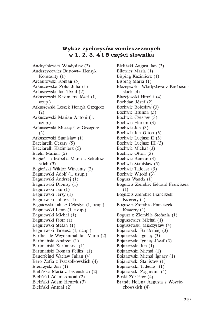 Wykaz ºyciorysów zamieszczonych w 1, 2, 3, 4 i 5 czæ¥ci sÆownika Andrychiewicz W³adys³aw (3) Andrzeykowicz Buttowt– Henryk Konstanty (1) Archutowski Roman (5) Arkuszewska Zofia Julia (1) Arkuszewski Jan Teofil (2) Arkuszewski Kazimierz Józef (1, uzup.) Arkuszewski Leszek Henryk Grzegorz (2) Arkuszewski Marian Antoni (1, uzup.) Arkuszewski Mieczys³aw Grzegorz (2) Arkuszewski Stanis³aw (1) Bacciarelli Cezary (5) Bacciarelli Kazimierz (5) Baehr Marian (2) Bagieñska Izabella Maria z Soko³owskich (3) Bagieñski Wiktor Wincenty (2) Bagniewski Adolf (1, uzup.) Bagniewski Andrzej (1) Bagniewski Dionizy (1) Bagniewski Jan (1) Bagniewski Jerzy (1) Bagniewski Juliusz (1) Bagniewski Juliusz Celestyn (1, uzup.) Bagniewski Leon (1, uzup.) Bagniewski Micha³ (1) Bagniewski Piotr (1) Bagniewski Stefan (1) Bagniewski Tadeusz (1, uzup.) Barthel de Weydenthal Jan Maria (2) Bartmañski Andrzej (1) Bartmañski Kazimierz (1) Bartmañski Roman Feliks (1) Bauerfeind Wac³aw Julian (4) Bero Zofia z Pszczó³kowskich (4) Biedrzycki Jan (1) Bieliñska Maria z Jasieñskich (2) Bieliñski Adam Antoni (2) Bieliñski Adam Henryk (3) Bieliñski Antoni (2) Bieliñski August Jan (2) Bilowicz Maria (1) Bisping Kazimierz (1) Bisping Maria (1) B³a¿ejewska W³adys³awa z Kie³basiñskich (4) B³a¿ejewski Hipolit (4) Bochdan Józef (2) Bochwic Boles³aw (3) Bochwic Brunon (3) Bochwic Czes³aw (3) Bochwic Florian (3) Bochwic Jan (3) Bochwic Jan Otton (3) Bochwic Lucjusz II (3) Bochwic Lucjusz III (3) Bochwic Micha³ (3) Bochwic Otton (3) Bochwic Roman (3) Bochwic Stanis³aw (3) Bochwic Tadeusz (3) Bochwic Witold (3) Bogusz Wanda (1) Bogusz z Ziemblic Edward Franciszek (1) Bogusz z Ziemblic Franciszek Ksawery (1) Bogusz z Ziemblic Franciszek Ksawery (1) Bogusz z Ziemblic Stefania (1) Boguszewicz Micha³ (1) Boguszewski Mieczys³aw (4) Bojanowski Bart³omiej (3) Bojanowski Ignacy (3) Bojanowski Ignacy Józef (3) Bojanowski Jan (1) Bojanowski Micha³ (1) Bojanowski Micha³ Ignacy (1) Bojanowski Stanis³aw (1) Bojanowski Tadeusz (1) Bojanowski Zygmunt (1) Boski Zdzis³aw (4) Brandt Helena Augusta z Woyciechowskich (4) 219 Breza Edward Fryderyk August Maria Leon (1, uzup.) Brzeski Adolf (1, uzup.) Brzeski Edward (1) Brzeski Erazm (1) Brzeski Erazm (2) Brzeski Henryk (1, uzup.) Brzeski Jan (1) Brzeski Julian (2) Brzeski Leon (1, uzup.) Brzeski Witold Henryk (1, uzup.) Brzozowski W³adys³aw Hubert (4) Brzozowski Witold (4) Budzyñski Wiktor (2) Bukowiecka Aleksandra z Dzier¿ykraj–Morawskich (4) Bukowiecki Leon (4) Bukowiecki Mieczys³aw (4) Bukowiñski Stanis³aw (4) Bukowski Jan Nepomucen (1) Bukowski Jan Rafa³ (1) Bukowski Karol (1) Bukowski Tadeusz (1) Chabowski Leon (4) Chabowski W³adys³aw (4) Chabowski Wincenty (4) Chamski Kazimierz (5) Ch³apowska Anna (1) Ch¹dzyñski Stanis³aw (4) Ch¹dzyñski W³odzimierz (4) Che³chowski Stanis³aw (1) Che³kowski Józef (2) Che³kowski Marian (2) Che³kowski Micha³ (2) Che³kowski Wojciech (2) Chlipalski Henryk W³adys³aw (5) Ch³apowska Bronis³awa (1) Ch³apowska Teofila (1) Ch³apowski Alfred Stefan Franciszek (2) Ch³apowski Dezydery Andrzej (1) Ch³apowski Henryk Stanis³aw (1) Ch³apowski Jan Wac³aw (1) Ch³apowski Karol Pawe³ (2) Ch³apowski Konstanty Hubert (2) Ch³apowski Maurycy (1) Ch³apowski Mieczys³aw Pawe³ (2) Ch³apowski Mieczys³aw Pius (1, uzup.) Ch³apowski Stanis³aw Jan (1) Ch³apowski Stanis³aw Ludwik (1) 220 Ch³apowski Zygmunt Antoni Franciszek (2) Ch³apowski Zygmunt Lucjan (1) Chmielewski Czes³aw (1, uzup.) Chrostowski Aleksander (4) Cichowski Henryk (2) Cichowski Henryk (2) Cichowski Mieczys³aw (2) Cichowski Roman Marian (4) Cichowski Seweryn (2) Cichowski Zygmunt (2) Cichowski Zygmunt Gustaw (3) Cieñski Stanis³aw Franciszek (5) Cieñski Tadeusz (5) Cieœliñski Zygmunt Walenty (3) Cieszkowski Józef (4) Ciszewski Miros³aw W³odzimierz Epifaniusz (1) Cygañski Ignacy (3) Cywiñski Andrzej (1) Cywiñski Stanis³aw (1) Cywiñski Stanis³aw (1) Czaplicki Antoni (3) Czaplicki Lucjan (3) Czaplicki Tadeusz (3) Czarnocki Kazimierz (1) Czarnocki Stefan (1) Czarnowski Feliks (4) Czarnowski Franciszek (4) Czarnowski Teodor (4) Czermiñski Stefan (4) Czerwiñska Maria z Grocholskich (2) Czerwiñski Antoni (5) Czerwiñski Julian Marian Kazimierz (3) Czerwiñski Kazimierz Aleksander (2) Czerwiñski Kazimierz Ignacy (2) Czerwiñski Stanis³aw (2) Czerwiñski Zygmunt Julian (2) Daszewska Anna z Pop³awskich (3) Daszewska Zofia z Pop³awskich (3) Daszewski Aleksander Józef (2) Daszewski Andrzej (2) Daszkiewicz Korybut– Dymitr (5) Daszkiewicz Korybut– Dymitr Andrzej (5) Daszkiewicz Korybut– Juliusz (5) Daszkiewicz Korybut– Tadeusz (5) D¹browska Janina Maria z Wieniawskich (4) D¹browski Wac³aw (4) D¹mbska Antonina Maria Zenobia z ¯ychliñskich (3) D¹mbski Adolf Cyryl Antoni (3) D¹mbski Lucjan (5) D¹mbski Stanis³aw (3) D¹mbski Stefan (3) Dembiñski (vel Dêbiñski) Stanis³aw (3) Descours Wojciech (3) Deskur Andrzej (2) Dêbski Mieczys³aw (5) Dmochowski Jerzy (5) Dobiecki Artur Stanis³aw Ludwik Antoni (3) Dolañski Henryk (3) Dolañski Seweryn (3) Domañska Teresa z Jeleñskich (3) Domañski Zygmunt (1) Doboszyñski Ireneusz (5) Donimirski Edward (4) Doruchowski Adam (2) Doruchowski Feliks (2) Doruchowski Jerzy Feliks (2) Doruchowski Tadeusz (2) Doruchowski Teodor (2) Döry Jabbahaza Helena (1) Dowgia³³o Karol Marian (5) Dowojno Tadeusz (3) Drucki–Lubecki Aleksander (3) Drucki–Lubecki Bogdan Marian (3) Drucki–Lubecki Hieronim (3) Drucki–Lubecki Jan Maria (3) Drucki–Lubecki Ksawery (3) Dunin–Borkowski Henryk (3) Dunin ze Skrzynna Józef Stanis³aw Ludwik (2) Dworakowski Tadeusz (2) Dziedzicki Adam Józef (4) Dziedzicki Tadeusz Henryk (4) Dzierzbicka Maria z Pop³awskich (3) Dziewanowski Ignacy Kazimierz (1) Dziewanowski Micha³ (3) Dziewanowski Stanis³aw (1) Dziewanowski Tadeusz (1) Ekalt Teofil (5) Ekiert Krystyna z Niecieckich (3) Erdman Karol (3) Erdmanowa Maria z Jeleñskich (3) Fangor Stanis³aw (4) Fangor