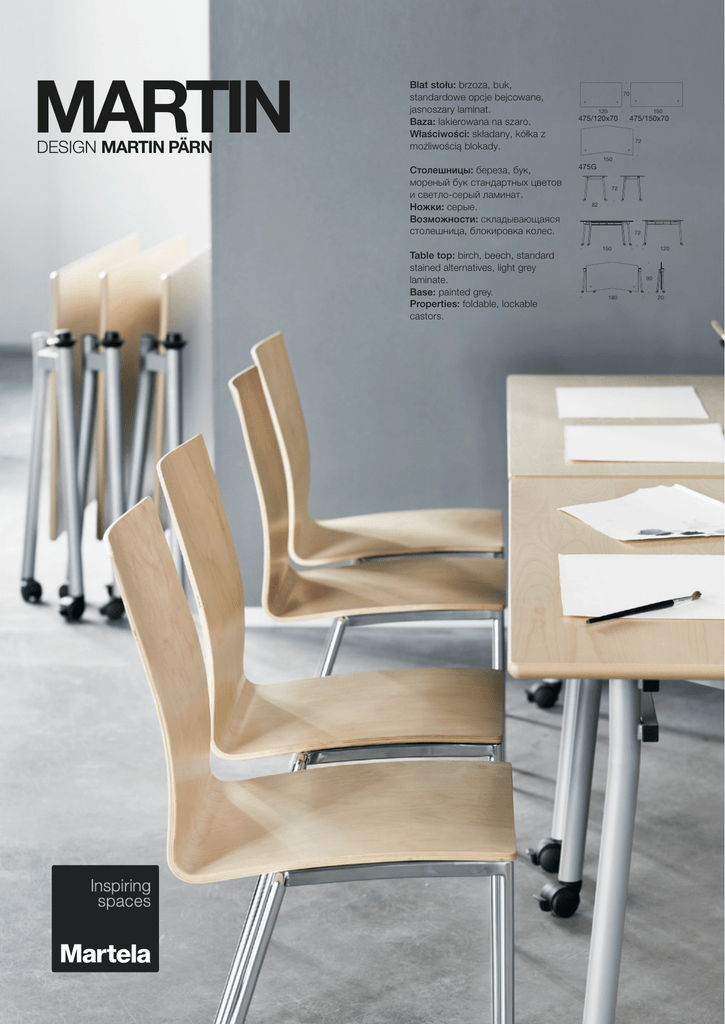 MARTIN DESIGN MARTIN PÄRN Blat stołu: brzoza, buk, standardowe opcje bejcowane, jasnoszary laminat. Baza: lakierowana na szaro. Właściwości: składany, kółka z możliwością blokady. Столешницы: береза, бук, мореный бук стандартных цветов и светло-серый ламинат. Ножки: серые. Возможности: складывающаяся столешница, блокировка колес. Table top: birch, beech, standard stained alternatives, light grey laminate. Base: painted grey. Properties: foldable, lockable castors. 70 120 475/120x70 150 475/150x70 72 475G 150 72 82 72 120 150 90 180 20