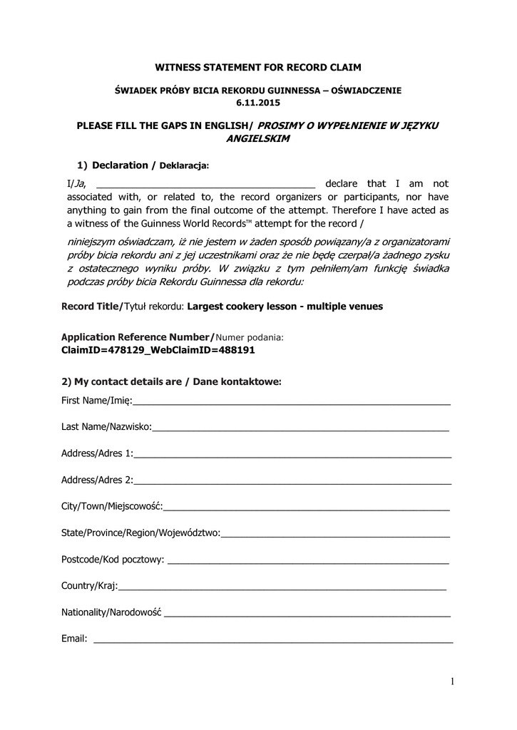 WITNESS STATEMENT FOR RECORD CLAIM ŚWIADEK PRÓBY BICIA REKORDU GUINNESSA – OŚWIADCZENIE 6.11.2015 PLEASE FILL THE GAPS IN ENGLISH/ PROSIMY O WYPEŁNIENIE W JĘZYKU ANGIELSKIM 1) Declaration / Deklaracja: I/Ja, __________________________________________ declare that I am not associated with, or related to, the record organizers or participants, nor have anything to gain from the final outcome of the attempt. Therefore I have acted as a witness of the Guinness World Records™ attempt for the record / niniejszym oświadczam, iż nie jestem w żaden sposób powiązany/a z organizatorami próby bicia rekordu ani z jej uczestnikami oraz że nie będę czerpał/a żadnego zysku z ostatecznego wyniku próby. W związku z tym pełniłem/am funkcję świadka podczas próby bicia Rekordu Guinnessa dla rekordu: Record Title/Tytuł rekordu: Largest cookery lesson - multiple venues Application Reference Number/Numer podania: ClaimID=478129_WebClaimID=488191 2) My contact details are / Dane kontaktowe: First Name/Imię:_____________________________________________________________ Last Name/Nazwisko:_________________________________________________________ Address/Adres 1:_____________________________________________________________ Address/Adres 2:_____________________________________________________________ City/Town/Miejscowość:_______________________________________________________ State/Province/Region/Województwo:____________________________________________ Postcode/Kod pocztowy: ______________________________________________________ Country/Kraj:_______________________________________________________________ Nationality/Narodowość _______________________________________________________ Email: _____________________________________________________________________ 1 Telephone/Numer telefonu: ____________________________________________________ Organisation/Firma: __________________________________________________________ Included business card/Załączam wizytówkę Yes/Tak No/Nie (Place your business card here) 3) What did you see / measure / evaluate as a witness? Co Pan/Pani widział(a) / mierzył (a) / oceniał(a) jako świadek? 2 4) My field of expertise is… (Reason for witnessing the record attempt) Posiadam doświadczenie w dziedzinie… (Proszę podać to jako powód uczestnictwa w próbie np. urzędnik w gminie – związany z lokalną społecznością; dietetyk – profesjonalna wiedza o odżywianiu) 5) Final measurement / Ostateczny wynik pomiaru – liczba uczestników: 6) Where did the record attempt take place? / Gdzie odbyła się próba bicia rekordu? Venue/Lokalizacja (nazwa placówki): ___________________________________________________________________________ City/Miejscowość:_____________________________________________________________ Country/Kraj: _______________________________________________________________ 7) When were you present at the record attempt? (include dates and times) Kiedy był(a) Pan(i) obecny(a) podczas próby bicia rekordu? (Dokładna data, czas rozpoczęcia i zakończenia próby z dokładnością do 0,01 s.) 8) This witness statement was completed by / Wniosek świadka został wypełniony przez:……………………………………………. I am willing to be contacted by Guinness World Records to discuss any details regarding this record claim / Zgadzam się, aby Księga Rekordów Guinnessa kontaktowała się ze mną w celu omówienia szczegółów tego zgłoszenia. Print name OR sign/Podpis: _____________________________________________________________________ Date/Data: _____________________________________________________________________ (dd/mm/yyyy)/ (dzień/miesiąc/rok) 3
