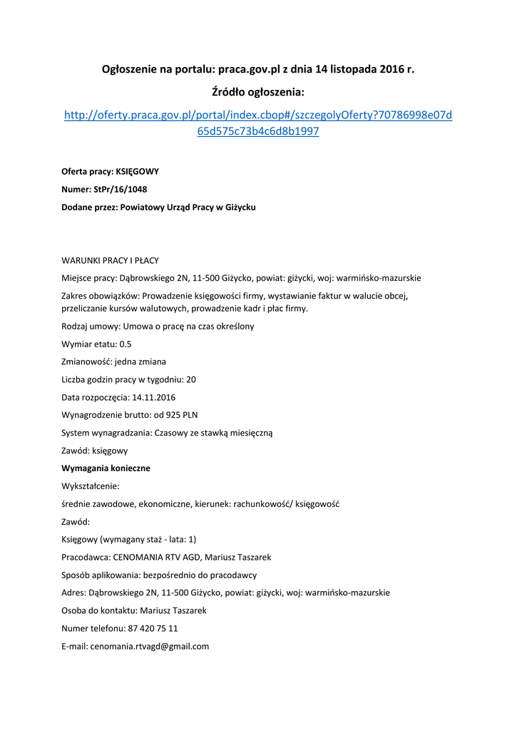 Ogłoszenie na portalu: praca.gov.pl z dnia 14 listopada 2016 r. Źródło ogłoszenia: http://oferty.praca.gov.pl/portal/index.cbop#/szczegolyOferty?70786998e07d 65d575c73b4c6d8b1997 Oferta pracy: KSIĘGOWY Numer: StPr/16/1048 Dodane przez: Powiatowy Urząd Pracy w Giżycku WARUNKI PRACY I PŁACY Miejsce pracy: Dąbrowskiego 2N, 11-500 Giżycko, powiat: giżycki, woj: warmińsko-mazurskie Zakres obowiązków: Prowadzenie księgowości firmy, wystawianie faktur w walucie obcej, przeliczanie kursów walutowych, prowadzenie kadr i płac firmy. Rodzaj umowy: Umowa o pracę na czas określony Wymiar etatu: 0.5 Zmianowość: jedna zmiana Liczba godzin pracy w tygodniu: 20 Data rozpoczęcia: 14.11.2016 Wynagrodzenie brutto: od 925 PLN System wynagradzania: Czasowy ze stawką miesięczną Zawód: księgowy Wymagania konieczne Wykształcenie: średnie zawodowe, ekonomiczne, kierunek: rachunkowość/ księgowość Zawód: Księgowy (wymagany staż - lata: 1) Pracodawca: CENOMANIA RTV AGD, Mariusz Taszarek Sposób aplikowania: bezpośrednio do pracodawcy Adres: Dąbrowskiego 2N, 11-500 Giżycko, powiat: giżycki, woj: warmińsko-mazurskie Osoba do kontaktu: Mariusz Taszarek Numer telefonu: 87 420 75 11 E-mail: [email protected]