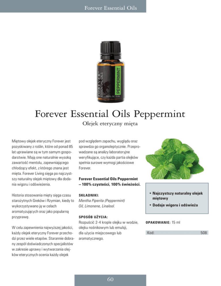 Forever Essential Oils Forever Essential Oils Peppermint Olejek eteryczny mi´ta Mi´towy olejek eteryczny Forever jest pozyskiwany z roÊlin, które od ponad 85 lat uprawiane sà w tym samym gospodarstwie. Majà one naturalnie wysokà zawartoÊç mentolu, zapewniajàcego chłodzàcy efekt, z którego znana jest mi´ta. Forever Living si´ga po najczystszy naturalny olejek mi´towy dla dodania wigoru i odÊwie˝enia. pod wzgl´dem zapachu, wyglàdu oraz sprawdza go organoleptycznie. Przeprowadzane sà analizy laboratoryjne weryfikujàce, czy ka˝da partia olejków spełnia surowe wymogi jakoÊciowe Forever. Historia stosowania mi´ty si´ga czasu staro˝ytnych Greków i Rzymian, kiedy to wykorzystywano jà w celach aromatyzujàcych oraz jako popularnà przypraw´. SKŁADNIKI: W celu zapewnienia najwy˝szej jakoÊci, ka˝dy olejek eteryczny Forever przechodzi przez wiele etapów. Starannie dobrany zespół doÊwiadczonych specjalistów w zakresie uprawy i wytwarzania olejków eterycznych ocenia ka˝dy olejek Forever Essential Oils Peppermint – 100% czystoÊci, 100% Êwie˝oÊci. Mentha Piperita (Peppermint) Oil, Limonene, Linalool. • Najczystszy naturalny olejek mi´towy • Dodaje wigoru i odÊwie˝a SPOSÓB U˚YCIA: RozpuÊciç 2-4 krople olejku w wodzie, olejku noÊnikowym lub emulsji, dla u˝ycia miejscowego lub aromatycznego. 60 OPAKOWANIE: 15 ml Kod: 508