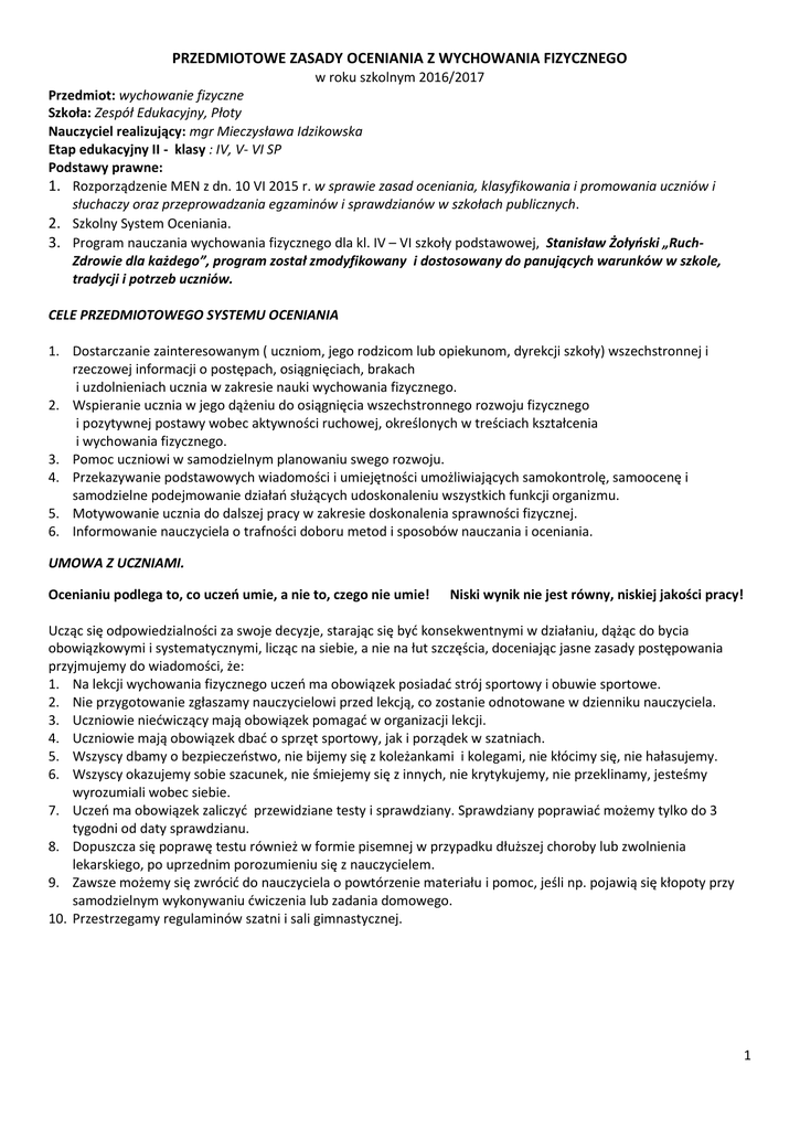 PRZEDMIOTOWE ZASADY OCENIANIA Z WYCHOWANIA FIZYCZNEGO w roku szkolnym 2016/2017 Przedmiot: wychowanie fizyczne Szkoła: Zespół Edukacyjny, Płoty Nauczyciel realizujący: mgr Mieczysława Idzikowska Etap edukacyjny II - klasy : IV, V- VI SP Podstawy prawne: 1. Rozporządzenie MEN z dn. 10 VI 2015 r. w sprawie zasad oceniania, klasyfikowania i promowania uczniów i słuchaczy oraz przeprowadzania egzaminów i sprawdzianów w szkołach publicznych. 2. Szkolny System Oceniania. 3. Program nauczania wychowania fizycznego dla kl. IV – VI szkoły podstawowej, Stanisław Żołyński „RuchZdrowie dla każdego”, program został zmodyfikowany i dostosowany do panujących warunków w szkole, tradycji i potrzeb uczniów. CELE PRZEDMIOTOWEGO SYSTEMU OCENIANIA 1. Dostarczanie zainteresowanym ( uczniom, jego rodzicom lub opiekunom, dyrekcji szkoły) wszechstronnej i rzeczowej informacji o postępach, osiągnięciach, brakach i uzdolnieniach ucznia w zakresie nauki wychowania fizycznego. 2. Wspieranie ucznia w jego dążeniu do osiągnięcia wszechstronnego rozwoju fizycznego i pozytywnej postawy wobec aktywności ruchowej, określonych w treściach kształcenia i wychowania fizycznego. 3. Pomoc uczniowi w samodzielnym planowaniu swego rozwoju. 4. Przekazywanie podstawowych wiadomości i umiejętności umożliwiających samokontrolę, samoocenę i samodzielne podejmowanie działań służących udoskonaleniu wszystkich funkcji organizmu. 5. Motywowanie ucznia do dalszej pracy w zakresie doskonalenia sprawności fizycznej. 6. Informowanie nauczyciela o trafności doboru metod i sposobów nauczania i oceniania. UMOWA Z UCZNIAMI. Ocenianiu podlega to, co uczeń umie, a nie to, czego nie umie! Niski wynik nie jest równy, niskiej jakości pracy! Ucząc się odpowiedzialności za swoje decyzje, starając się być konsekwentnymi w działaniu, dążąc do bycia obowiązkowymi i systematycznymi, licząc na siebie, a nie na łut szczęścia, doceniając jasne zasady postępowania przyjmujemy do wiadomości, że: 1. Na lekcji wychowania fizycznego uczeń ma obowiązek posiadać strój sportowy i obuwie sportowe. 2. Nie przygotowanie zgłaszamy nauczycielowi przed lekcją, co zostanie odnotowane w dzienniku nauczyciela. 3. Uczniowie niećwiczący mają obowiązek pomagać w organizacji lekcji. 4. Uczniowie mają obowiązek dbać o sprzęt sportowy, jak i porządek w szatniach. 5. Wszyscy dbamy o bezpieczeństwo, nie bijemy się z koleżankami i kolegami, nie kłócimy się, nie hałasujemy. 6. Wszyscy okazujemy sobie szacunek, nie śmiejemy się z innych, nie krytykujemy, nie przeklinamy, jesteśmy wyrozumiali wobec siebie. 7. Uczeń ma obowiązek zaliczyć przewidziane testy i sprawdziany. Sprawdziany poprawiać możemy tylko do 3 tygodni od daty sprawdzianu. 8. Dopuszcza się poprawę testu również w formie pisemnej w przypadku dłuższej choroby lub zwolnienia lekarskiego, po uprzednim porozumieniu się z nauczycielem. 9. Zawsze możemy się zwrócić do nauczyciela o powtórzenie materiału i pomoc, jeśli np. pojawią się kłopoty przy samodzielnym wykonywaniu ćwiczenia lub zadania domowego. 10. Przestrzegamy regulaminów szatni i sali gimnastycznej. 1 OBSZAR OCENIANIA I PRZEDMIOT OCENY Obszar oceniania Postawa Ucznia i aktywność na zajęciach wf Wiadomości z zakresu edukacji fizycznej Przedmiot oceny aktywność i zaangażowanie, przygotowanie do zajęć (odpowiedni strój), zachowanie podczas zajęć, aktywny udział w obowiązkowych zajęciach, współpraca z innymi uczniami, przestrzeganie ustalonych zasad i regulaminów, udział w zajęciach pozalekcyjnych, pozaszkolnych i zawodach sportowych, znajomość podstawowych zasad sędziowania, sędziowanie, znajomość zasad zdrowego stylu życia, bezpieczeństwa, asekuracji i samoasekuracji, znajomość zasad bezpieczeństwa, znajomość ćwiczeń związanych z utrzymaniem prawidłowej sylwetki, umiejętność diagnozowania własnej sprawności, podstawowe przepisy o ruchu drogowym, podstawowe wiadomości z olimpizmu, znajomość nazwisk zasłużonych polskich sportowców, postęp w opanowaniu umiejętności: utylitarnych, rekreacyjnych i sportowych, wymienionych w postawie programowej wychowania fizycznego na danym etapie kształcenia. umiejętności ruchowe, nazywane również techniką ruchu lub techniką sportową to ogólnie przyjęty sposób wykonania konkretnego zadania ruchowego stosowanego zarówno w sporcie i rekreacji ruchowej. sędziowanie podczas gier zespołowych i zabaw, współudział w przygotowaniu szkolnej gazetki, przygotowanie informacji sportowych, współudział w przygotowaniach szkolnych konkursów dotyczących sportu, pomoc w organizacji konkurencji sportowych, działania społeczne na rzecz wychowania fizycznego, reprezentowanie szkoły w zawodach sportowych, Poziom umiejętności ruchowych Społeczne zaangażowanie, wypełnianie funkcji organizacyjnych oraz prac na rzecz wychowania fizycznego Frekwencja na zajęciach wychowania fizycznego kontrola obecności w dzienniku nauczyciela z odnotowaniem podjęcia lub niepodjęcia ćwiczenia, ZASADY OCENIANIA: Wszystkie obszary oceniania eksponują wysiłek ucznia oraz uwzględniają zdefiniowane na podstawie programowej umiejętności i wiadomości; Przy ocenianiu ucznia z wychowania fizycznego na pierwszym miejscu brany jest pod uwagę wysiłek wkładany przez ucznia; Ocenę semestralną i roczną wystawia nauczyciel prowadzący, na podstawie ocen z przedmiotu (średnia arytmetyczna) Ocena klasyfikacyjna z wychowania fizycznego może być podniesiona o jeden stopień do góry za wysokie wyniki sportowe lub inne szczególne działania związane z aktywnością ruchową. W przypadku gdy uczeń uzyskuje szczególne osiągnięcia z zawodów sportowych poza szkolnych nauczyciel może wystawić ocenę celującą z aktywności . Uczeń ma prawo do poprawy oceny cząstkowej (do miesiąca od wystawienia oceny, a najpóźniej na tydzień przed wystawieniem oceny klasyfikacyjnej) w 