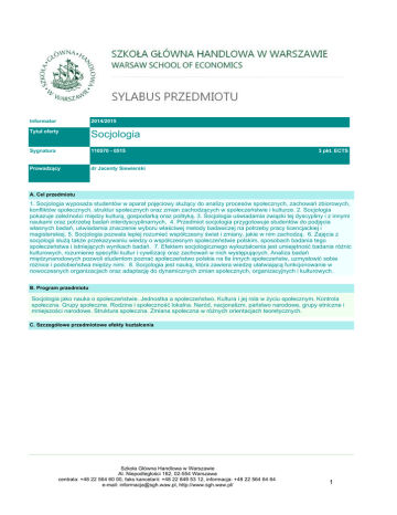 Informator 2014/2015 7\WXáRIHUW\ Socjologia Sygnatura 110570 - 0515 3URZDG]ąF\ dr Jacenty Siewierski 3 pkt. ECTS A. Cel przedmiotu 16RFMRORJLDZ\SRVDĪDVWXGHQWyZZDSDUDWSRMĊFLRZ\VáXĪąF\GRDQDOL]\SURFHVyZVSRáHF]Q\FK]DFKRZDĔ]ELRURZ\FK NRQIOLNWyZVSRáHF]Q\FKVWUXNWXUVSRáHF]Q\FKRUD]]PLDQ]DFKRG]ąF\FKZVSRáHF]HĔVWZLHLNXOWXU]H 2. Socjologia SRND]XMH]DOHĪQRĞFLPLĊG]\NXOWXUąJRVSRGDUNąRUD]SROLW\Ną 36RFMRORJLDXĞZLDGDPLD]ZLą]NLWHMG\VF\SOLQ\L]LQQ\PL QDXNDPLRUD]SRWU]HEĊEDGDĔLQWHUG\VF\SOLQDUQ\FK 43U]HGPLRWVRFMRORJLDSU]\JRWRZXMHVWXGHQWyZGRSRGMĊFLD ZáDVQ\FKEDGDĔXĞZLDGDPLD]QDF]HQLHZ\ERUXZáDĞFLZHMPHWRG\EDGDZF]HMQDSRWU]HE\SUDF\OLFHQFMDFNLHML magisterskiej. 56RFMRORJLDSR]ZDODOHSLHMUR]XPLHüZVSyáF]HVQ\ĞZLDWL]PLDQ\MDNLHZQLP]DFKRG]ą 6=DMĊFLD] VRFMRORJLLVáXĪąWDNĪHSU]HND]\ZDQLXZLHG]\RZVSyáF]HVQ\PVSRáHF]HĔVWZLHSROVNLPVSRVREDFKEDGDQLDWHJR VSRáHF]HĔVWZDLLVWQLHMąF\FKZ\QLNDFKEDGDĔ 7(IHNWHPVRFMRORJLF]QHJRZ\NV]WDáFHQLDMHVWXPLHMĊWQRĞüEDGDQLDUyĪQLF NXOWXURZ\FKUR]XPLHQLHVSHF\ILNLNXOWXULF\ZLOL]DFMLRUD]]DFKRZDĔZQLFKZ\VWĊSXMąF\FK$QDOL]DEDGDĔ PLĊG]\QDURGRZ\FKSR]ZROLVWXGHQWRPSR]QDüVSRáHF]HĔVWZRSROVNLHQDWOHLQQ\FKVSRáHF]HĔVWZX]P\VáRZLüVRELH UyĪQLFHLSRGRELHĔVWZDPLĊG]\QLPL 86RFMRORJLDMHVWQDXNąNWyUD]DZLHUDZLHG]ĊXáDWZLDMąFąIXQNFMRQRZDQLHZ QRZRF]HVQ\FKRUJDQL]DFMDFKRUD]DGDSWDFMĊGRG\QDPLF]Q\FK]PLDQVSRáHF]Q\FKRUJDQL]DF\MQ\FKLNXOWXURZ\FK B. Program przedmiotu 6RFMRORJLDMDNRQDXNDRVSRáHF]HĔVWZLH-HGQRVWNDDVSRáHF]HĔVWZR.XOWXUDLMHMURODZĪ\FLXVSRáHF]Q\P.RQWUROD VSRáHF]QD*UXS\VSRáHF]QH5RG]LQDLVSRáHF]QRĞüORNDOQD1DUyGQDFMRQDOL]PSDĔVWZRQDURGRZHJUXS\HWQLF]QHL PQLHMV]RĞFLQDURGRZH6WUXNWXUDVSRáHF]QD=PLDQDVSRáHF]QDZUyĪQ\FKRULHQWDFMDFKWHRUHW\F]Q\FK &6]F]HJyáRZHSU]HGPLRWRZHHIHNW\NV]WDáFHQLD 6]NRáD*áyZQD+DQGORZDZ:DUV]DZLH $O1LHSRGOHJáRĞFL162, 02-554 Warszawa centrala: +48 22 564 60 00, faks kancelarii: +48 22 849 53 12, informacja: +48 22 564 64 64 e-mail: [email protected], http://www.sgh.waw.pl/ 1 c.d.Socjologia Wiedza 16RFMRORJLDZ\SRVDĪDZSRMĊFLDLZLHG]ĊWHRUHW\F]QąQLH]EĊGQąGRDQDOL]\VWRVXQNyZ VSRáHF]Q\FKSURFHVyZL]PLDQVSRáHF]Q\FK 2. Socjologia poszerza horyzonty poznawcze. 36RFMRORJLDZ\MDĞQLD]MDZLVNDLSURFHV\VSRáHF]QH 43RND]XMHUROĊNXOWXU\ZĪ\FLXVSRáHF]Q\PJRVSRGDUF]\PLSROLW\F]Q\P 5'RVWDUF]DLQIRUPDFMLRPHWRGDFKEDGDĔVSRáHF]Q\FKLZ\QLNDFKEDGDĔ 8PLHMĊWQRĞFL Kompetencje VSRáHF]QH 1.RMDU]HQLHIDNWyZVSRáHF]Q\FKUR]SR]QDZDQLHPHFKDQL]PyZL]DVDGIXQNFMRQRZDQLD organizacji. 2=ZLĊNV]HQLHNRPSHWHQFMLGRNLHURZDQLD]HVSRáDPLOXG]NLPL 3:\NRU]\VWDQLDZLHG]\RVSRáHF]HĔVWZLH]PLDQDFKZVWUXNWXU]HVSRáHF]QHMNXOWXU]H SUHIHUHQFMDFKVSRáHF]Q\FKZPDUNHWLQJXSROLW\FHJRVSRGDUF]HMLVSROHF]QHM 48áDWZLHQLHDGDSWDFMLGR]PLDQLZ\]ZDĔMDNLHZLąĪąVLĊNRQVHNZHQFMDPLUR]ZRMXQDXNLL WHFKQLNLPLJUDFMDPLZLHORNXOWXURZRĞFLąLJOREDOL]DFMą 16RFMRORJLDZ]ERJDFDNRPSHWHQFMHZ]DNUHVLHLQWHUSUHWDFML]MDZLVNLSURFHVyZVSRáHF]Q\FK XPRĪOLZLDG\VWDQVGRU]HF]\ZLVWRĞFLNWyU\MHVWZDUXQNLHPRGQDMG\ZDQLDU]HF]\ZLVW\FK SU]\F]\Q]MDZLVNLSUREOHPyZVSRáHF]QRJRVSRGDUF]\FKLSROLW\F]Q\FK 2:LHG]DRPHWRGDFKEDGDĔVSRáHF]Q\FKJZDUDQWXMHNRPSHWHQFMHQLH]EĊGQHSU]\EXGRZDQLX QDU]ĊG]LEDGDZF]\FKGRUR]SR]QDQLDMDNLHJRĞSUREOHPXQS]PLDQZĞZLDGRPRĞFLVSRáHF]QHM SUHIHUHQFMLSROLW\F]Q\FKV\VWHPXZDUWRĞFLLWG 6]NRáD*áyZQD+DQGORZDZ:DUV]DZLH $O1LHSRGOHJáRĞFL162, 02-554 Warszawa centrala: +48 22 564 60 00, faks kancelarii: +48 22 849 53 12, informacja: +48 22 564 64 64 e-mail: [email protected], http://www.sgh.waw.pl/ 2 c.d.Socjologia '6HPHVWUDOQ\SODQ]DMĊü 1 3U]HGPLRWVRFMRORJLL*áyZQHRULHQWDFMHWHRUHW\F]QRPHWRGRORJLF]QH)XQNFMHDSOLNDF\MQH wiedzy socjologicznej. 2 %DGDQLDVSRáHF]QHZSUDNW\FH0HWRG\EDGDZF]HLLQWHUSUHWDFMDZ\QLNyZEDGDĔ 3 -HGQRVWNDZVSRáHF]HĔVWZLH,QWHUDNFMHVSRáHF]QH6RFMDOL]DFMD5RODNRQIRUPL]PX 4 0HFKDQL]P\NRQWUROLVSRáHF]QHM'HZLDFMDLDQRPLD 5 5RODNXOWXU\ZĪ\FLXVSRáHF]Q\PLJRVSRGDUF]\P.XOWXUDV\PEROLF]QD5HODW\ZL]PNXOWXURZ\ Zmiany kulturowe. Kontakty kulturowe. Kultura masowa. Kultura popularna. 6 ĝURGNLPDVRZHJRSU]HND]X7HRULHPHGLyZ,PSHULDOL]PPHGLyZ0HGLDDSU]HPRF 7 *UXSDVSRáHF]QDNODV\ILNDFMHLW\SRORJLH0RGHOHNRPXQLNDFMLLSRGHMPRZDQLDGHF\]MLV\QGURP JUXSRZHJRP\ĞOHQLD,-DQLVD 8 2UJDQL]DFMDIRUPDOQD0D[:HEHULW\SLGHDOQ\ELXURNUDFML7HRULH]DU]ąG]DQLD3DWRORJLH organizacyjne. 9 5RG]LQDMDNRSU]\NáDGLQVW\WXFMLVSRáHF]QHM3U]HPLDQ\ZVSyáF]HVQHMURG]LQ\ 10 =UyĪQLFRZDQLHVSRáHF]QHLUXFKOLZRĞüVSRáHF]QD.ODV\F]QHVSRMU]HQLDQDSRG]LDá\VSRáHF]QH 11 =UyĪQLFRZDQLHVSRáHF]QHZVSRáHF]HĔVWZDFKSRQRZRF]HVQ\FKĞPLHUüNODVXQGHUFODVV bezrobocie. 12 3UDFDLĪ\FLHJRVSRGDUF]H=PLDQ\ZV\VWHPLHSUDF\.RELHW\LSUDFD]DZRGRZD3UDFDD rodzina. 13 =PLDQDVSRáHF]QRNXOWXURZD.ODV\F]QHWHRULHUR]ZRMXVSRáHF]QHJR7\S\VSRáHF]HĔVWZ7HRULH PRGHUQL]DFMLNRQZHUJHQFMLL]DOHĪQRĞFL 14 6SyURJOREDOL]DFMĊLQG\ZLGXDOL]PSUDFD]DZRGRZDNXOWXUDSRSXODUQDVSRáHF]HĔVWZRU\]\ND Z\EUDQHSU]\NáDG\ 15 5DVDHWQLF]QRĞüLPLJUDFMD8SU]HG]HQLDG\VNU\PLQDFMDLUDVL]P0LJUDFMDJOREDOQD0LJUDFMDZ Polsce i Unii Europejskiej. (/LWHUDWXUDSRGVWDZRZDRERZLą]NRZHSRGUĊF]QLNL B.Szacka, (2003). Wprowadzenie do socjologii. Oficyna Naukowa, Warszawa. A.Giddens, (2004). Socjologia, PWN, Warszawa (i kolejne wydania). )/LWHUDWXUDX]XSHáQLDMąFD :VSyáF]HVQHVSRáHF]HĔVWZRSROVNLH$*L]D06LNRUVNDUHG2012). PWN, Warszawa. M.Bogunia-Borowska, (2008). Znak, Kraków. J.Gardawski, L.Gilejko, J.Siewierski, R.Towalski. Socjologia gospodarki.(2008). Wyd II. Difin Warszawa, 6RFMRORJLDFRG]LHQQRĞFLUHG36]WRPSND2007). Znak, Kraków, Socjologia. Lektury, red. M.Kucia, P.Sztompka, P.Sztompka, (20026RFMRORJLD$QDOL]DVSRáHF]HĔVWZD=QDN.UDNyZ2002. *1DMZDĪQLHMV]HSXEOLNDFMHDXWRUDyZGRW\F]ąFHSURSRQRZDQ\FK]DMĊü 16RFMRORJLDMDNRQDXNDRVSRáHF]HĔVWZLH>Z@6RFMRORJLDRJyOQD:\EUDQH problemy (red. J. Polakowska-Kujawa SGH. Warszawa 2005 2.RQWURODVSRáHF]QD>Z@6RFMRORJLDRJyOQD:\EUDQHSUREOHP\UHG J.Polakowska-Kujawa) SGH Warszwa 2005 3.Modernizacja [w] Socjologia ogólna. Wybrane problemy (red.J.Polakowska-Kujawa) SGH Warszwa 2005 r. H. Sygnatury wymaganych prerekwizytów QLHVąZ\PDJDQH 6]NRáD*áyZQD+DQGORZDZ:DUV]DZLH $O1LHSRGOHJáRĞFL162, 02-554 Warszawa centrala: +48 22 564 60 00, faks kancelari