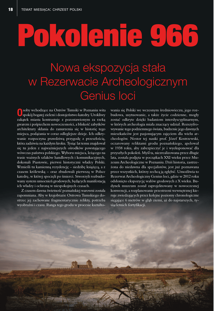 18 TEMAT MIESIĄCA : CHRZEST POLSKI Pokolenie 966 Nowa ekspozycja stała w Rezerwacie Archeologicznym Genius loci O soby wchodzące na Ostrów Tumski w Poznaniu wita spokój bogatej zieleni i dostojeństwo katedry. Urokliwy zakątek miasta kontrastuje z pozostawionym za rzeką gwarem i pośpiechem nowoczesności, a bliskość zabytków architektury skłania do zanurzenia się w historię tego miejsca, podążania w coraz odleglejsze dzieje. Ich odkrywanie rozpoczyna prawdziwą przygodę z przeszłością, która zadziwia na każdym kroku. Tysiąc lat temu znajdował się tu jeden z najważniejszych ośrodków powstającego wówczas państwa polskiego. Wyboru miejsca, leżącego na trasie ważnych szlaków handlowych i komunikacyjnych, dokonali Piastowie, pierwsi historyczni władcy Polski. Wznieśli tu kamienną rezydencję – siedzibę książęcą, a z czasem królewską – oraz zbudowali pierwszą w Polsce katedrę, w której spoczęli po śmierci. Stworzyli rozbudowany system umocnień grodowych, będących manifestacją ich władzy i ochroną w niespokojnych czasach. Z czasem dawna świetność poznańskiej warowni została zapomniana. Aby w krajobrazie Ostrowa Tumskiego dostrzec jej zachowane fragmentarycznie relikty, potrzeba wyobraźni i czasu. Ranga tego grodu w procesie kształto- wania się Polski we wczesnym średniowieczu, jego rozbudowa, usytuowanie, a także życie codzienne, mogły zostać odkryte dzięki badaniom interdyscyplinarnym, w których archeologia miała znaczący udział. Rozszyfrowywanie tego podziemnego świata, budzenie jego dawnych mieszkańców jest pasjonującym zajęciem dla wielu archeologów. Nestor tej nauki prof. Józef Kostrzewski, oczarowany reliktami grodu poznańskiego, apelował w 1938 roku, aby zabezpieczyć je i wyeksponować dla przyszłych pokoleń. Myśl ta, niezrealizowana przez długie lata, została podjęta w początkach XXI wieku przez Muzeum Archeologiczne w Poznaniu. Dziś historia, zastrzeżona do niedawna dla specjalistów, jest już poznawana przez wszystkich, którzy zechcą ją zgłębić. Umożliwia to Rezerwat Archeologiczny Genius loci, gdzie w 2012 roku odsłonięto ekspozycję wałów grodowych z X wieku. Budynek muzeum został zaprojektowany w nowoczesnej konwencji, a rozplanowanie przestrzeni wewnętrznej kieruje zwiedzających przez kolejne poziomy chronologiczne sięgające 6 metrów w głąb ziemi, aż do najstarszych, tysiącletnich fortyfikacji. TEMAT MIESIĄCA : CHRZEST POLSKI Badania archeologiczne prowadzone na terenie Ostrowa Tumskiego, trwające już prawie stulecie, pozwoliły na odzyskanie pamięci o wielkości i znaczeniu grodu poznańskiego. Monumentalne konstrukcje wałów grodowych, pierwsze kamienne budowle rezydencjonalne i sakralne oraz wielkie przemiany, których areną stała się tutejsza warownia w drugiej połowie X wieku, wzbudzają podziw i uznanie. W tym kontekście naturalne jest przywoływanie wielkich postaci, autorów i budowniczych początków polskiej państwowości – szczególnie Mieszka I i Bolesława Chrobrego, księżnej Dobrawy czy pierwszego biskupa Jordana i jego następców. Archeologia jednak pozwala ocalić od zapomnienia również ich poddanych, o których milczą kronikarze. Kim byli ludzie pochowani na cmentarzu pobliskiej Śródki, a których pracy, wiedzy, umiejętnościom i doświadczeniu gród poznański zawdzięcza potęgę i rozwój? To bezimienni bohaterowie czasów, w których zmieniało się wszystko wokół, a wiara chrześcijańska otwierała przed mieszkańcami tych ziem drogę ku nowym horyzontom duchowości i kultury europejskiej. Badania nekropoli wczesnośredniowiecznej dostarczyły wielu bezcennych zabytków, składających się na wyposażenie grobów. Tworzą one obraz kultury materialnej czasów, w których na ziemie polskie wkraczało chrześcijaństwo. A dzięki dobrze zachowanym szczątkom nauka pozyskała informacje o ludziach żyjących pod koniec X i w początkach XI wieku w grodzie Poznana. Nowoczesne metody antropologiczne pozwalają na rekonstrukcję ich twarzy; dzięki temu po tysiącu latach możemy spojrzeć w oczy ludziom z pokolenia czasów Mieszka. Obraz codzienności ówczesnych mieszkańców Ostrowa Tumskiego i pracę, której efekty do dziś możemy podziwiać w postaci zachowanych reliktów, zapewnią na powstającej ekspozycji zabytki archeologiczne. Doświadczenie bliskości i kontaktu ze świadkami historii pozostanie najważniejszym przesłaniem wystawy, w której zabytek stanie się przewodnikiem i łącznikiem pomiędzy budowniczymi grodu sprzed tysiąclecia a dzisiejszymi naukowcami, przywracającymi pamięć i świetność dni tak ważnych dla losów państwa polskiego. Przygotowywana wystawa, związana z jubileuszem 1050-lecia chrztu Polski, będzie wzbogacona atrakcyjnymi prezentacjami, projekcją mappingową, drukami holograficznymi i filmem popularnonaukowym. Ekspozycja jest tworzona we współpracy z Uniwersytetem Medycznym w Poznaniu, Katedrą i Zakładem Medycyny Sądowej oraz Pracownią Archeologiczną – mgr. Pawłem Pawlakiem, autorem badań cmentarzyska śródeckiego. Realizację podjęto w ramach programu Chrzest 966, jest ona współfinansowana przez Narodowe Centrum Kultury. Zdjęcia: Kateriny Zisopulu-Bleja, Ewa Pawłak Aproksymacja twarzy: dr Dorota Lorkiewicz-Muszyńska Kurator wystawy: Agnieszka Stempin 19