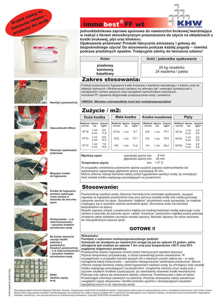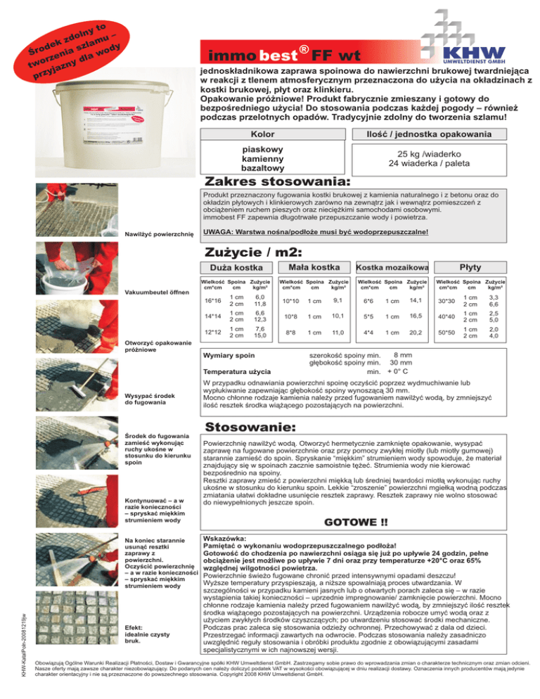to ny dol mu – z a dek szl ody Śro enia w a dl orz tw jazny y prz immo best ® FF wt KHW UMWELTDIENST GMBH jednoskładnikowa zaprawa spoinowa do nawierzchni brukowej twardniejąca w reakcji z tlenem atmosferycznym przeznaczona do użycia na okładzinach z kostki brukowej, płyt oraz klinkieru. Opakowanie próżniowe! Produkt fabrycznie zmieszany i gotowy do bezpośredniego użycia! Do stosowania podczas każdej pogody – również podczas przelotnych opadów. Tradycyjnie zdolny do tworzenia szlamu! Kolor Ilość / jednostka opakowania piaskowy kamienny bazaltowy 25 kg /wiaderko 24 wiaderka / paleta Zakres stosowania: Produkt przeznaczony fugowania kostki brukowej z kamienia naturalnego i z betonu oraz do okładzin płytowych i klinkierowych zarówno na zewnątrz jak i wewnątrz pomieszczeń z obciążeniem ruchem pieszych oraz nieciężkimi samochodami osobowymi. immobest FF zapewnia długotrwałe przepuszczanie wody i powietrza. Nawilżyć powierzchnię UWAGA: Warstwa nośna/podłoże musi być wodoprzepuszczalne! Zużycie / m2: Vakuumbeutel öffnen Otworzyć opakowanie próżniowe Duża kostka Mała kostka Kostka mozaikowa Płyty Wielkość Spoina Zużycie cm*cm cm kg/m² Wielkość Spoina Zużycie cm*cm cm kg/m² Wielkość Spoina Zużycie cm*cm cm kg/m² Wielkość Spoina Zużycie cm*cm cm kg/m² 16*16 1 cm 2 cm 6,0 11,8 10*10 1 cm 9,1 6*6 1 cm 14,1 30*30 1 cm 2 cm 3,3 6,6 14*14 1 cm 2 cm 6,6 12,3 10*8 1 cm 10,1 5*5 1 cm 16,5 40*40 1 cm 2 cm 2,5 5,0 12*12 1 cm 2 cm 7,6 15,0 8*8 1 cm 11,0 4*4 1 cm 20,2 50*50 1 cm 2 cm 2,0 4,0 Wymiary spoin Temperatura użycia Wysypać środek do fugowania Środek do fugowania zamieść wykonując ruchy ukośne w stosunku do kierunku spoin Kontynuować – a w razie konieczności – spryskać miękkim strumieniem wody KHW-KatalPoln-20081219jw Na koniec starannie usunąć resztki zaprawy z powierzchni. Oczyścić powierzchnię – a w razie konieczności – spryskać miękkim strumieniem wody Efekt: idealnie czysty bruk. 8 mm szerokość spoiny min. głębokość spoiny min. 30 mm min. + 0° C W przypadku odnawiania powierzchni spoinę oczyścić poprzez wydmuchiwanie lub wypłukiwanie zapewniając głębokość spoiny wynoszącą 30 mm. Mocno chłonne rodzaje kamienia należy przed fugowaniem nawilżyć wodą, by zmniejszyć ilość resztek środka wiążącego pozostających na powierzchni. Stosowanie: Powierzchnię nawilżyć wodą. Otworzyć hermetycznie zamknięte opakowanie, wysypać zaprawę na fugowane powierzchnie oraz przy pomocy zwykłej miotły (lub miotły gumowej) starannie zamieść do spoin. Spryskanie “miękkim” strumieniem wody spowoduje, że materiał znajdujący się w spoinach zacznie samoistnie tężeć. Strumienia wody nie kierować bezpośrednio na spoiny. Resztki zaprawy zmieść z powierzchni miękką lub średniej twardości miotłą wykonując ruchy ukośne w stosunku do kierunku spoin. Lekkie “zroszenie” powierzchni mgiełką wodną podczas zmiatania ułatwi dokładne usunięcie resztek zaprawy. Resztek zaprawy nie wolno stosować do niewypełnionych jeszcze spoin. GOTOWE !! Wskazówka: Pamiętać o wykonaniu wodoprzepuszczalnego podłoża! Gotowość do chodzenia po nawierzchni osiąga się już po upływie 24 godzin, pełne obciążenie jest możliwe po upływie 7 dni oraz przy temperaturze +20°C oraz 65% względnej wilgotności powietrza. Powierzchnie świeżo fugowane chronić przed intensywnymi opadami deszczu! Wyższe temperatury przyspieszają, a niższe spowalniają proces utwardzania. W szczególności w przypadku kamieni jasnych lub o otwartych porach zaleca się – w razie wystąpienia takiej konieczności – uprzednie impregnowanie/ zamknięcie powierzchni. Mocno chłonne rodzaje kamienia należy przed fugowaniem nawilżyć wodą, by zmniejszyć ilość resztek środka wiążącego pozostających na powierzchni. Urządzenia robocze umyć wodą oraz z użyciem zwykłych środków czyszczących; po utwardzeniu stosować środki mechaniczne. Podczas prac zaleca się stosowania odzieży ochronnej. Przechowywać z dala od dzieci. Przestrzegać informacji zawartych na odwrocie. Podczas stosowania należy zasadniczo uwzględnić reguły stosowania i obróbki produktu zgodnie z obowiązującymi zasadami specjalistycznymi w ich najnowszej wersji. Obowiązują Ogólne Warunki Realizacji Płatności, Dostaw i Gwarancyjne spółki KHW Umweltdienst GmbH. Zastrzegamy sobie prawo do wprowadzania zmian o charakterze technicznym oraz zmian odcieni. Nasze oferty mają zawsze charakter niezobowiązujący. Do podanych cen należy doliczyć podatek VAT w wysokości obowiązującej w dniu realizacji dostawy. Oznaczenia innych producentów mają jedynie charakter orientacyjny i nie są przeznaczone do powszechnego stosowania. Copyright 2008 KHW Umweltdienst GmbH. Dane techniczne: Wzory kolorów: Materiał Przygotowanie gęstość - ok. 1,65 g/cm3 wytrzymałość na zginanie - ok. 4,0 N/mm2 wytrzymałość na ściskanie – ok. 8,0 N/mm2 moduł Younga 2.000 N/mm2 przepuszczalność wody – trwałe stabilność magazynowania Czas użycia: > 0°C Ok. 30 min przy 30°C > 0°C Temperatura użycia: > 0°C Temperatura zewnętrzna > 0°C Temperatura podłoża > 0°C Temperatura materiału > 0°C piaskowy Skład Środowisko naturalne Klasa zagrożenia wód w stanie utwardzonym WGK 0 jako środek nieprzetworzony WGK 1 klucz klasyfikacji odpadów: 080406 080408 080499 Piasek kwarcowy Wielkość ziaren 0,3-1,3 mm Środek wiążący piasek immobest – płynny polimer jednoskładnikowy modyfikowany twardniejący w reakcji z tlenem atmosferycznym kamienny bazaltowy Z przyczyn drukarskich przedstawione powyżej wzory kolorów mogą się nieznacznie różnić od rzeczywistych odcieni. Przetarg: _____ m2 spoiny przygotować o głębokości 30 mm. Powierzchnię oczyścić. Piasek połączyć z płynnym immobest zgodnie z zaleceniami określonymi przez producenta. Miotłą wprowadzić do przygotowanych spoin. Resztki zaprawy pozostałe 