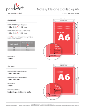 Notesy klejone z okładką A6 w w w. p r i n t 4 a l l . p l K A R TA P R O D U K TO WA 109 mm brutto OKŁADKA 152 mm netto 30 FORMAT NETTO (po obcięciu): A 105 x (30+A+148) mm FORMAT BRUTTO (z 2 mm SPADEM): gdzie A jest grubością grzbietu wynikającą z ilości kartek w bloku Grubość grzbietu 148 mm Ilość kartek A 25 3 mm 50 6 mm MARGINES: 32 + A + 150 mm brutto A6 OKŁADKA 109 x (32+A+150) mm MARGINES 3 mm SPAD 2 mm 3 mm 109 mm brutto 105 mm netto ŚRODEK FORMAT NETTO (po obcięciu): A6 ŚRODEK 105 x 148 mm MARGINES: 152 mm brutto 109 x 152 mm 148 mm netto FORMAT BRUTTO (ze spadem): 3 mm INTROLIGATORNIA: klejenie po krótszym boku MARGINES 3 mm SPAD 2 mm www.print4all.pl DRUKARNIA INTERNETOWA e-mail: [email protected] | serwer FTP: ftp.cuddruk.pl (Użytkownik i hasło: print4all) | Informacja telefoniczna czynna w dni robocze od 9.00 do 16.00: 32 248-66-73 Notesy klejone z okładką DL w w w. p r i n t 4 a l l . p l K A R TA P R O D U K TO WA 103 mm brutto OKŁADKA 99 mm netto 30 FORMAT NETTO (po obcięciu): A 99 x (30+A+210) mm FORMAT BRUTTO (z 2 mm SPADEM): gdzie A jest grubością grzbietu wynikającą z ilości kartek w bloku Grubość grzbietu 210 mm Ilość kartek A 25 3 mm 50 6 mm 100 12 mm MARGINES: 32 + A + 212 mm brutto DL OKŁADKA 103 x (32+A+212) mm MARGINES 4 mm SPAD 2 mm 4 mm 103 mm brutto 99 mm netto ŚRODEK FORMAT NETTO (po obcięciu): DL ŚRODEK 99 x 210 mm MARGINES: 210 mm netto 103 x 214 mm 214 mm brutto FORMAT BRUTTO (ze spadem): 4 mm INTROLIGATORNIA: klejenie po krótszym boku MARGINES 4 mm SPAD 2 mm www.print4all.pl DRUKARNIA INTERNETOWA e-mail: [email protected] | serwer FTP: ftp.cuddruk.pl (Użytkownik i hasło: print4all) | Informacja telefoniczna czynna w dni robocze od 9.00 do 16.00: 32 248-66-73 Notesy klejone z okładką A5 w w w. p r i n t 4 a l l . p l K A R TA P R O D U K TO WA 152 mm brutto OKŁADKA 148 mm netto 30 FORMAT NETTO (po obcięciu): A 148 x (30+A+210) mm FORMAT BRUTTO (z 2 mm SPADEM): gdzie A jest grubością grzbietu wynikającą z ilości kartek w bloku Grubość grzbietu 210 mm Ilość kartek A 25 3 mm 50 6 mm 100 12 mm MARGINES: 32 + A + 212 mm brutto A5 OKŁADKA 152 x (32+A+212) mm MARGINES 4 mm SPAD 2 mm 4 mm 152 mm brutto 148 mm netto ŚRODEK FORMAT NETTO (po obcięciu): A5 ŚRODEK 148 x 210 mm MARGINES: 214 mm brutto 152 x 214 mm 210 mm netto FORMAT BRUTTO (ze spadem): 4 mm INTROLIGATORNIA: klejenie po krótszym boku MARGINES 4 mm SPAD 2 mm www.print4all.pl DRUKARNIA INTERNETOWA e-mail: [email protected] | serwer FTP: ftp.cuddruk.pl (Użytkownik i hasło: print4all) | Informacja telefoniczna czynna w dni robocze od 9.00 do 16.00: 32 248-66-73 Notesy klejone z okładką A4 w w w. p r i n t 4 a l l . p l K A R TA P R O D U K TO WA 214 mm brutto OKŁADKA 210 mm netto 30 FORMAT NETTO (po obcięciu): A 210 x (30+A+297) mm FORMAT BRUTTO (z 2 mm SPADEM): gdzie A jest grubością grzbietu wynikającą z ilości kartek w bloku Grubość grzbietu 297 mm Ilość kartek A 25 3 mm 50 6 mm 100 12 mm MARGINES: 32 + A + 299 mm brutto A4 OKŁADKA 214 x (32+A+299) mm MARGINES 5 mm SPAD 2 mm 5 mm 214 mm brutto 210 mm netto ŚRODEK FORMAT NETTO (po obcięciu): A4 ŚRODEK 210 x 297 mm MARGINES: 301 mm brutto 214 x 301 mm 297 mm netto FORMAT BRUTTO (ze spadem): 5 mm INTROLIGATORNIA: klejenie po krótszym boku MARGINES 5 mm SPAD 2 mm www.print4all.pl DRUKARNIA INTERNETOWA e-mail: [email protected] | serwer FTP: ftp.cuddruk.pl (Użytkownik i hasło: print4all) | Informacja telefoniczna czynna w dni robocze od 9.00 do 16.00: 32 248-66-73