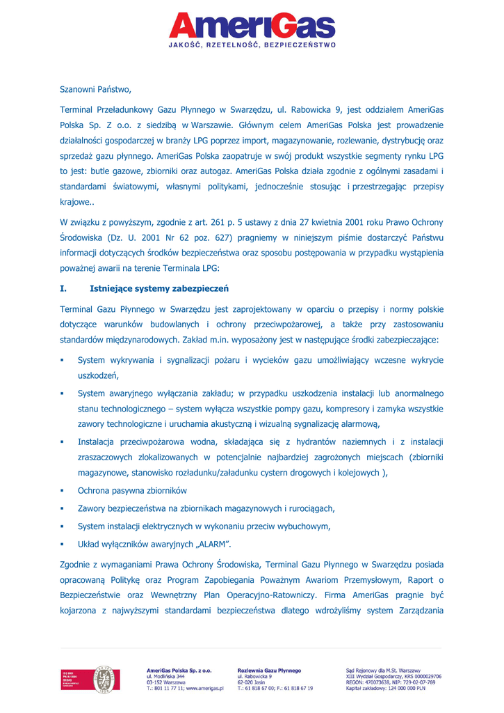 Szanowni Państwo, Terminal Przeładunkowy Gazu Płynnego w Swarzędzu, ul. Rabowicka 9, jest oddziałem AmeriGas Polska Sp. Z o.o. z siedzibą w Warszawie. Głównym celem AmeriGas Polska jest prowadzenie działalności gospodarczej w branży LPG poprzez import, magazynowanie, rozlewanie, dystrybucję oraz sprzedaż gazu płynnego. AmeriGas Polska zaopatruje w swój produkt wszystkie segmenty rynku LPG to jest: butle gazowe, zbiorniki oraz autogaz. AmeriGas Polska działa zgodnie z ogólnymi zasadami i standardami światowymi, własnymi politykami, jednocześnie stosując i przestrzegając przepisy krajowe.. W związku z powyższym, zgodnie z art. 261 p. 5 ustawy z dnia 27 kwietnia 2001 roku Prawo Ochrony Środowiska (Dz. U. 2001 Nr 62 poz. 627) pragniemy w niniejszym piśmie dostarczyć Państwu informacji dotyczących środków bezpieczeństwa oraz sposobu postępowania w przypadku wystąpienia poważnej awarii na terenie Terminala LPG: I. Istniejące systemy zabezpieczeń Terminal Gazu Płynnego w Swarzędzu jest zaprojektowany w oparciu o przepisy i normy polskie dotyczące warunków budowlanych i ochrony przeciwpożarowej, a także przy zastosowaniu standardów międzynarodowych. Zakład m.in. wyposażony jest w następujące środki zabezpieczające: System wykrywania i sygnalizacji pożaru i wycieków gazu umożliwiający wczesne wykrycie uszkodzeń, System awaryjnego wyłączania zakładu; w przypadku uszkodzenia instalacji lub anormalnego stanu technologicznego – system wyłącza wszystkie pompy gazu, kompresory i zamyka wszystkie zawory technologiczne i uruchamia akustyczną i wizualną sygnalizację alarmową, Instalacja przeciwpożarowa wodna, składająca się z hydrantów naziemnych i z instalacji zraszaczowych zlokalizowanych w potencjalnie najbardziej zagrożonych miejscach (zbiorniki magazynowe, stanowisko rozładunku/załadunku cystern drogowych i kolejowych ), Ochrona pasywna zbiorników Zawory bezpieczeństwa na zbiornikach magazynowych i rurociągach, System instalacji elektrycznych w wykonaniu przeciw wybuchowym, Układ wyłączników awaryjnych „ALARM”. Zgodnie z wymaganiami Prawa Ochrony Środowiska, Terminal Gazu Płynnego w Swarzędzu posiada opracowaną Politykę oraz Program Zapobiegania Poważnym Awariom Przemysłowym, Raport o Bezpieczeństwie oraz Wewnętrzny Plan Operacyjno-Ratowniczy. Firma AmeriGas pragnie być kojarzona z najwyższymi standardami bezpieczeństwa dlatego wdrożyliśmy system Zarządzania Bezpieczeństwem spełniający wymagania polskiej normy PN-N-18001:2004 oraz brytyjskiej normy OHSAS 18001:2007 w zakresie magazynowania, napełniania, sprzedaży i dystrybucji gazu płynnego (LPG) w butlach i zbiornikach ciśnieniowych. Dodatkowo utrzymujemy czynny 24 h na dobę telefon alarmowy, pod którym dyżurują specjaliści ds. technicznych i bezpieczeństwa służący pomocą w sytuacjach awaryjnych. Obecność tych systemów powoduje, że pracownicy terminala oraz jej sąsiedzi mogą być spokojni o własne bezpieczeństwo. II. Sposób postępowania w przypadku wystąpienia awarii Uprzejmie informujemy, iż wystąpienie poważnej awarii w Terminalu Gazu Płynnego w Swarzędzu sygnalizowane jest za pomocą wewnętrznego dźwiękowego systemu alarmowego, który może być słyszalny w budynkach bezpośrednio sąsiadujących z obiektem. Ogłoszenie alarmu na terenie terminala sygnalizuje włączenie syreny alarmowej charakteryzującej się ciągłym dźwiękiem trwającym powyżej 20s, nie krócej niż minuta. Dźwięk ciągły trwający powyżej 20 s (nie krócej niż 1 minuta) W przypadku przybycia na teren zakładu jednostek ratowniczych nadzór nad prowadzeniem akcji ratowniczej przejmuje Państwowa Straż Pożarna, która może uruchomić własny system alarmowy informujący o powstaniu poważnej awarii. Sposób ogłaszania alarmu przez służby ratownicze w przypadku wystąpienia awarii przemysłowej ZA POMOCĄ SYREN PRZY POMOCY ROZGŁOŚNI RADIOWYCH ORAZ OŚRODKÓW TELEWIZJI I RADIOFONII Dźwięk ciągły trwający 3 minuty Powtarzana trzykrotnie zapowiedź słowna informacji o zagrożeniu i sposobie postępowania mieszkańców. Zgodnie z zaleceniami Państwowej Straży Pożarnej w przypadku uruchomienia sygnału alarmu należy: nie zbliżać się do rejonu katastrofy, przebywając na terenie otwartym o zwrócić uwagę na kierunek wiatru i opuścić zagrożony teren prostopadle do kierunku wiatru, o w razie potrzeby pomóc w opuszczeniu terenu osobom o zmniejszonej sprawności ruchowej, o postępować zgodnie z poleceniami zawartymi w komunikatach radiowych, telewizyjnych, przekazywanych przez ruchome środki nagłaśniające lub w inny sposób; przebywając w domu, biurze, sklepie lub innym budynku należy: o włączyć odbiornik radiowy lub telewizyjny na częstotliwości stacji lokalnej, o wysłuchać nadanych komunikatów i zasad postępowania w zaistniałej sytuacji, o wygasić i nie używać otwartych źródeł ognia, o być przygotowanym do ewentualnej ewakuacji (przygotować dokumenty osobiste, odzież, leki itp.), o Bezwzględnie wykonywać polecenia wydawane przez lokalne władze lub służby ratownicze, WYKAZ TELEFONÓW ALARMOWYCH DO SŁUŻB ODPOWIEDZIALNYCH ZA PODJĘCIE DZIAŁAŃ OPERACYJNO-RATOWNICZYCH : Pogotowie ratunkowe – 999 lub 112, Straż pożarna – 998 lub 112, Policja – 997 lub 112, Pogotowie wodociągowe – 994, Pogotowie gazowe – 992, Pogotowie energetyczne – 991, Telefon alarmowy AmeriGas Polska – 22 519 19 59