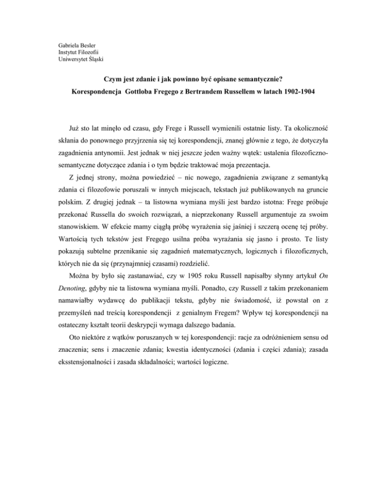 Gabriela Besler Instytut Filozofii Uniwersytet Śląski Czym jest zdanie i jak powinno być opisane semantycznie? Korespondencja Gottloba Fregego z Bertrandem Russellem w latach 1902-1904 Już sto lat minęło od czasu, gdy Frege i Russell wymienili ostatnie listy. Ta okoliczność skłania do ponownego przyjrzenia się tej korespondencji, znanej głównie z tego, że dotyczyła zagadnienia antynomii. Jest jednak w niej jeszcze jeden ważny wątek: ustalenia filozoficznosemantyczne dotyczące zdania i o tym będzie traktować moja prezentacja. Z jednej strony, można powiedzieć – nic nowego, zagadnienia związane z semantyką zdania ci filozofowie poruszali w innych miejscach, tekstach już publikowanych na gruncie polskim. Z drugiej jednak – ta listowna wymiana myśli jest bardzo istotna: Frege próbuje przekonać Russella do swoich rozwiązań, a nieprzekonany Russell argumentuje za swoim stanowiskiem. W efekcie mamy ciągłą próbę wyrażenia się jaśniej i szczerą ocenę tej próby. Wartością tych tekstów jest Fregego usilna próba wyrażania się jasno i prosto. Te listy pokazują subtelne przenikanie się zagadnień matematycznych, logicznych i filozoficznych, których nie da się (przynajmniej czasami) rozdzielić. Można by było się zastanawiać, czy w 1905 roku Russell napisałby słynny artykuł On Denoting, gdyby nie ta listowna wymiana myśli. Ponadto, czy Russell z takim przekonaniem namawiałby wydawcę do publikacji tekstu, gdyby nie świadomość, iż powstał on z przemyśleń nad treścią korespondencji z genialnym Fregem? Wpływ tej korespondencji na ostateczny kształt teorii deskrypcji wymaga dalszego badania. Oto niektóre z wątków poruszanych w tej korespondencji: racje za odróżnieniem sensu od znaczenia; sens i znaczenie zdania; kwestia identyczności (zdania i części zdania); zasada eksstensjonalności i zasada składalności; wartości logiczne.