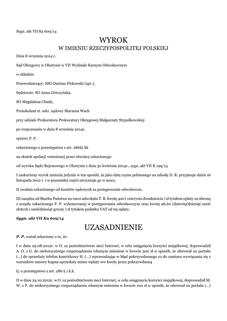 Sygn. akt VII Ka 609/14 WYROK W IMIENIU RZECZYPOSPOLITEJ POLSKIEJ Dnia 8 września 2014 r. Sąd Okręgowy w Olsztynie w VII Wydziale Karnym Odwoławczym w składzie: Przewodniczący: SSO Dariusz Firkowski (spr.), Sędziowie: SO Anna Górczyńska, SO Magdalena Chudy, Protokolant st. sekr. sądowy Marzena Wach przy udziale Prokuratora Prokuratury Okręgowej Małgorzaty Stypułkowskiej po rozpoznaniu w dniu 8 września 2014r. sprawy P. P. oskarżonego o przestępstwa z art. 286§1 kk na skutek apelacji wniesionej przez obrońcę oskarżonego od wyroku Sądu Rejonowego w Olsztynie z dnia 30 kwietnia 2014r., sygn. akt VII K 199/13 I zaskarżony wyrok zmienia jedynie w ten sposób, że jako datę czynu pełnionego na szkodę D. R. przyjmuje dzień 16 listopada 2012 r. i w pozostałej części utrzymuje go w mocy, II zwalnia oskarżonego od kosztów sądowych za postępowanie odwoławcze, III zasądza od Skarbu Państwa na rzecz adwokata T. B. kwotę 420 ( czterysta dwadzieścia ) zł tytułem opłaty za obronę z urzędu oskarżonego P. P. wykonywanej w postępowaniu odwoławczym oraz kwotę 96,60 (dziewięćdziesiąt sześć złotych i sześćdziesiąt groszy ) zł tytułem podatku VAT od tej opłaty. Sygn. akt VII Ka 609/14 UZASADNIENIE P. P. został oskarżony o to, że: I w dniu 29.08.2012r. w O. za pośrednictwem sieci Internet, w celu osiągnięcia korzyści majątkowej, doprowadził A. O. z G. do niekorzystnego rozporządzenia własnym mieniem w kwocie 500 zł w sposób, że oferował na portalu (...) do sprzedaży telefon komórkowy H. (...) wprowadzając w błąd pokrzywdzonego co do zamiaru wywiązania się z warunków umowy kupna-sprzedaży mimo wpłaty ww kwoty przez pokrzywdzoną tj. o przestępstwo z art. 286 § 1 k.k. II w dniu 24.10.2012r. w O. za pośrednictwem sieci Internet, w celu osiągnięcia korzyści majątkowej, doprowadził M. W. z P. do niekorzystnego rozporządzenia własnym mieniem w kwocie 100 zł w sposób, że oferował na portalu (...) do sprzedaży telefon komórkowy marki H. (...) wprowadzając w błąd pokrzywdzonego co do zamiaru wywiązania się z warunków umowy kupna-sprzedaży mimo wpłaty zaliczki przez pokrzywdzonego ww kwocie tj. o przestępstwo z art. 286 § 1 k.k. III w dniu 24.10.2012r. w O. za pośrednictwem sieci Internet, w celu osiągnięcia korzyści majątkowej, doprowadził M. M. z S. do niekorzystnego rozporządzenia własnym mieniem w kwocie 350 zł w sposób, że oferował na portalu (...) do sprzedaży telefon komórkowy S. (...)wprowadzając w błąd pokrzywdzonego co do zamiaru wywiązania się z warunków umowy kupna-sprzedaży mimo wpłaty zaliczki ww kwocie przez pokrzywdzoną tj. o przestępstwo z art. 286 § 1 k.k. IV w dniu 12.11.2012r. w O. w celu osiągnięcia korzyści majątkowej poprzez wprowadzenie w błąd co do zamiaru wywiązania się z oferty sprzedaży telefonu komórkowego S. (...) za pośrednictwem serwisu aukcyjnego doprowadził D. R. do niekorzystnego rozporządzenia własnym mieniem w kwocie 700 zł na szkodę wymienionego tj. o przestępstwo z art. 286 § 1 k.k. V w dniu 12.09.2012r. w O. w celu osiągnięcia korzyści majątkowej poprzez wprowadzenie w błąd co do zamiaru wywiązania się z oferty sprzedaży telefonu komórkowego m-ki H. O. za pośrednictwem serwisu aukcyjnego doprowadził D. B. do niekorzystnego rozporządzenia własnym mieniem w kwocie 100 zł na szkodę wymienionego tj. o przestępstwo z art. 286 § 1 k.k. oskarżonego uznaje za winnego popełnienia zarzucanych mu czynów z pkt I-V z tym ustaleniem, iż stanowiły one ciąg przestępstw z art. 91 §1 kk w zw. z art. 286§1 kk i za to na podstawie art. 91 §1 kk w zw. z art. 286§1 kk skazuje go na karę 1 (jednego) roku i 6 (sześciu) miesięcy pozbawienia wolności, na podstawie art. 46§1 kk orzeka wobec oskarżonego obowiązek naprawienia szkody poprzez zapłatę: na rzecz pokrzywdzonej A. O. kwoty 500 (pięćset) zł, na rzecz pokrzywdzonego M. W. kwoty 100 (sto) zł, na rzecz pokrzywdzonej M. M. kwoty 350 (trzysta pięćdziesiąt) zł, na rzecz pokrzywdzonego D. R. kwoty 700 (siedemset) zł, na rzecz pokrzywdzonego D. B. kwoty 100 (sto) zł, Powyższy wyrok w zakresie rozstrzygnięcia zawartego w pkt. I oraz II na korzyść P. P. zaskarżył jego obrońca i zarzucił mu: 1. błąd w ustaleniach faktycznych przyjętych za podstawę zaskarżonego wyroku, który miał wpływ na jego treść, poprzez danie wiary zeznaniom pokrzywdzonym i zgromadzonym w sprawie dokumentom, a przyjęcie, iż wyjaśnienia oskarżonego nie zasługują na uwzględnienie, chociaż oskarżony konsekwentnie nie przyznawał się do popełnienia zarzucanych mu czynów, a odpowiadając na pytania na etapie postępowania przygotowawczego oraz sądowego wyjaśnił, iż nie wie dlaczego na posiadane konto bankowe spływały mu pieniądze, albowiem z przedmiotową sprzedażą internetowa nie miał nic wspólnego, a kilka lat temu skradziono mu dowód osobisty, co w konsekwencji doprowadziło do wydania zaskarżonego wyroku, 2. z ostrożności procesowej - rażącą niewspółmiemość kary, poprzez wymierzenie oskarżonemu kary 1 roku i 6 miesięcy bezwzględnego pozbawienia wolności, zamiast kary pozbawienia wolności z warunkowym zawieszeniem jej wykonania na okres próby 5 lat, chociaż oskarżony dopuścił się zarzuconych mu czynów w stosunkowo krótkich odstępach czasu, zaskarżony wyrok dotyczy przestępstw podobnych, popełnionych przy zachowaniu m. in. tej samej metody działania, od popełniania których minęło już prawie lata, a w chwili obecnej oskarżony będąc już skazanym innym wyrokiem i osadzonym w Zakładzie Karnym zrozumiał naganność swojego zachowania, co w konsekwencji doprowadziło do wydania zaskarżonego wyroku. Podnosząc powyższe zarzuty skarżący wniósł o zamianę zaskarżonego wyroku w zaskarżonej części i uniewinnienie oskarżonego od popełnienia zarzuconych mu czynów, ewentualnie o uchylenie zaskarżonego wyroku i przeka