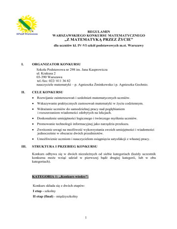 REGULAMIN WARSZAWSKIEGO KONKURSU MATEMATYCZNEGO „Z MATEMATYKĄ PRZEZ ŻYCIE” dla uczniów kl. IV-VI szkół podstawowych m.st. Warszawy I. ORGANIZATOR KONKURSU Szkoła Podstawowa nr 298 im. Jana Kasprowicza ul. Krakusa 2 03-390 Warszawa tel./fax: 022/ 811 36 82 nauczyciele matematyki – p. Agnieszka Żminkowska i p. Agnieszka Gochnio. II. CELE KONKURSU Rozwijanie zainteresowań i uzdolnień matematycznych uczniów. Wskazywanie praktycznych zastosowań matematyki w życiu codziennym. Wdrażanie uczniów do samodzielnej pracy nad pogłębianiem i rozszerzaniem wiadomości zdobytych na lekcjach. Doskonalenie umiejętności logicznego i twórczego myślenia uczniów. Promowanie technologii informacyjnej jako narzędzia przekazu. Zwrócenie uwagi na możliwość wykorzystania swoich umiejętności i wiadomości jednocześnie w obszarze dwóch przedmiotów. Umożliwienie uczniom i nauczycielom osiągnięcia satysfakcji z własnej pracy. III. STRUKTURA I PRZEBIEG KONKURSU Konkurs odbywa się w dwóch niezależnych od siebie kategoriach (każdy uczestnik konkursu może wziąć udział w pierwszej bądź drugiej kategorii, lub w obu kategoriach). KATEGORIA 1: „Konkurs wiedzy”: Konkurs składa się z dwóch etapów: I etap - szkolny II etap (finał) - międzyszkolny 1 I i II etap konkursu polega na samodzielnym rozwiązaniu przez uczestników pięciu zadań tekstowych w czasie 90 minut. W czasie trwania konkursu nie wolno używać kalkulatorów. Zadania konkursowe będą przygotowane na trzech poziomach: dla uczniów klas czwartych, piątych i szóstych. I etap Z proponowanych zadań, przesłanych przez zgłaszające swój udział szkoły, Organizator Konkursu wybiera najbardziej odpowiednie, sporządza arkusze konkursowe i przesyła je Szkolnym Koordynatorom najpóźniej na dwa dni przed terminem konkursu. I etap Konkursu przeprowadzają Komisje Szkolne. Komisje Szkolne powielają odpowiednią ilość arkuszy konkursowych. Uczniowie rozwiązują zadania na arkuszach papieru podaniowego, ostemplowanych pieczątką szkoły. Prace są sprawdzane i oceniane przez Komisje Szkolne według punktacji przygotowanej przez Organizatora Konkursu. Czas trwania eliminacji – 90 min. Po sprawdzeniu prac konkursowych Szkolni Koordynatorzy przesyłają wyniki Organizatorowi Konkursu, w terminie 10 dni od przeprowadzenia I etapu konkursu. Organizator zobowiązany jest do wybrania około 50 uczestników finału. Jedynym kryterium wyboru uczestników finału jest liczba zdobytych przez nich punktów w eliminacjach szkolnych. W ciągu 7 dni od otrzymania wyników od wszystkich Szkolnych Koordynatorów otrzymają oni zwrotną wiadomość e-mail z listami uczniów zakwalifikowanych do finału konkursu. II etap Konkursu odbywa się w Szkole Podstawowej Nr 298 im. Jana Kasprowicza, ul. Krakusa 2. Zakwalifikowani uczniowie zgłaszają się z opiekunem na międzyszkolny etap Konkursu. Prace uczniów są kodowane. Każdy uczestnik Konkursu posiada przybory szkolne oraz legitymację szkolną. Nad prawidłowością przebiegu etapu międzyszkolnego czuwa Komisja Międzyszkolna. W jej skład wchodzi po jednym nauczycielu matematyki z każdej szkoły podstawowej reprezentowanej w Konkursie. Uczniowie – uczestnicy II etapu, którzy otrzymają 25, 24, 23 punkty (na poszczególnych poziomach) uzyskają tytuł laureata - odpowiednio: I, II i III miejsca. W przypadku, gdy żaden uczeń nie uzyska powyższej liczby punktów Komisja Konkursowa może przyznać wyróżnienia za najwyższe noty. Dla laureatów I, II, III miejsca i osób wyróżnionych przewidziane są dyplomy i nagrody rzeczowe. 2 Ogłoszenie wyników II etapu Konkursu odbywa się w dniu jego przeprowadzenia. Oficjalne wyniki przesyłane są do szkół w ciągu 7 dni od ich ogłoszenia. KATEGORIA 2: „Prezentacja multimedialna”: Konkurs składa się z dwóch etapów: I etap - szkolny II etap - międzyszkolny Konkurs polega na indywidualnym opracowaniu przez uczniów prezentacji multimedialnej z matematyki na temat praktycznego zastosowania matematyki w życiu codziennym. Prezentacja powinna być wykonana w programie PowerPoint. Uczestnicy mogą korzystać z materiałów zgromadzonych na lekcjach oraz ze wszystkich innych dostępnych źródeł. Prezentacja nie powinna przekroczyć 15 slajdów zawierających: - stronę tytułową: imię, nazwisko, klasę uczestnika Konkursu, numer i adres szkoły. - slajdy właściwe: teoretyczne opracowanie tematu oraz teksty i rozwiązania zadań przedstawiających praktyczne zastosowanie teorii. Prezentacja będzie oceniana według następujących kryteriów: - zgodność treści z tematem, - rzetelność wiedzy na temat wybranego zagadnienia, - spójność i przejrzystość merytoryczna, - stopień trudności i prawidłowość rozwiązań zadań praktycznych, - nowatorstwo pomysłu, - stopień skomplikowania używanych narzędzi informatycznych, - walory estetyczne pracy. I etap Konkursu przeprowadzają Komisje Szkolne. Uczestnicy Konkursu przekazują Komisji Szkolnej opracowane przez siebie prace konkursowe. Prezentacja powinna być przedstawiona na płycie CD, bądź pendrive. Komisja Szkolna wybiera po jednej, zakwalifikowanej do II etapu, prezentacji na każdym poziomie (jedna z klasy 4, jedna z klasy 5, jedna z klasy 6) i przesyła je Organizatorowi Konkursu na 14 dni przed przeprowadzeniem II etapu. W tytule pliku powinno znaleźć się: imię i nazwisko uczestnika konkursu, klasa oraz nr szkoły. 3 II etap Konkursu odbywa się w Szkole Podstawowej Nr 298 im. Jana Kasprowicza, ul. Krakusa 2. Nad prawidłowością przebiegu etapu międzyszkolnego czuwa Komisja Międzyszkolna. W jej skład wchodzi po jednym nauczycielu matematyki oraz chętni nauczyciele informatyki z każdej szkoły podstawowej reprezentowanej w Konkursie. Komisja Międzyszkolna wybiera spośród przekazanych prac te, które najlepiej spełniają wyznaczone kryteria. Ich autorzy uzyskają tytuł laureata I, II i III miejsca (na poszczególnych poziom