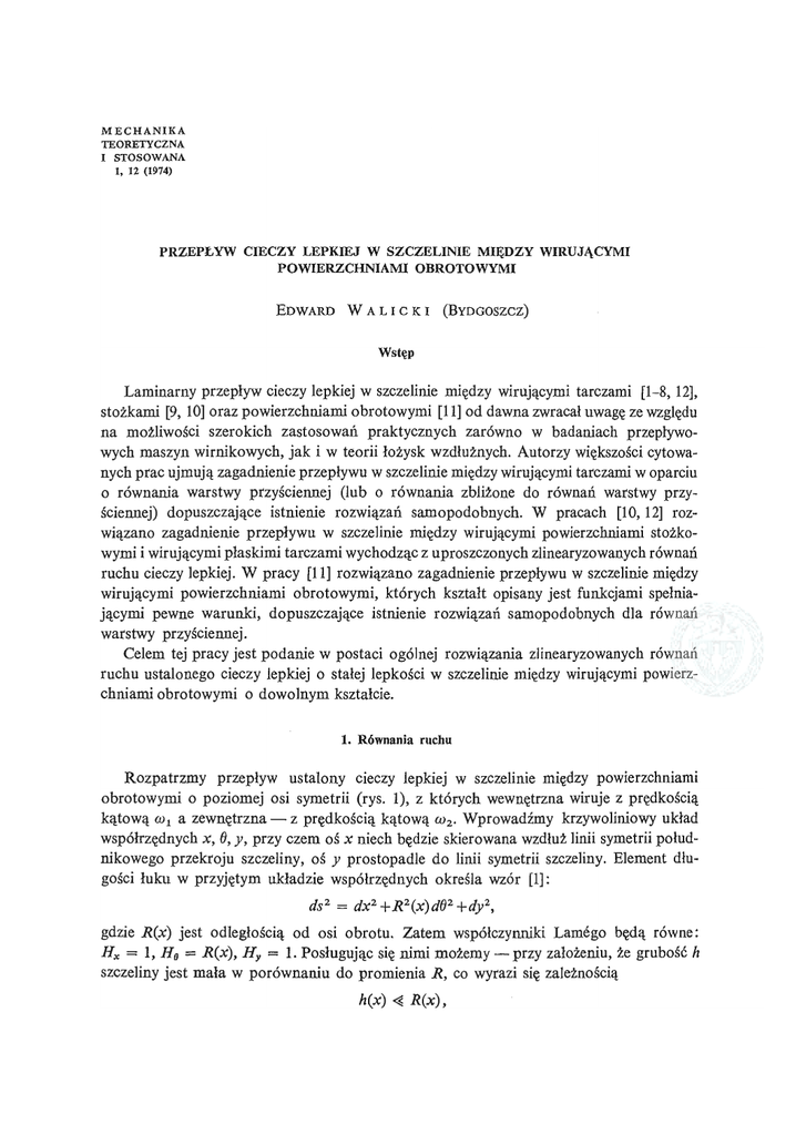 wartoś ci współ rzę dnej x jest liniowy (funkcja / iO?) na rys. 5) niezależ nie od kształ tu szczeliny. Profil ten jest identyczny z profilem przepł ywu C ouette'a mię dzy dwiema pł aszczyznami, z których jedna jest nieruchoma, a druga posiada lokalną prę dkość równą a>R(x).