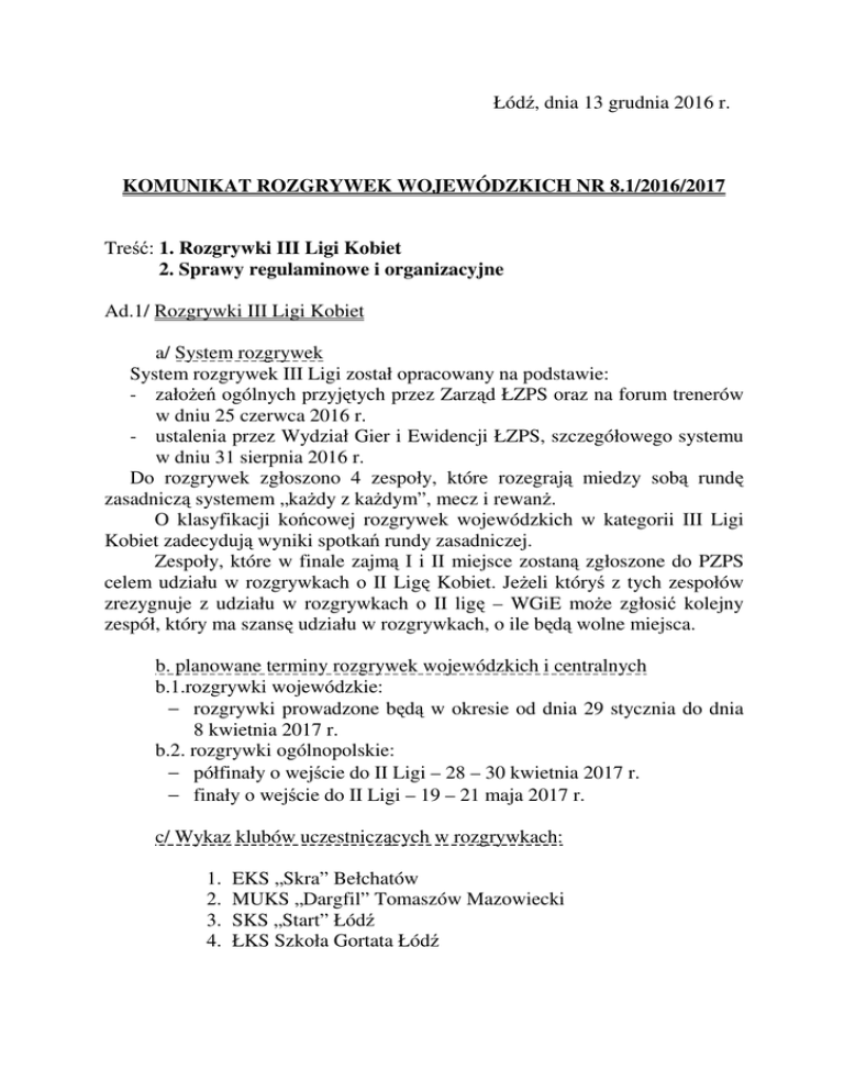Łódź, dnia 13 grudnia 2016 r. KOMUNIKAT ROZGRYWEK
