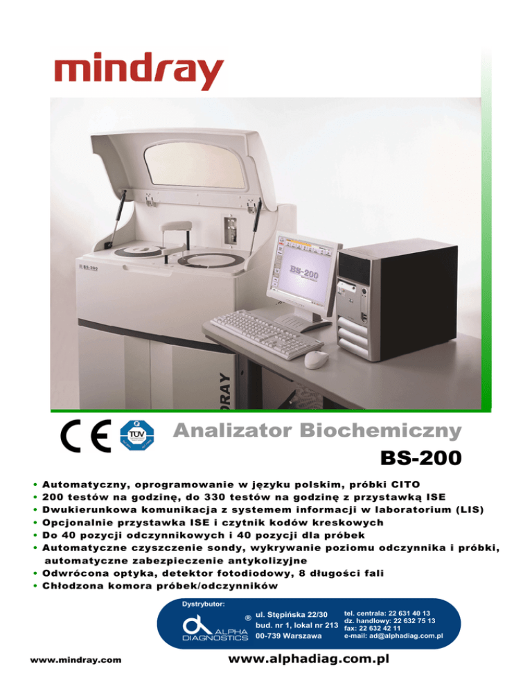 Analizator Biochemiczny BS-200 • • • • • • Automatyczny, oprogramowanie w języku polskim, próbki CITO 200 testów na godzinę, do 330 testów na godzinę z przystawką ISE Dwukierunkowa komunikacja z systemem informacji w laboratorium (LIS) Opcjonalnie przystawka ISE i czytnik kodów kreskowych Do 40 pozycji odczynnikowych i 40 pozycji dla próbek Automatyczne czyszczenie sondy, wykrywanie poziomu odczynnika i próbki, automatyczne zabezpieczenie antykolizyjne • Odwrócona optyka, detektor fotodiodowy, 8 długości fali • Chłodzona komora próbek/odczynników Dystrybutor: ul. Stępińska 22/30 bud. nr 1, lokal nr 213 00-739 Warszawa www.mindray.com tel. centrala: 22 631 40 13 dz. handlowy: 22 632 75 13 fax: 22 632 42 11 e-mail: [email protected] www.alphadiag.com.pl BS-200 Specyfikacja techniczna Automatyczny Analizator Biochemiczny Funkcje systemowe Automatyczny, oprogramowanie o swobodnym dostępie, próbki CITO Wydajność: do 200 testów na godzinę (bez ISE), do 330 testów na godzinę (z ISE - 3 jony) Zasada pomiaru: fotometryczna, turbidymetryczna, jonoselektywna (opcja) Metody pomiaru: punkt końcowy, czas stały, kinetyczna, ISE (opcja), pomiary mono- i bichromatyczne Materiał oznaczany: surowica, osocze, mocz, hemolizat krwi pełnej Zakres badań: substraty, enzymy, białka specyficzne Obsługa odczynników/próbek Rotor odczynnikowy/próbek: do 40 pozycji dla odczynników i do 40 pozycji dla próbek w chłodzonej komorze (4-15˚C) Objętość odczynnika: R1: 180 ~ 450µl, precyzja 1µl R2: 30 ~ 450µl, precyzja 1µl Objętość próbki: 3 ~ 45µl, precyzja 0,5µl Sonda odczynnikowa/próbki Wykrywanie poziomu odczynnika i próbki, ochrona antykolizyjna, kontrola objętości odczynnika Czyszczenie sondy Automatyczne mycie wewnętrzne i zewnętrzne (błąd przeniesienia < 0,1%) Automatyczne przed- i poreakcyjne rozcieńczanie próbki (współczynnik rozcieńczania do 1:150) Rozcieńczanie w jednorazowych kuwetach reakcyjnych Wewnętrzny lub zewnętrzny czytników kodów kreskowych (opcja) Używany do programowania próbek i odczynników Różne systemy kodowania (Codabar, ITF, code128, code39, UPC/EAN, code93) Dwustronna komunikacja z system Informatycznym w laboratorium (LIS) Przystawka ISE (opcja) Pomiar: K+, Na+, ClWydajność: do 225 testów na godzinę System pomiarowy Rotor: Kuwety: Objętość reakcyjna: Temperatura reakcji: Mieszanie: 80 kuwet jednorazowe, droga optyczna - 5mm 180~500µl 37˚C ± 1˚C niezależne mieszadło System optyczny Źródło światła: Długości fal: Zakres pomiarowy: lampa halogenowo-wolframowa 340nm, 405nm, 450nm, 510nm, 546nm, 578nm, 630nm, 670nm 0 ~ 4,0Abs, dokładność: 0,0001Abs Kontrola i kalibracja Tryb kalibracji: Tryb kontroli: Warunki pracy liniowa (jedno-, dwu- i wielopunktowa), Logit-Log 4P, Logit-Log 5P, interpolacja, wykładnicza, polinominalna, paraboliczna X-R, L-J, reguły Westguard’a, sprawdzanie sumy skumulowanej, wykres bliźniaczy Komputer Pobór mocy: AC200~240V, 50/60Hz, 1000W System operacyjny: Windows XP Prof./Home SP2 AC100~130V, 50/60Hz, 1000W Windows Vista Home/Business Temperatura: 15~30˚C Interfejs: RS-232 Wilgotność: 35-85% Pobór wody: 3,5L/godz. (woda dejonizowana) Wymiary: 680mm (szerokość) x 700mm (głębokość) x 625mm (wysokość) (z podstawą) 680x700x1160mm Waga: 116kg Dystrybutor: (z podstawą) +51kg tel. centrala: 22 631 40 13 ul. Stępińska 22/30 dz. handlowy: 22 632 75 13 bud. nr 1, lokal nr 213 fax: 22 632 42 11 e-mail: [email protected] 00-739 Warszawa www.alphadiag.com.pl