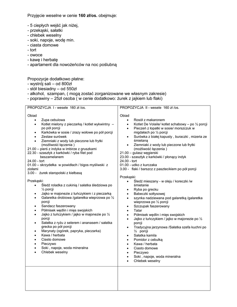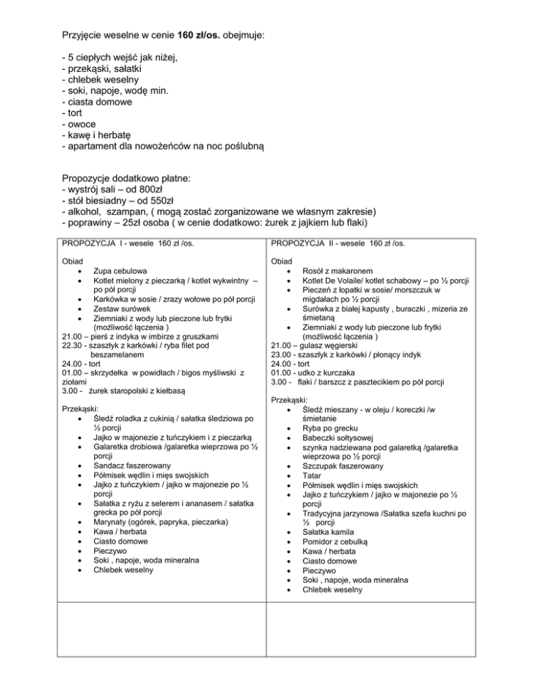 Przyjęcie weselne w cenie 160 zł/os. obejmuje: - 5 ciepłych wejść jak niżej, - przekąski, sałatki - chlebek weselny - soki, napoje, wodę min. - ciasta domowe - tort - owoce - kawę i herbatę - apartament dla nowożeńców na noc poślubną Propozycje dodatkowo płatne: - wystrój sali – od 800zł - stół biesiadny – od 550zł - alkohol, szampan, ( mogą zostać zorganizowane we własnym zakresie) - poprawiny – 25zł osoba ( w cenie dodatkowo: żurek z jajkiem lub flaki) PROPOZYCJA I - wesele 160 zł /os. PROPOZYCJA II - wesele 160 zł /os. Obiad Obiad Zupa cebulowa Kotlet mielony z pieczarką / kotlet wykwintny – po pół porcji Karkówka w sosie / zrazy wołowe po pół porcji Zestaw surówek Ziemniaki z wody lub pieczone lub frytki (możliwość łączenia ) 21.00 – pierś z indyka w imbirze z gruszkami 22.30 - szaszłyk z karkówki / ryba filet pod beszamelanem 24.00 - tort 01.00 – skrzydełka w powidłach / bigos myśliwski z ziołami 3.00 - żurek staropolski z kiełbasą Przekąski: Śledź roladka z cukinią / sałatka śledziowa po ½ porcji Jajko w majonezie z tuńczykiem i z pieczarką Galaretka drobiowa /galaretka wieprzowa po ½ porcji Sandacz faszerowany Półmisek wędlin i mięs swojskich Jajko z tuńczykiem / jajko w majonezie po ½ porcji Sałatka z ryżu z selerem i ananasem / sałatka grecka po pół porcji Marynaty (ogórek, papryka, pieczarka) Kawa / herbata Ciasto domowe Pieczywo Soki , napoje, woda mineralna Chlebek weselny Rosół z makaronem Kotlet De Volaile/ kotlet schabowy – po ½ porcji Pieczeń z łopatki w sosie/ morszczuk w migdałach po ½ porcji Surówka z białej kapusty , buraczki , mizeria ze śmietaną Ziemniaki z wody lub pieczone lub frytki (możliwość łączenia ) 21.00 – gulasz węgierski 23.00 - szaszłyk z karkówki / płonący indyk 24.00 - tort 01.00 - udko z kurczaka 3.00 - flaki / barszcz z pasztecikiem po pół porcji Przekąski: Śledź mieszany - w oleju / koreczki /w śmietanie Ryba po grecku Babeczki sołtysowej szynka nadziewana pod galaretką /galaretka wieprzowa po ½ porcji Szczupak faszerowany Tatar Półmisek wędlin i mięs swojskich Jajko z tuńczykiem / jajko w majonezie po ½ porcji Tradycyjna jarzynowa /Sałatka szefa kuchni po ½ porcji Sałatka kamila Pomidor z cebulką Kawa / herbata Ciasto domowe Pieczywo Soki , napoje, woda mineralna Chlebek weselny PROPOZYCJA III - wesele 160 zł /os. PROPOZYCJA IV - wesele 160 zł /os. Obiad Obiad Zupa warmińska z kluseczkami mięsnymi Udko z kurczaka w marynacie ziołowej/ kotlet ze szparagami – po pół porcji Schabowy/ pieczarka nadziewana mielonym po pół porcji Zestaw surówek Ziemniaki z wody lub pieczone lub frytki (możliwość łączenia ) 21.00 – strogonow 23.0 0 – ryba w panierce/ karkówka w sosie z kluskami śląskimi 24.00 - tort 01.00 – bigos z białą kiełbasą/ flaczki wołowe 3.00 - żurek staropolski z kiełbasą Przekąski: Śledź koreczki z oliwką / śledzie w oleju po ½ porcji Dzwonki pasztetu z ryby / kulki z sera Kubilej po ½ porcji Rolada z łososia ze szpinakiem Tatara na grzance / szynka pod galaretą po ½ porcji Półmisek wędlin i mięs swojskich Sałatka tradycyjna jarzynowa / sałatka szopska po pół porcji Warzywa świeże Sałatka królewska z kurczakiem, pomarańcza i orzechami Kawa / herbata Ciasto domowe Pieczywo Soki , napoje, woda mineralna Chlebek weselny Zupa rosół z makaronem Kotlet schabowy w sezamie / pierś indyka z gruszkami w imbirze – po pół porcji Karkówka w sosie / kotlet mielony z pieczarką po pół porcji Zestaw surówek Ziemniaki z wody lub pieczone lub frytki (możliwość łączenia ) 21.00 – gulasz węgierskim z czerwona fasolą 22.30 – pieczeń nadziewana cielęciną z kluskami śląskimi 24.00 - tort 01.00 – bigos myśliwski z ziołami 3.00 - barszczyk z pasztecikiem/ flaczki wołowe po ½ porcji Przekąski: Półmisek wędlin i mięs swojskich Śledź mieszany ( w oleju, w śmietanie) Ryba po grecku Jajko w majonezie z tuńczykiem i z pieczarką Ryba wędzona - pstrąg Ozory w galarecie/ galaretka wieprzowa po ½ porcji Sałatka kamila Ogórek konserwowy Warzywa świeże/ Sałatka z brokuła z jajkiem po pół porcji Kawa / herbata Ciasto domowe Pieczywo Soki , napoje, woda mineralna Chlebek weselny