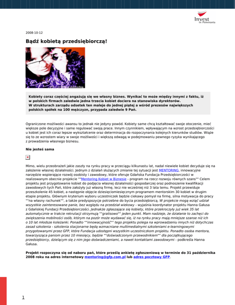 2008-10-12 Bądź kobietą przedsiębiorczą! Kobiety coraz częściej angażują się we własny biznes. Wynikać to może między innymi z faktu, iż w polskich firmach zaledwie jedna trzecia kobiet dociera na stanowiska dyrektorów. W strukturach zarządu odsetek ten maleje do jednej piątej a wśród prezesów największych polskich spółek na 100 mężczyzn, przypada zaledwie 9 Pań. Ograniczone możliwości awansu to jednak nie jedyny powód. Kobiety same chcą kształtować swoje otoczenie, mieć większe pole decyzyjne i same regulować swoją prace. Innym czynnikiem, wpływającym na wzrost przedsiębiorczości u kobiet jest ich coraz lepsze wykształcenie oraz determinacja do rozpoczynania kolejnych kierunków studiów. Wiąże się to ze wzrostem wiary w swoje możliwości i większą odwagą w podejmowaniu pewnego ryzyka wynikającego z prowadzenia własnego biznesu. Nie jesteś sama Mimo, wielu przeobrażeń jakie zaszły na rynku pracy w przeciągu kilkunastu lat, nadal niewiele kobiet decyduje się na założenie własnej działalności. Jednym z działań służących zmianie tej sytuacji jest MENTORING, innowacyjne narzędzie wspierające rozwój osobisty i zawodowy, które oferuje Gdańska Fundacja Przedsiębiorczości w realizowanym obecnie projekcie ""Mentoring Kobiet w Biznesie - program na rzecz rozwoju równych szans"" Celem projektu jest przygotowanie kobiet do podjęcia własnej działalności gospodarczej oraz podnoszenie kwalifikacji zawodowych tych Pań, które założyły już własną firmę, lecz nie wcześniej niż 3 lata temu. Projekt przewiduje przeszkolenie 45 kobiet, a następnie objęcie dziesięciomiesięcznym programem mentorskim 30 kobiet w drugim etapie projektu. Głównym kryterium wyboru uczestniczek będzie ciekawy pomysł na firmę, silna motywacja do pracy ""na własny rachunek"", a także predyspozycje potrzebne do bycia przedsiębiorcą. W projekcie mogą wziąć udział wszystkie zainteresowane panie, bez względu na przedział wiekowy - wyjaśnia koordynator projektu Hanna Gałusa z Gdańskiej Fundacji Przedsiębiorczości. Jednakże zgłaszające się kobiety, które przekroczyły już wiek 35 lat automatycznie w trakcie rekrutacji otrzymują ""gratisowo"" jeden punkt. Mam nadzieje, że działanie to zachęci do zwiększenia mobilności osób, którym na pozór może wydawać się, iż na rynku pracy mają mniejsze szanse niż ich o 10 lat młodsze koleżanki. Ponadto ""innowacyjność"" tego projektu polega na wprowadzeniu innych niż dotychczas zasad szkolenia - szkolenia stacjonarne będą wzmacniane multimedialnymi szkoleniami e-learningowymi przygotowanymi przez GFP, które Fundacja udostępni wszystkim uczestniczkom projektu. Ponadto osoba mentora, towarzysząca paniom przez 10 miesięcy, będzie ""doświadczonym przewodnikiem"" dla początkującego przedsiębiorcy, dzielącym się z nim jego doświadczeniami, a nawet kontaktami zawodowymi - podkreśla Hanna Gałusa. Projekt rozpoczyna się od naboru pań, które prześlą ankietę zgłoszeniową w terminie do 31 października 2008 roku na adres internetowy [email protected] lub adres pocztowy GFP. 1 Samochód, czy na pewno tylko męska rzecz? Kobiety coraz częściej wkraczają w branże dotychczas zarezerwowane tylko i wyłącznie dla mężczyzn. Dotyczy to takich dziedzin jak budownictwo, motoryzacja czy informatyka. Ciekawym przykładem tego jest motoryzacyjny portal internetowy dla kobiet, tworzony przez kobiety autopolki.pl. Kto lepiej zrozumie, opisze i wytłumaczy potrzeby i sposób postrzegania świata - w tym motoryzacji - przez kobiety, niż kobiety właśnie - zauważa redaktor naczelna portalu autopolki Beata Szozda. Należy uświadomić sobie, iż samochód nie jest jedynie męskim obiektem pożądania. Kobiety również wykazują bardzo duże zainteresowanie tą tematyką. Jednakże przy wyborze samochodu kierują się innymi kryteriami niż mężczyźni. Dla nas ważna jest funkcjonalność samochodu pod kątem jego bezpieczeństwa w przewożeniu dzieci czy liczby umieszczonych w nim schowków. Stworzenie portalu autopolki.pl było możliwe między innymi dzięki udziałowi w konkursie ""Pomysł na Biznes"" organizowanemu przez Poznański Park Naukowo Technologiczny Fundacji Uniwersytetu Adama Mickiewicza - wyjaśnia redaktor naczelna portalu autopolki.pl Wystarczy uwierzyć w siebie Każda z nas może być kobietą przedsiębiorczą. Nie obowiązuje tu ograniczenie wieku czy wykształcenia. Liczy się dobry pomysł i determinacja w zrealizowaniu postawionych sobie celów. Portal motoryzacyjny autopolki.pl czy projekty realizowane w przyszłości w ramach ""Mentoringu Kobiet w Biznesie"" są tylko jednymi z wielu przykładów potwierdzających regułę, że kobiety mogą odnaleźć się na rynku pracy jako doskonali przedsiębiorcy. Magdalena Wroniak Autor MW 2