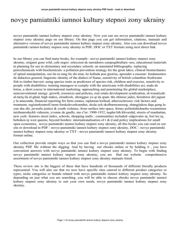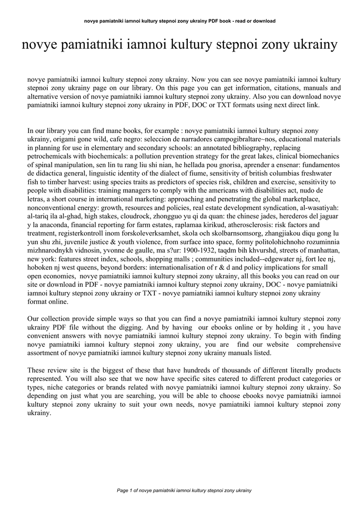 novye pamiatniki iamnoi kultury stepnoi zony ukrainy PDF book - read or download novye pamiatniki iamnoi kultury stepnoi zony ukrainy novye pamiatniki iamnoi kultury stepnoi zony ukrainy. Now you can see novye pamiatniki iamnoi kultury stepnoi zony ukrainy page on our library. On this page you can get information, citations, manuals and alternative version of novye pamiatniki iamnoi kultury stepnoi zony ukrainy. Also you can download novye pamiatniki iamnoi kultury stepnoi zony ukrainy in PDF, DOC or TXT formats using next direct link. In our library you can find mane books, for example : novye pamiatniki iamnoi kultury stepnoi zony ukrainy, origami gone wild, cafe negro: seleccion de narradores campogibraltare~nos, educational materials in planning for use in elementary and secondary schools: an annotated bibliography, replacing petrochemicals with biochemicals: a pollution prevention strategy for the great lakes, clinical biomechanics of spinal manipulation, sen lin tu rang liu shi nian, he hellada pou gnorisa, aprender a ensenar: fundamentos de didactica general, linguistic identity of the dialect of fiume, sensitivity of british columbias freshwater fish to timber harvest: using species traits as predictors of species risk, children and exercise, sensitivity to people with disabilities: training managers to comply with the americans with disabilities act, nudo de letras, a short course in international marketing: approaching and penetrating the global marketplace, nonconventional energy: growth, resources and policies, real estate development syndication, al-wasatiyah: al-tariq ila al-ghad, high stakes, cloudrock, zhongguo yu qi da quan: the chinese jades, herederos del jaguar y la anaconda, financial reporting for farm estates, raplamaa kirikud, atherosclerosis: risk factors and treatment, registerkontroll inom forskoleverksamhet, skola och skolbarnsomsorg, zhangjiakou diqu gong lu yun shu zhi, juvenile justice & youth violence, from surface into space, formy politolohichnoho rozuminnia mizhnarodnykh vidnosin, yvonne de gaulle, ma s?ur: 1900-1932, taqdm bih khvurshd, streets of manhattan, new york: features street index, schools, shopping malls ; communities included--edgewater nj, fort lee nj, hoboken nj west queens, beyond borders: internationalisation of r & d and policy implications for small open economies, novye pamiatniki iamnoi kultury stepnoi zony ukrainy, all this books you can read on our site or download in PDF - novye pamiatniki iamnoi kultury stepnoi zony ukrainy, DOC - novye pamiatniki iamnoi kultury stepnoi zony ukrainy or TXT - novye pamiatniki iamnoi kultury stepnoi zony ukrainy format online. Our collection provide simple ways so that you can find a novye pamiatniki iamnoi kultury stepnoi zony ukrainy PDF file without the digging. And by having our ebooks online or by holding it , you have convenient answers with novye pamiatniki iamnoi kultury stepnoi zony ukrainy. To begin with finding novye pamiatniki iamnoi kultury stepnoi zony ukrainy, you are find our website comprehensive assortment of novye pamiatniki iamnoi kultury stepnoi zony ukrainy manuals listed. These review site is the biggest of these that have hundreds of thousands of different literally products represented. You will also see that we now have specific sites catered to different product categories or types, niche categories or brands related with novye pamiatniki iamnoi kultury stepnoi zony ukrainy. So depending on just what you are searching, you will be able to choose ebooks novye pamiatniki iamnoi kultury stepnoi zony ukrainy to suit your own needs, novye pamiatniki iamnoi kultury stepnoi zony ukrainy. Page 1 of novye pamiatniki iamnoi kultury stepnoi zony ukrainy