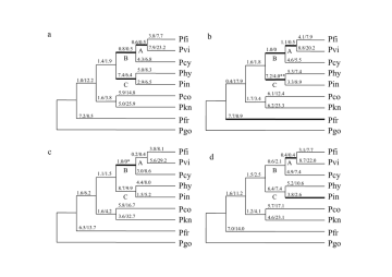 a 3.8/7.7 0.6/0.5 0.8/0.5 A 7.9/23.2 1.4/1.9 B 4.3/6.8 7.4/6.4 1.0/12.2 2.9/6.5 C 1.6/3.8 5.0/8.3 5.9/14.8 b 7.2/8.5 1.0/0 Pcy Phy Pin 1.6/1.8 0.2/0.4 1.0/0* 1.1/1.5 B A 3.8/8.1 5.6/29.2 3.0/8.6 4.4/8.0 8.7/9.9 1.6/6.2 C 5.8/16.7 1.6/4.2 3.6/32.7 1.5/5.2 Pfi Pvi Pcy Phy Pin C 1.7/3.4 A 4.1/7.9 8.8/20.2 4.6/5.5 5.3/7.4 3.3/8.9 6.1/12.4 7.7/0.9 Pcy Phy Pin Pfr Pgo 3.1/7.7 0.4/0.4 0.6/2.1 A 8.7/22.0 d 1.5/2.5 B 6.4/7.4 1.6/11.2 C 1.2/4.1 5.7/17.1 4.6/23.1 7.0/14.0 Pfi Pvi Pco Pkn 6.2/23.3 Pco Pkn Pfr Pgo B 7.2/4.0** 0.4/17.9 Pfr Pgo c 1.1/0.5 Pco Pkn 5.0/25.9 6.5/13.7 Pfi Pvi 4.9/7.4 5.2/10.6 3.8/2.6 Pfi Pvi Pcy Phy Pin Pco Pkn Pfr Pgo