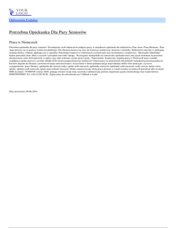 Ogłoszenia Łódzkie Potrzebna Opiekunka Dla Pary Seniorów Praca w Niemczech Potrzebna opiekunka dla pary seniorów Poszukujemy osób chętnych do podjęcia pracy w charakterze opiekunki dla małżeństwa: Pani Anna i Pana Hermana. Pani Anna porusza się za pomocą wózka inwalidzkiego. Pan Herman porusza się sam, ale trzeba go asekurować, korzysta z chodzika. Małżeństwo mieszka w spokojnej, zielonej okolicy. Chętnie spędzają czas w ogrodzie. Potrzebują wsparcia w codziennych czynnościach oraz zrozumienia i cierpliwości. Obowiązki: Opiekunka będzie prowadzić dom, dbać o czystość i porządek oraz robić zakupy. Wymagania: Kandydatka na stanowisko opiekunki musi znać język minimum na poziomie dostatecznym, mieć doświadczenie w opiece oraz mile widziane czynne prawo jazdy. Zapewniamy: bezpieczną i legalną pracę w Niemczech jasne warunki współpracy (jedna umowa!) wysokie składki ZUS (od przeciętnej krajowej) możliwość wyboru pracy na niemieckich lub polskich warunkach gwarancję pokrycia kosztów dojazdu do Niemiec i powrotu do kraju zakwaterowanie i wyżywienie w domu podopiecznego indywidualny dobór ofert atrakcyjne i uczciwe wynagrodzenie praca Niemcy, opiekunka dla starszej osoby, opieka osób starszych, opiekunka starszych, opiekunki osób starszych, osoby starsze, ludzie starsi, opieka, opiekun osób starszych, opieka nad osobami starszymi Osoby zainteresowane ofertą pracy prosimy o e-mail zwrotny na [email protected] albo wysłanie SMS na numer: 797898769 o treści: 6836 podając również swoje imię, nazwisko i deklarowany poziom znajomości języka niemieckiego oraz województwo. ODDZWONIMY Tel.:+48 42 636 50 90 Zapraszamy do odwiedzenia nas! Oddział w Łodzi Date utworzenia: 09-06-2016