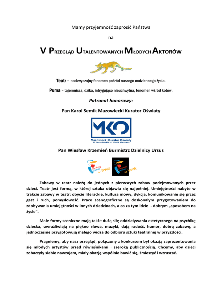 Mamy przyjemność zaprosić Państwa na V PRZEGLĄD UTALENTOWANYCH MŁODYCH AKTORÓW Teatr – nadzwyczajny fenomen pośród naszego codziennego życia. Puma – tajemnicza, dzika, intrygująco nieuchwytna, fenomen wśród kotów. Patronat honorowy: Pan Karol Semik Mazowiecki Kurator Oświaty Pan Wiesław Krzemień Burmistrz Dzielnicy Ursus Zabawy w teatr należą do jednych z pierwszych zabaw podejmowanych przez dzieci. Teatr jest formą, w której sztuka objawia się najpełniej. Umiejętności nabyte w trakcie zabawy w teatr: obycie literackie, kultura mowy, dykcja, komunikowanie się przez gest i ruch, pomysłowość. Prace scenograficzne są doskonałym przygotowaniem do zdobywania umiejętności w innych dziedzinach, a co za tym idzie - dobrym „sposobem na życie”. Małe formy sceniczne mają także dużą siłę oddziaływania estetycznego na psychikę dziecka, uwrażliwiają na piękno słowa, muzyki, dają radość, humor, dobrą zabawę, a jednocześnie przygotowują małego widza do odbioru sztuki teatralnej w przyszłości. Pragniemy, aby nasz przegląd, połączony z konkursem był okazją zaprezentowania się młodych artystów przed rówieśnikami i szeroką publicznością. Chcemy, aby dzieci zobaczyły siebie nawzajem, miały okazję wspólnie bawić się, śmieszyć i wzruszać. Termin Przeglądu: 06.06.2013 w godzinach 9.00-15.30 /w przypadku dużej ilości zgłoszeń również 05.06.2013r./. Ze względu na możliwości organizacyjne przedszkola oraz dziecięcą widownię możemy zaprosić maksymalnie 20 grup. Decyduje kolejność zgłoszeń. Uroczysta Gala 12.06.2013 r. w Ośrodku Kultury Arsus w godz. 10.00-11.30 Organizator: Przedszkole nr 343, ul. Warszawska 53 02-495 Warszawa www.przedszkole343.waw.pl [email protected] REGULAMIN: 1. Cel konkursu: Z pośród ogromnej ilości celów tego wydarzenia i walorów natury psychologicznej i pedagogicznej, oczywistych dla każdego nauczyciela pracującego z dziećmi w wieku przedszkolnym szczególnie wyeksponować pragniemy: Stwarzanie dzieciom okazji do: 1) Szukania własnego wyrazu oddającego przeżycia, emocje, doświadczenia życiowe oraz jednoczesnego wzbogacania go o nowe elementy nabyte w toku obserwacji, działania i kontaktu z innymi ludźmi. 2) Rozładowywania napięć psychicznych i wchodzenia w różnorodny, wymarzony świat ról i nastrojów często odmiennych od rzeczywistości, w której żyją na co dzień. 3) Korygowania mikrodefektów (ruchu, wymowy). 4) Doskonalenia spostrzegawczości i uczenia się dokładnej obserwacji. Uzasadniania postępowania własnego i bohatera, wyciągania wniosków i rozumowania podczas odtwarzania ról różnymi technikami. 5) Rozwijania orientacji w czasie i przestrzeni. 6) Przygotowywania się do roli przyszłych widzów teatru. 7) Dobrej zabawy w gronie rówieśników. 2. Uczestnicy konkursu. Konkurs przeznaczony jest wyłącznie dla dzieci uczęszczających do przedszkoli (3-6 lat), zarówno dla grup mieszanych jak też jednolitych wiekowo – maksymalnie 25 osób. Prosimy, aby w tym przeglądzie aktorami nie były osoby dorosłe. Z każdego przedszkola może być zgłoszona tylko jedna grupa dzieci. Ze względów organizacyjnych na przegląd, który odbywa się w przedszkolu oraz młodą widownię możemy zaprosić maksymalnie 20 grup. Decyduje kolejność zgłoszeń. 3. Repertuar. Treść i forma spektakli są dowolne. 4. Czas prezentacji spektaklu. Maksymalnie 20 minut. Ze względu na komfort widowni dziecięcej, organizatorzy proszą o nie przekraczanie czasu prezentacji. Przekroczenie maksymalnego czasu prezentacji skutkuje odjęciem punktów. 5. Kryteria oceny. 1) Struktura przedstawienia (interakcja, zbudowanie sytuacji scenicznych, dialogów pomiędzy postaciami, wykreowanie ról) 2) Warsztat aktorski: interpretacja tekstu, ruch, dykcja (w zakresie możliwości dzieci przedszkolnych) 3) Oprawa muzyczna, oprawa plastyczna, scenografia, kostium 4) Adaptacja i wykorzystanie przestrzeni scenicznej 5) Treść jako przekaz istotnych emocji, wartości i spostrzeżeń 6) Szukanie nowych, niebanalnych form wyrazu artystycznego 6. Terminy. Zgłoszenia przyjmujemy do 15.05.2013r. do godziny 12.00 drogą elektroniczną [email protected], [email protected] lub osobiście u organizatorów pani Marii Prokopiuk oraz u pani Iwony Prugar – Fiedorowicz. Występy odbędą się w Przedszkolu nr 343 – 06.06.2013r. - w przypadku bardzo dużej ilości zgłoszeń – również 05.06.2013r. w godzinach 9.00 do 15.30 Po otrzymaniu kart zgłoszeń, telefonicznie oraz elektronicznie zawiadomimy o godzinie występu. Po zakończeniu obrad jury telefonicznie i elektronicznie powiadomimy nominowane grupy, aby mogły odpowiednio przygotować się do występu podczas uroczystego ogłoszenia wyników i wręczenia nagród. Ogłoszenie wyników oraz prezentacja zwycięskiego spektaklu odbędą się 12.06.2013r. w godz. 10.00-11.30 w Ośrodku Kultury Arsus ul Traktorzystów 14, 02-495 Warszawa Ursus. Najlepsi z młodych aktorów będą mieli okazję zaprezentować się na wielkiej scenie w blasku reflektorów, z użyciem mikrofonów. Przygotowując występ warto więc przyzwyczaić dzieci do korzystania z mikrofonu (nie przewidujemy prób przed występem w Arsusie ☺). 7. Organizatorzy zapewniają: 1) Nagłośnienie, mikrofony, pianino, odtwarzacz CD 2) Dyplomy i drobne pamiątki dla każdej z występujących grup oraz dyplomy dla opiekunów, 3) Nagrody dla najwyżej ocenionych grup- Złota, Srebrna, Brązowa P.U.M.A., bilety do teatru / maksymalnie 25 sztuk/, zestaw do zabaw teatralnych, mini teatrzyk, 4) Drobne niespodzianki za wyróżnienia zespołowe i indywidualne za kreacje aktorskie i reżyserię. 5) Możliwość obejrzenia dwóch spektakli w wykonaniu koleżanek i kolegów. 8. Jury Przeglądu. - Pani Dorota Latos – trener, coach, wielokrotnie związana z filmem i z teatrem jako aktorka, reżyser, autor scenariuszy, juror i koordynator projektów teatralnych, m.in. Mazowieckiego Przeg