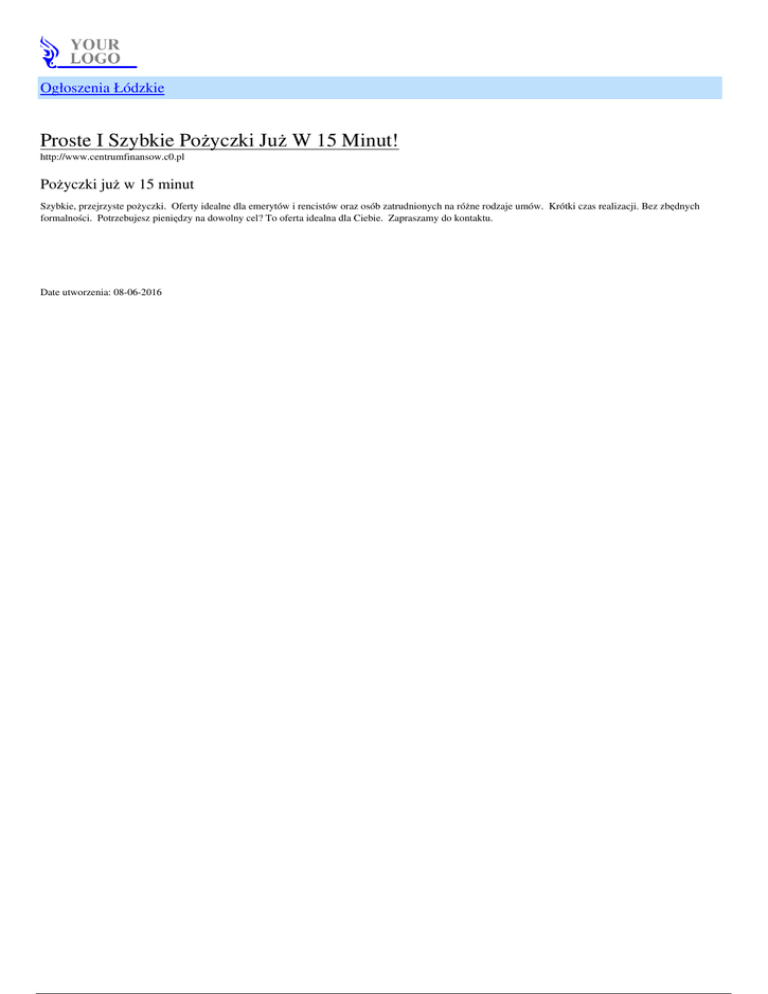Ogłoszenia Łódzkie Proste I Szybkie Pożyczki Już W 15 Minut! http://www.centrumfinansow.c0.pl Pożyczki już w 15 minut Szybkie, przejrzyste pożyczki. Oferty idealne dla emerytów i rencistów oraz osób zatrudnionych na różne rodzaje umów. Krótki czas realizacji. Bez zbędnych formalności. Potrzebujesz pieniędzy na dowolny cel? To oferta idealna dla Ciebie. Zapraszamy do kontaktu. Date utworzenia: 08-06-2016