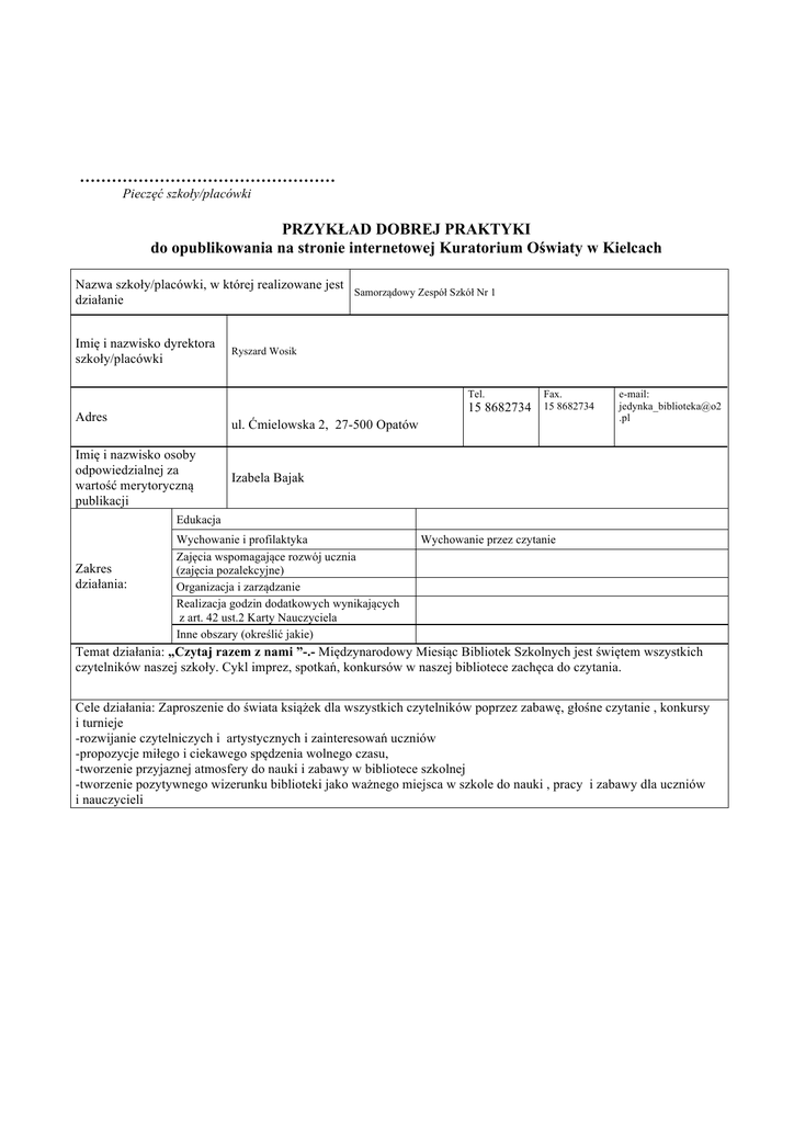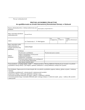 ………………………………………… Pieczęć szkoły/placówki PRZYKŁAD DOBREJ PRAKTYKI do opublikowania na stronie internetowej Kuratorium Oświaty w Kielcach Nazwa szkoły/placówki, w której realizowane jest Samorządowy Zespół Szkół Nr 1 działanie Imię i nazwisko dyrektora szkoły/placówki Ryszard Wosik Tel. Fax. 15 8682734 15 8682734 Adres ul. Ćmielowska 2, 27-500 Opatów Imię i nazwisko osoby odpowiedzialnej za wartość merytoryczną publikacji e-mail: jedynka_biblioteka@o2 .pl Izabela Bajak Edukacja Zakres działania: Wychowanie i profilaktyka Zajęcia wspomagające rozwój ucznia (zajęcia pozalekcyjne) Organizacja i zarządzanie Realizacja godzin dodatkowych wynikających z art. 42 ust.2 Karty Nauczyciela Inne obszary (określić jakie) Wychowanie przez czytanie Temat działania: „Czytaj razem z nami ”-.- Międzynarodowy Miesiąc Bibliotek Szkolnych jest świętem wszystkich czytelników naszej szkoły. Cykl imprez, spotkań, konkursów w naszej bibliotece zachęca do czytania. Cele działania: Zaproszenie do świata książek dla wszystkich czytelników poprzez zabawę, głośne czytanie , konkursy i turnieje -rozwijanie czytelniczych i artystycznych i zainteresowań uczniów -propozycje miłego i ciekawego spędzenia wolnego czasu, -tworzenie przyjaznej atmosfery do nauki i zabawy w bibliotece szkolnej -tworzenie pozytywnego wizerunku biblioteki jako ważnego miejsca w szkole do nauki , pracy i zabawy dla uczniów i nauczycieli Opis działania: Przez cały miesiąc październik trwają obchody Święta Biblioteki Szkolnej. W naszej szkole obchodzimy je po raz siódmy pod hasłem „Różnorodność, energia, wyzwania-oto biblioteka szkolna” Tegoroczne święto rozpoczyna uroczyste otwarcie obchodów przez Dyrektora Szkoły w czasie spotkania w bibliotece dla pierwszoklasistów, którzy zaproszeni do „Królestwa bajki i baśni”, stają się w tym dniu czytelnikami biblioteki. Kolejne wydarzenie to czytelnicze zabawy w bibliotece. Uczniowie szkoły podstawowej uczestniczą w czytelniczej loterii fantowej, oraz bajkowej zgaduj-zgaduli.Za każdą prawidłową odpowiedź na pytania dotyczące lektur i książek uczniowie wygrywają maskotki, przybory szkolne, słodycze pozyskane od sponsorów. Uczniowie biorą udział w konkursach z nagrodami: turnieju jednego wiersza –rymowanki o bibliotece i czytaniu oraz konkursie na zakładkę do książki. Uczniowie klas II i III uczestniczą w spotkaniu z głośnym czytaniem książki „Dziadek i Niedźwiadek”. Książkę czytają zaproszeni kombatanci z miejsko-gminnego związku kombatantów. Spotkanie jest urozmaicone wspólnym śpiewaniem pieśni żołnierskich. Uczniowie klas IV-VI w czasie godzin wychowawczych mają możliwość wysłuchania słuchowiska pt. „Muzyka Pana Chopina”. Te zajęcia mają zachęcić uczniów do udziału w konkursach: ogólnopolskim konkursie literacko plastycznym „Dlaczego miś Wojtek” oraz międzyszkolnym konkursie literacko- plastycznym „Muzyka Pana Chopina.”Uczestnicy spotkań i konkursów otrzymują pamiątkowe zakładki przekazane przez Fundację ABCXI- „Cała Polska czyta dzieciom” W naszej bibliotece odbywa się konkurs dla naszych najmłodszych czytelników zorganizowany przez Powiatową i Miejsko- Gminną Bibliotekę Publiczną pt. „Czytaj szybko i ze zrozumieniem”. Miesiąc Bibliotek jest okazją do nauki i zabawy dla czytelników bibliotek, także tych którzy odwiedzają ją bardzo rzadko. Droga do biblioteki zostaje oznaczona specjalnymi „dymkami książkowymi”. Są to chmurki z ilustracjami do bajek i fragmentami wiersza, które czytane kolejno prowadzą czytelników do biblioteki. W szkole i bibliotece rozwieszamy plakaty Fundacji ABCXI zachęcające do czytania oraz cytaty powiedzonek znanych bohaterów książkowych. W organizacji konkursów, imprez i spotkań aktywnie uczestniczą uczniowie z Koła Przyjaciół Biblioteki oraz inni nauczyciele. Wszystkie wydarzenia są uprzednio ogłaszane a następnie relacjonowane na bieżąco na stronie internetowej biblioteki. /www.biblioteka_opatow.eu. interia.pl/ Opis uzyskanych efektów: Uczniowie i nauczyciele postrzegają bibliotekę jako ważne miejsce w szkole, pomocne we własnej edukacji Zachęcani do czytania uczestniczą w ciekawych formach zajęć, czytanie staje się dobrym nawykiem oraz pomaga w rozwoju emocjonalnym, tworząc właściwe wzorce zachowania oraz niwelując zachowania niepożądane. Zachęta do udziału w konkursach powoduje wzrost czytelnictwa i okazję do rozwijania własnych zainteresowań. Różnorodne formy działań rozwijają u potencjalnych czytelników pozytywne skojarzenia z czytaniem Uczestnicy zabaw czytelniczych i spotkań uczą się właściwych wzorców spędzania wolnego czasu i odnoszenia się z szacunkiem do innych, nauczycieli i siebie nawzajem. Uczestniczą w szkolnych wydarzeniach okolicznościowych oraz je tworzą / np. pasowanie na czytelnika pierwszoklasistów/ . Uczestniczą i tworzą dobre tradycje szkoły /np. w postaci rocznicowych obchodów w ciągu roku, każde spotkanie ma określoną tematykęw tym roku obchody ważnych rocznic historycznych –głośne czytanie na spotkaniu z kombatantami/ Wnioski z realizacji: Podejmowane przez bibliotekę działania spotykają się z zainteresowaniem uczniów, nauczycieli, rodziców a niekiedy z entuzjazmem czytelników biblioteki. W związku z tym zachęcają do dobrych działań przez cały rok. Biblioteka zyskuje nowych czytelników i sympatyków. Tworzy pozytywny wizerunek w szkole i poza nią, staje się miejscem właściwym dla edukacji, rozwijania zainteresowań i ciekawego spędzania czasu wolnego. Dzięki naszym czytelnikom rozwijamy swoją aktywność do podejmowania coraz to nowych wyzwań czy zdobywania sponsorów Instytucje wspomagające realizację podjętych działań: W organizacji zabaw czytelniczych wspomagają nas lokalni sponsorzy: właściciele firm i sklepów. W popularyzacji 