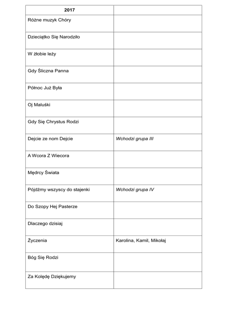 2017 Różne muzyk Chóry Dzieciątko Się Narodziło W żłobie leży Gdy Śliczna Panna Północ Już Była Oj Maluśki Gdy Się Chrystus Rodzi Dejcie ze nom Dejcie Wchodzi grupa III A Wcora Z Wiecora Mędrcy Świata Pójdźmy wszyscy do stajenki Wchodzi grupa IV Do Szopy Hej Pasterze Dlaczego dzisiaj Życzenia Bóg Się Rodzi Za Kolędę Dziękujemy Karolina, Kamil, Mikołaj