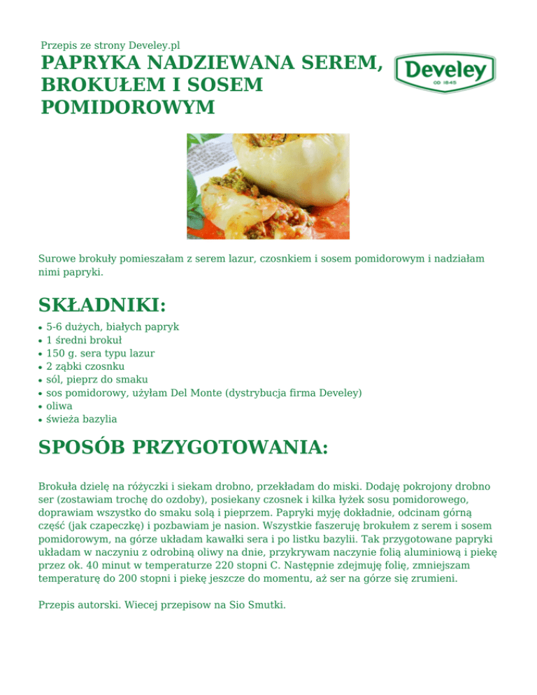 Przepis ze strony Develey.pl PAPRYKA NADZIEWANA SEREM, BROKUŁEM I SOSEM POMIDOROWYM Surowe brokuły pomieszałam z serem lazur, czosnkiem i sosem pomidorowym i nadziałam nimi papryki. SKŁADNIKI: ● ● ● ● ● ● ● ● 5-6 dużych, białych papryk 1 średni brokuł 150 g. sera typu lazur 2 ząbki czosnku sól, pieprz do smaku sos pomidorowy, użyłam Del Monte (dystrybucja firma Develey) oliwa świeża bazylia SPOSÓB PRZYGOTOWANIA: Brokuła dzielę na różyczki i siekam drobno, przekładam do miski. Dodaję pokrojony drobno ser (zostawiam trochę do ozdoby), posiekany czosnek i kilka łyżek sosu pomidorowego, doprawiam wszystko do smaku solą i pieprzem. Papryki myję dokładnie, odcinam górną część (jak czapeczkę) i pozbawiam je nasion. Wszystkie faszeruję brokułem z serem i sosem pomidorowym, na górze układam kawałki sera i po listku bazylii. Tak przygotowane papryki układam w naczyniu z odrobiną oliwy na dnie, przykrywam naczynie folią aluminiową i piekę przez ok. 40 minut w temperaturze 220 stopni C. Następnie zdejmuję folię, zmniejszam temperaturę do 200 stopni i piekę jeszcze do momentu, aż ser na górze się zrumieni. Przepis autorski. Wiecej przepisow na Sio Smutki.