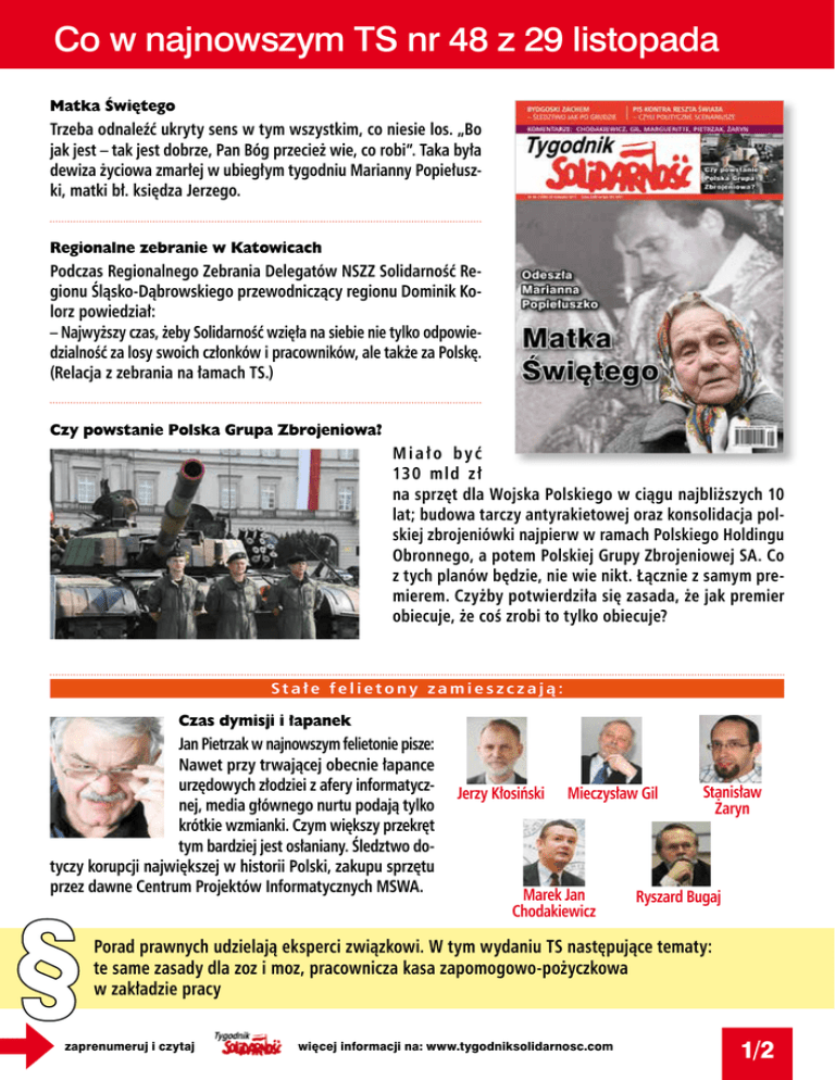 Co w najnowszym TS nr 48 z 29 listopada Matka Świętego Trzeba odnaleźć ukryty sens w tym wszystkim, co niesie los. „Bo jak jest – tak jest dobrze, Pan Bóg przecież wie, co robi”. Taka była dewiza życiowa zmarłej w ubiegłym tygodniu Marianny Popiełuszki, matki bł. księdza Jerzego. Regionalne zebranie w Katowicach Podczas Regionalnego Zebrania Delegatów NSZZ Solidarność Regionu Śląsko-Dąbrowskiego przewodniczący regionu Dominik Kolorz powiedział: – Najwyższy czas, żeby Solidarność wzięła na siebie nie tylko odpowiedzialność za losy swoich członków i pracowników, ale także za Polskę. (Relacja z zebrania na łamach TS.) Czy powstanie Polska Grupa Zbrojeniowa? Miało być 130 mld z ł na sprzęt dla Wojska Polskiego w ciągu najbliższych 10 lat; budowa tarczy antyrakietowej oraz konsolidacja polskiej zbrojeniówki najpierw w ramach Polskiego Holdingu Obronnego, a potem Polskiej Grupy Zbrojeniowej SA. Co z tych planów będzie, nie wie nikt. Łącznie z samym premierem. Czyżby potwierdziła się zasada, że jak premier obiecuje, że coś zrobi to tylko obiecuje? St ałe felietony zamieszc zają: Czas dymisji i łapanek Jan Pietrzak w najnowszym felietonie pisze: Nawet przy trwającej obecnie łapance urzędowych złodziei z afery informatycznej, media głównego nurtu podają tylko krótkie wzmianki. Czym większy przekręt tym bardziej jest osłaniany. Śledztwo dotyczy korupcji największej w historii Polski, zakupu sprzętu przez dawne Centrum Projektów Informatycznych MSWA. Jerzy Kłosiński Mieczysław Gil Marek Jan Chodakiewicz Stanisław Żaryn Ryszard Bugaj Porad prawnych udzielają eksperci związkowi. W tym wydaniu TS następujące tematy: te same zasady dla zoz i moz, pracownicza kasa zapomogowo-pożyczkowa w zakładzie pracy zaprenumeruj i czytaj więcej informacji na: www.tygodniksolidarnosc.com 1/2 Co w najnowszym TS nr 49 z 29 listopada Powrót do przeszłości Lekarze rodzinni alarmują, że minister zdrowia Bartosz Arłukowicz chce cofnąć o 15 lat podstawową opiekę zdrowotną i zamiast naprawiać ten system niszczy go. Ich zdaniem państwo, chociaż nie ma pieniędzy na zdrowie, stawia na wąską specjalizację i medycynę naprawczą, droższą niż profilaktyka, czym się w dużym stopniu zajmuje medycyna rodzinna. Śledztwo jak po grudzie Śledztwo w sprawie działania na szkodę bydgoskich Zakładów Chemicznych Zachem idzie jak po grudzie. Zawiadomienie o możliwości popełnienia przestępstwa przez członków zarządów zakładów Zachem SA i jego właściciela CIECH SA, zakładowa Solidarność złożyła w połowie września ubiegłego roku. To sporo czasu, żeby w sprawie coś się zadziało. Tymczasem do dziś nie mają żadnej informacji na ten temat. Czy śledztwo trwa, czy nie, czy są postawione jakieś zarzuty, wobec kogo itp., wnioskodawcy nie wiedzą. A sprawa jest niebagatelna, dotyczy przekrętów na wielomilionowe sumy. Spełniliśmy życzenie płk. Cieplińskiego W styczniu 1951 roku, w grypsie z celi śmierci, płk Łukasz Ciepliński, prezes IV Zarządu Głównego Zrzeszenia Wolność i Niezawisłość pisał do swego trzyletniego synka: „Odbiorą mi tylko życie. A to nie najważniejsze. Cieszę się, że będę zamordowany jako katolik za wiarę świętą, jako Polak za Polskę niepodległą i szczęśliwą, jako człowiek za prawdę i sprawiedliwość. Wierzę dziś bardziej niż kiedykolwiek, że idea Chrystusowa zwycięży i Polska niepodległość odzyska, a pohańbiona godność ludzka zostanie przywrócona”. Gryps z tymi słowami stał się jednym z elementów pomnika, odsłoniętego i poświęconego w Rzeszowie 17 listopada 2013 roku. Biznes aborcyjny uspokaja sumienia Ci, co po nas przyjdą, będą budować muzea aborcji, tak jak my budujemy muzea Holokaustu. I nie będą mogli zrozumieć, jak to jest, że zwyczajni, uczciwi ludzie akceptowali zbrodnię, która toczyła się na ich oczach – mówi Tomasz Terlikowski w rozmowie z Jakubem Jałowiczorem na łamach TS. Ponadto w każdym numerze oprócz tematyki związkowej i społecznej: gospodarka, historia, kultura, sport, krzyżówka i wiele więcej... zaprenumeruj i czytaj więcej informacji na: www.tygodniksolidarnosc.com 2/2