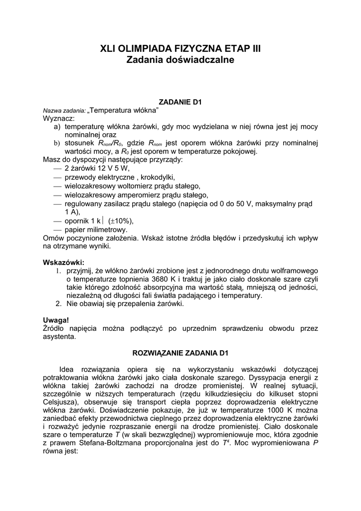 XLI OLIMPIADA FIZYCZNA ETAP III Zadania doświadczalne ZADANIE D1 Nazwa zadania: „Temperatura włókna” Wyznacz: a) temperaturę włókna żarówki, gdy moc wydzielana w niej równa jest jej mocy nominalnej oraz b) stosunek Rnom/R0, gdzie Rnom jest oporem włókna żarówki przy nominalnej wartości mocy, a R0 jest oporem w temperaturze pokojowej. Masz do dyspozycji następujące przyrządy: 2 żarówki 12 V 5 W, przewody elektryczne , krokodylki, wielozakresowy woltomierz prądu stałego, wielozakresowy amperomierz prądu stałego, regulowany zasilacz prądu stałego (napięcia od 0 do 50 V, maksymalny prąd 1 A), opornik 1 kΩ (±10%), papier milimetrowy. Omów poczynione założenia. Wskaż istotne źródła błędów i przedyskutuj ich wpływ na otrzymane wyniki. Wskazówki: 1. przyjmij, że włókno żarówki zrobione jest z jednorodnego drutu wolframowego o temperaturze topnienia 3680 K i traktuj je jako ciało doskonale szare czyli takie którego zdolność absorpcyjna ma wartość stałą, mniejszą od jedności, niezależną od długości fali światła padającego i temperatury. 2. Nie obawiaj się przepalenia żarówki. Uwaga! Źródło napięcia można podłączyć po uprzednim sprawdzeniu obwodu przez asystenta. ROZWIĄZANIE ZADANIA D1 Idea rozwiązania opiera się na wykorzystaniu wskazówki dotyczącej potraktowania włókna żarówki jako ciała doskonale szarego. Dyssypacja energii z włókna takiej żarówki zachodzi na drodze promienistej. W realnej sytuacji, szczególnie w niższych temperaturach (rzędu kilkudziesięciu do kilkuset stopni Celsjusza), obserwuje się transport ciepła poprzez doprowadzenia elektryczne włókna żarówki. Doświadczenie pokazuje, że już w temperaturze 1000 K można zaniedbać efekty przewodnictwa cieplnego przez doprowadzenia elektryczne żarówki i rozważyć jedynie rozpraszanie energii na drodze promienistej. Ciało doskonale szare o temperaturze T (w skali bezwzględnej) wypromieniowuje moc, która zgodnie z prawem Stefana-Boltzmana proporcjonalna jest do T4. Moc wypromieniowana P równa jest: P = σ ' (T 4 − T04 ), (1) Gdzie s’- jest pewną efektywną stałą Stefana Boltzmana, a T0 jest temperaturą otoczenia. Dla wysokich temperatur można pominąć składnik T04. Zakładając, że całość mocy elektrycznej P doprowadzonej do włókna żarówki (P=UI, gdzie U napięcie na żarówce, a I to płynący przez nią prąd) jest rozpraszana na drodze promienistej otrzymujemy związek: T ~ 4 UI . (2) Wykorzystując sugestie ze wskazówki nr 2, żeby nie obawiać się przepalenia żarówki należy doprowadzić do tego notując moc P’ przy której to następuje. Zakładając, że żarówka przepala się gdy włókno osiągnie temperaturę topnienia wolframu można przyporządkować T=3680 K mocy, przy której następuje przepalenie, a następnie poprzez prostą proporcje obliczyć temperaturę włókna Tnom gdy moc wydzielana w nim jest równa mocy nominalnej Pnom=5 W. T nom= 36804 ( Pnom / P' ) . Oporność włókna żarówki w warunkach gdy zasilana jest mocą nominalną wyliczamy z prawa Ohma dzieląc napięcie U przez prąd I płynący przez włókno. Doświadczenie sprowadza się do pomiaru charakterystyki prądowo – napięciowej włókna żarówki. Należy szczególnie dokładnie zmierzyć ją w zakresie najniższych napięć aby móc ekstrapolować oporność włókna dla napięcia równego 0 V. Już dla napięcia na włóknie żarówki rzędu kilkunastu do kilkudziesięciu mV zaczyna się ono grzać co manifestuje się znacznym wzrostem jego oporu. Do pomiarów w tym zakresie napięć należy zestawić obwód pokazany na ryc. 4. V R Ż mA + - Ryc.4. Obwód elektryczny do pomiaru charakterystyki prądowo – napięciowej w zakresie najniższych napięć przykładanych do włókna żarówki. Opornik R=1 kΩ służy do ograniczenia prądu płynącego przez włókno, a przez to samo pomiar prądu przy minimalnym napięciu na włóknie. Zasilacze umożliwiały ustawienie minimalnego napięcia, które było co najmniej kilkanaście razy większe niż to, przy którym następuje widoczne grzanie się włókna żarówki. Stąd konieczność wstawienia dodatkowego opornika. Pomiary napięcia przeprowadzonego woltomierzem cyfrowym o oporze wewnętrznym rzędu MΩ i zakresie umożliwiającym odczyt napięcia z dokładnością do setnych mV. Zależność oporności włókna żarówki z partii żarówek ukrytej w finale dla najmniejszych napięć przedstawiona jest na ryc. 5. 3,6 3,5 3,4 opór [om] 3,3 3,2 3,1 3 2,9 2,8 0 10 20 30 40 50 60 70 80 90 100 napęcie [mV] Ryc. 5. Zależność oporności włókna żarówki (z partii żarówek użytej w finale) jako funkcja przyłożonego napięcia. R0 jest opornością żarówki w temperaturze pokojowe. Drugim krokiem eksperymentalnym powinno być zestawienie układu do pomiaru charakterystyki prądowo – napięciowej dla napięć bliskich napięciu znamionowemu i wyższych: przedstawiony jest on na ryc. 6. V Ż A + - Ryc. 6. Układ do pomiaru charakterystyki prądowo – napięciowej dla wyższych napięć Pomiary dla napięć bliskich znamionowemu powinny być przeprowadzone dla wielu bliskich napięć tak aby można było z interpolacji odczytać wartość U oraz I, dla którego P=Pnom. Wygodnie jest użyć skali proporcjonalnej do 4 UI na osi odciętych i proporcjonalnej do U/I na osi rzędnych. Punkty doświadczalne układają się wtedy na prostej. Wytłumaczenie tego faktu jest proste: opór w tym zakresie temperatur jest liniową funkcją temperatury. Ostatnim etapem doświadczenia jest pomiar charakterystyki U-I dla napięć bliskich napięciu przepalającemu włókno żarówki, tak aby można było określić moc wydzielaną we włóknie w momencie przepalenia. Należy unikać długotrwałych pomiarów przy tych napięciach, gdyż włókno wtedy intensywnie paruje i przepalenie żarówki może zajść przy niższej temperaturze wskutek wyparowania włókna. Doświadczalnie m