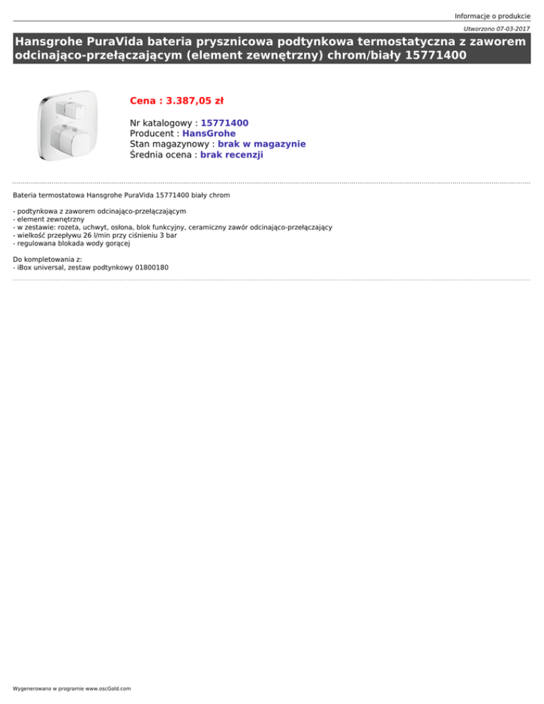 Informacje o produkcie Utworzono 07-03-2017 Hansgrohe PuraVida bateria prysznicowa podtynkowa termostatyczna z zaworem odcinająco-przełączającym (element zewnętrzny) chrom/biały 15771400 Cena : 3.387,05 zł Nr katalogowy : 15771400 Producent : HansGrohe Stan magazynowy : brak w magazynie Średnia ocena : brak recenzji Bateria termostatowa Hansgrohe PuraVida 15771400 biały chrom - podtynkowa z zaworem odcinająco-przełączającym - element zewnętrzny - w zestawie: rozeta, uchwyt, osłona, blok funkcyjny, ceramiczny zawór odcinająco-przełączający - wielkość przepływu 26 l/min przy ciśnieniu 3 bar - regulowana blokada wody gorącej Do kompletowania z: - iBox universal, zestaw podtynkowy 01800180 Wygenerowano w programie www.oscGold.com