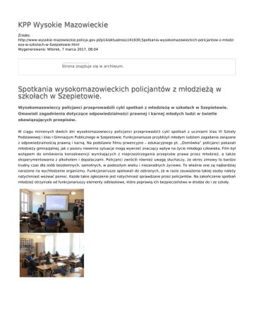 KPP Wysokie Mazowieckie Źródło: http://www.wysokie-mazowieckie.policja.gov.pl/p14/aktualnosci/41630,Spotkania-wysokomazowieckich-policjantow-z-mlodzi eza-w-szkolach-w-Szepietowie.html Wygenerowano: Wtorek, 7 marca 2017, 08:04 Strona znajduje się w archiwum. Spotkania wysokomazowieckich policjantów z młodzieżą w szkołach w Szepietowie. Wysokomazowieccy policjanci przeprowadzili cykl spotkań z młodzieżą w szkołach w Szepietowie. Omawiali zagadnienia dotyczące odpowiedzialności prawnej i karnej młodych ludzi w świetle obowiązujących przepisów. W ciągu minionych dwóch dni wysokomazowieccy policjanci przeprowadzili cykl spotkań z uczniami klas VI Szkoły Podstawowej i klas I Gimnazjum Publicznego w Szepietowie. Funkcjonariusze przybliżyli młodym ludziom zagadania związane z odpowiedzialnością prawną i karną. Na podstawie filmu prwencyjno – edukacyjnego pt. „Domówka” policjanci pokazali młodzieży gimnazjalnej, jak z pozoru niewinne sytuacje mogą wywrzeć znaczący wpływ na życie młodego człowieka. Film był wstępem do omówienia konsekwencji wynikających z nieprzestrzegania przepisów prawa przez młodzież, a także eksperymentowania z alkoholem i dopalaczami. Policjanci zwrócili również uwagę słuchaczy, że okres zimowy to bardzo trudny czas dla osób bezdomnych, samotnych, w podeszłym wieku i niezaradnych życiowo. To właśnie one są najbardziej narażone na wychłodzenie organizmu. Funkcjonariusze apelowali do zebranych, że w razie zauważenia takiej osoby należy natychmiast wezwać pomoc. Każde takie zgłoszenie jest natychmiast sprawdzane przez policjantów. Na zakończenie spotkań młodzież otrzymała od funkcjonariuszy elementy odblaskowe, które poprawią ich bezpieczeństwo w drodze do i ze szkoły. Ocena: 0/5 (0) Tweetnij