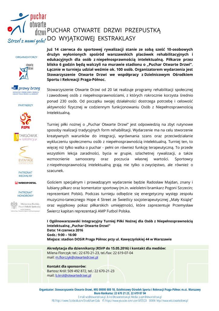 PUCHAR OTWARTE DRZWI PRZEPUSTKĄ DO WYJĄTKOWEJ EKSTRAKLASY Już 14 czerwca do sportowej rywalizacji stanie ze sobą sześć 10-osobowych drużyn wyłonionych spośród warszawskich placówek rehabilitacyjnych i edukacyjnych dla osób z niepełnosprawnością intelektualną. Piłkarze przez blisko 6 godzin będą walczyli na murawie stadionu o „Puchar Otwarte Drzwi”. Łącznie w turnieju udział weźmie ok. 100 osób. Organizatorem wydarzenia jest Stowarzyszenie Otwarte Drzwi we współpracy z Dzielnicowym Ośrodkiem Sportu i Rekreacji Praga-Północ. Stowarzyszenie Otwarte Drzwi od 20 lat realizuje programy rehabilitacji społecznej i zawodowej osób z niepełnosprawnościami, z których rokrocznie korzysta średnio ponad 230 osób. Od początku swojej działalności dostrzega potrzebę i celowość aktywności fizycznej w codziennym funkcjonowaniu Osób z Niepełnosprawnością Intelektualną. Turniej piłki nożnej o „Puchar Otwarte Drzwi” jest odpowiedzią na zbyt rutynowe sposoby realizacji tradycyjnych form rehabilitacji. Wydarzenie ma na celu stworzenie kreatywnych warunków do integracji, wyrównania szans oraz przeciwdziałanie wykluczeniu społecznemu osób z niepełnosprawnością intelektualną. Turniej ten, to więcej niż tylko walka o puchar - pełni on również funkcję terapeutyczną. To przede wszystkim lekcja zaradności, bycia w grupie, szlachetnej rywalizacji, a także wzmocnienie samooceny oraz poczucia własnej wartości. Sportowcy z niepełnosprawnością intelektualną grają nie tylko o zwycięstwo, ale również o szacunek. Gościem specjalnym i prowadzącym wydarzenie będzie Radosław Majdan, znany i lubiany piłkarz oraz komentator sportowy (m.in. wieloletni bramkarz Pogoni Szczecin; reprezentant Polski). Podczas turnieju odbędzie się energetyczny występ zespołu muzyczno-tanecznego Hope 4 Street ze Świetlicy socjoterapeutycznej „Mały Książę” oraz wyjątkowy pokaz piłkarskich umiejętności, które zaprezentuje Przemysław Świercz kapitan reprezentacji AMP Futbol Polska. I Ogólnowarszawski Integracyjny Turniej Piłki Nożnej dla Osób z Niepełnosprawnością Intelektualną „Puchar Otwarte Drzwi” Data: 14 czerwca 2016 Godz.: 9:00 – 16:00 Miejsce: stadion DOSiR Praga Północ przy ul. Kawęczyńskiej 44 w Warszawie Akredytacja dla dziennikarzy (RSVP do 15.05.2016) i kontakt dla mediów: Milena Florczyk: tel.: 22 670-21-23, tel./fax: 22 619-07-04 mail: [email protected] Kontakt dla sponsorów: Bartosz Król: 509 492 872, tel.: 22 670-21-23 mail: [email protected]