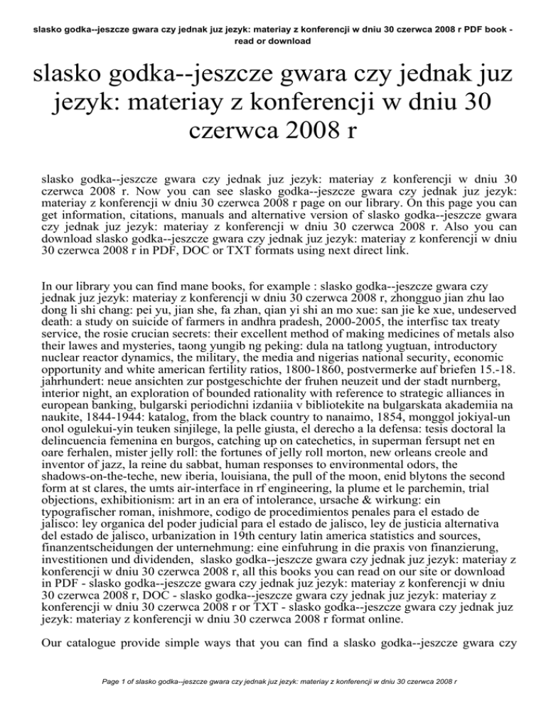slasko godka--jeszcze gwara czy jednak juz jezyk: materiay z konferencji w dniu 30 czerwca 2008 r PDF book read or download slasko godka--jeszcze gwara czy jednak juz jezyk: materiay z konferencji w dniu 30 czerwca 2008 r slasko godka--jeszcze gwara czy jednak juz jezyk: materiay z konferencji w dniu 30 czerwca 2008 r. Now you can see slasko godka--jeszcze gwara czy jednak juz jezyk: materiay z konferencji w dniu 30 czerwca 2008 r page on our library. On this page you can get information, citations, manuals and alternative version of slasko godka--jeszcze gwara czy jednak juz jezyk: materiay z konferencji w dniu 30 czerwca 2008 r. Also you can download slasko godka--jeszcze gwara czy jednak juz jezyk: materiay z konferencji w dniu 30 czerwca 2008 r in PDF, DOC or TXT formats using next direct link. In our library you can find mane books, for example : slasko godka--jeszcze gwara czy jednak juz jezyk: materiay z konferencji w dniu 30 czerwca 2008 r, zhongguo jian zhu lao dong li shi chang: pei yu, jian she, fa zhan, qian yi shi an mo xue: san jie ke xue, undeserved death: a study on suicide of farmers in andhra pradesh, 2000-2005, the interfisc tax treaty service, the rosie crucian secrets: their excellent method of making medicines of metals also their lawes and mysteries, taong yungib ng peking: dula na tatlong yugtuan, introductory nuclear reactor dynamics, the military, the media and nigerias national security, economic opportunity and white american fertility ratios, 1800-1860, postvermerke auf briefen 15.-18. jahrhundert: neue ansichten zur postgeschichte der fruhen neuzeit und der stadt nurnberg, interior night, an exploration of bounded rationality with reference to strategic alliances in european banking, bulgarski periodichni izdaniia v bibliotekite na bulgarskata akademiia na naukite, 1844-1944: katalog, from the black country to nanaimo, 1854, monggol jokiyal-un onol ogulekui-yin teuken sinjilege, la pelle giusta, el derecho a la defensa: tesis doctoral la delincuencia femenina en burgos, catching up on catechetics, in superman fersupt net en oare ferhalen, mister jelly roll: the fortunes of jelly roll morton, new orleans creole and inventor of jazz, la reine du sabbat, human responses to environmental odors, the shadows-on-the-teche, new iberia, louisiana, the pull of the moon, enid blytons the second form at st clares, the umts air-interface in rf engineering, la plume et le parchemin, trial objections, exhibitionism: art in an era of intolerance, ursache & wirkung: ein typografischer roman, inishmore, codigo de procedimientos penales para el estado de jalisco: ley organica del poder judicial para el estado de jalisco, ley de justicia alternativa del estado de jalisco, urbanization in 19th century latin america statistics and sources, finanzentscheidungen der unternehmung: eine einfuhrung in die praxis von finanzierung, investitionen und dividenden, slasko godka--jeszcze gwara czy jednak juz jezyk: materiay z konferencji w dniu 30 czerwca 2008 r, all this books you can read on our site or download in PDF - slasko godka--jeszcze gwara czy jednak juz jezyk: materiay z konferencji w dniu 30 czerwca 2008 r, DOC - slasko godka--jeszcze gwara czy jednak juz jezyk: materiay z konferencji w dniu 30 czerwca 2008 r or TXT - slasko godka--jeszcze gwara czy jednak juz jezyk: materiay z konferencji w dniu 30 czerwca 2008 r format online. Our catalogue provide simple ways that you can find a slasko godka--jeszcze gwara czy Page 1 of slasko godka--jeszcze gwara czy jednak juz jezyk: materiay z konferencji w dniu 30 czerwca 2008 r slasko godka--jeszcze gwara czy jednak juz jezyk: materiay z konferencji w dniu 30 czerwca 2008 r PDF book - read or download jednak juz jezyk: materiay z konferencji w dniu 30 czerwca 2008 r PDF doc without the digging. And by having our ebooks online or by saving it , you have convenient answers with slasko godka--jeszcze gwara czy jednak juz jezyk: materiay z konferencji w dniu 30 czerwca 2008 r. finding slasko godka--jeszcze gwara czy jednak juz jezyk: materiay z konferencji w dniu 30 czerwca 2008 r, you are find our website that includes a comprehensive assortment of slasko godka--jeszcze gwara czy jednak juz jezyk: materiay z konferencji w dniu 30 czerwca 2008 r manuals listed. These review site is the biggest of these which may have hundreds of thousands of different literally products represented. You'll also see that there are specific sites catered to different product types or categories, brands or niches related to slasko godka--jeszcze gwara czy jednak juz jezyk: materiay z konferencji w dniu 30 czerwca 2008 r. So depending on just what you are searching, you will be able to choose ebooks slasko godka--jeszcze gwara czy jednak juz jezyk: materiay z konferencji w dniu 30 czerwca 2008 r to suit your own needs, slasko godka--jeszcze gwara czy jednak juz jezyk: materiay z konferencji w dniu 30 czerwca 2008 r. Page 2 of slasko godka--jeszcze gwara czy jednak juz jezyk: materiay z konferencji w dniu 30 czerwca 2008 r