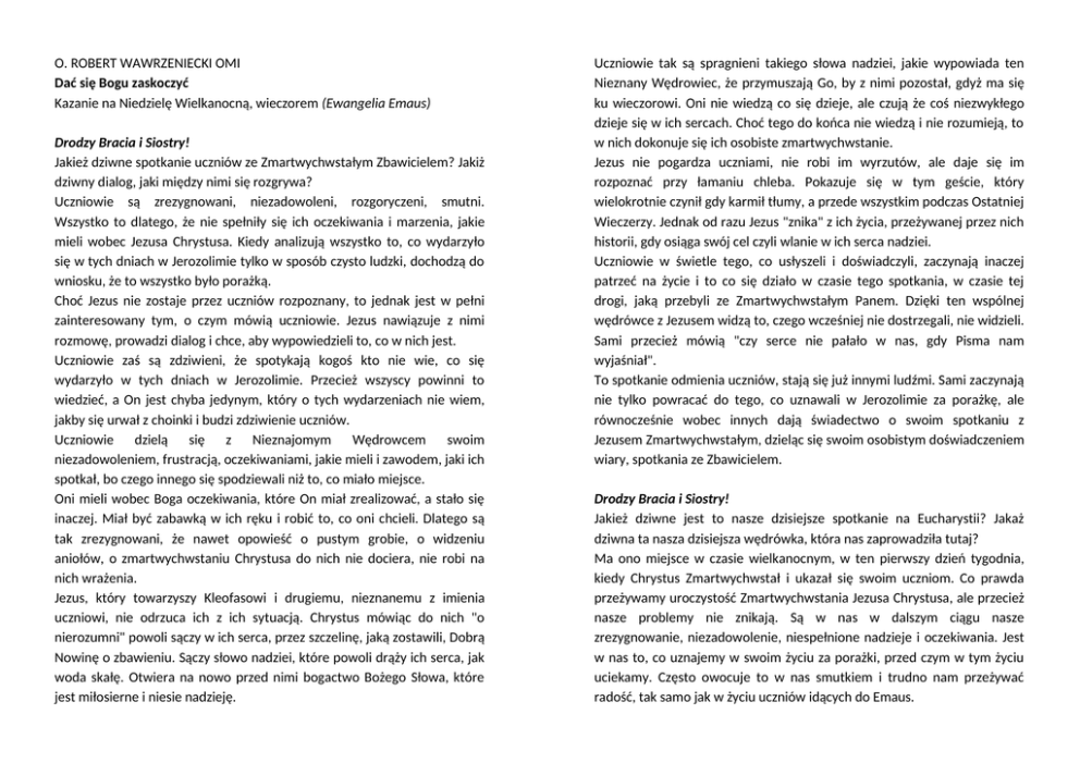 O. ROBERT WAWRZENIECKI OMI Dać się Bogu zaskoczyć Kazanie na Niedzielę Wielkanocną, wieczorem (Ewangelia Emaus) Drodzy Bracia i Siostry! Jakież dziwne spotkanie uczniów ze Zmartwychwstałym Zbawicielem? Jakiż dziwny dialog, jaki między nimi się rozgrywa? Uczniowie są zrezygnowani, niezadowoleni, rozgoryczeni, smutni. Wszystko to dlatego, że nie spełniły się ich oczekiwania i marzenia, jakie mieli wobec Jezusa Chrystusa. Kiedy analizują wszystko to, co wydarzyło się w tych dniach w Jerozolimie tylko w sposób czysto ludzki, dochodzą do wniosku, że to wszystko było porażką. Choć Jezus nie zostaje przez uczniów rozpoznany, to jednak jest w pełni zainteresowany tym, o czym mówią uczniowie. Jezus nawiązuje z nimi rozmowę, prowadzi dialog i chce, aby wypowiedzieli to, co w nich jest. Uczniowie zaś są zdziwieni, że spotykają kogoś kto nie wie, co się wydarzyło w tych dniach w Jerozolimie. Przecież wszyscy powinni to wiedzieć, a On jest chyba jedynym, który o tych wydarzeniach nie wiem, jakby się urwał z choinki i budzi zdziwienie uczniów. Uczniowie dzielą się z Nieznajomym Wędrowcem swoim niezadowoleniem, frustracją, oczekiwaniami, jakie mieli i zawodem, jaki ich spotkał, bo czego innego się spodziewali niż to, co miało miejsce. Oni mieli wobec Boga oczekiwania, które On miał zrealizować, a stało się inaczej. Miał być zabawką w ich ręku i robić to, co oni chcieli. Dlatego są tak zrezygnowani, że nawet opowieść o pustym grobie, o widzeniu aniołów, o zmartwychwstaniu Chrystusa do nich nie dociera, nie robi na nich wrażenia. Jezus, który towarzyszy Kleofasowi i drugiemu, nieznanemu z imienia uczniowi, nie odrzuca ich z ich sytuacją. Chrystus mówiąc do nich "o nierozumni" powoli sączy w ich serca, przez szczelinę, jaką zostawili, Dobrą Nowinę o zbawieniu. Sączy słowo nadziei, które powoli drąży ich serca, jak woda skałę. Otwiera na nowo przed nimi bogactwo Bożego Słowa, które jest miłosierne i niesie nadzieję. Uczniowie tak są spragnieni takiego słowa nadziei, jakie wypowiada ten Nieznany Wędrowiec, że przymuszają Go, by z nimi pozostał, gdyż ma się ku wieczorowi. Oni nie wiedzą co się dzieje, ale czują że coś niezwykłego dzieje się w ich sercach. Choć tego do końca nie wiedzą i nie rozumieją, to w nich dokonuje się ich osobiste zmartwychwstanie. Jezus nie pogardza uczniami, nie robi im wyrzutów, ale daje się im rozpoznać przy łamaniu chleba. Pokazuje się w tym geście, który wielokrotnie czynił gdy karmił tłumy, a przede wszystkim podczas Ostatniej Wieczerzy. Jednak od razu Jezus "znika" z ich życia, przeżywanej przez nich historii, gdy osiąga swój cel czyli wlanie w ich serca nadziei. Uczniowie w świetle tego, co usłyszeli i doświadczyli, zaczynają inaczej patrzeć na życie i to co się działo w czasie tego spotkania, w czasie tej drogi, jaką przebyli ze Zmartwychwstałym Panem. Dzięki ten wspólnej wędrówce z Jezusem widzą to, czego wcześniej nie dostrzegali, nie widzieli. Sami przecież mówią "czy serce nie pałało w nas, gdy Pisma nam wyjaśniał". To spotkanie odmienia uczniów, stają się już innymi ludźmi. Sami zaczynają nie tylko powracać do tego, co uznawali w Jerozolimie za porażkę, ale równocześnie wobec innych dają świadectwo o swoim spotkaniu z Jezusem Zmartwychwstałym, dzieląc się swoim osobistym doświadczeniem wiary, spotkania ze Zbawicielem. Drodzy Bracia i Siostry! Jakież dziwne jest to nasze dzisiejsze spotkanie na Eucharystii? Jakaż dziwna ta nasza dzisiejsza wędrówka, która nas zaprowadziła tutaj? Ma ono miejsce w czasie wielkanocnym, w ten pierwszy dzień tygodnia, kiedy Chrystus Zmartwychwstał i ukazał się swoim uczniom. Co prawda przeżywamy uroczystość Zmartwychwstania Jezusa Chrystusa, ale przecież nasze problemy nie znikają. Są w nas w dalszym ciągu nasze zrezygnowanie, niezadowolenie, niespełnione nadzieje i oczekiwania. Jest w nas to, co uznajemy w swoim życiu za porażki, przed czym w tym życiu uciekamy. Często owocuje to w nas smutkiem i trudno nam przeżywać radość, tak samo jak w życiu uczniów idących do Emaus. Jezus właśnie wtedy usiłuje się do nas przyłączyć, choć może nadal pozostaje nierozpoznany. W tej naszej codzienności słucha tego wszystkiego, co w sobie nosimy. On chce, abyśmy wobec Jego miłosiernego serca wypowiedzieli to wszystko, podzielili się z Nim tym wszystkim a dzięki temu stali się wolni od brzemienia, jakie często samotnie nosimy. Jezus dziś, idąc z nami w naszej drodze do Emaus, wyjaśnia nam Pisma w Liturgii Słowa. On daje nam słowo nadziei, słowo Bożego Miłosierdzia dla nas i całego świata. On chce, abyśmy to słowo chłonęli jak gąbka, by nasze serce pałało, gdy je słyszymy. Jezus Zmartwychwstały dziś, przy tym ołtarzu, który jest naszym cotygodniowym Emaus, daje się nam rozpoznać przy łamaniu chleba. Wszystko to po to, aby orędzie nadziei przeniknęło nas, aby zapadło w nasze serca i przemieniło to co beznadziejne w źródło nadziei, to w ludzkich kalkulacjach jest praktycznie niemożliwe. Drodzy Bracia i Siostry! Jakież to dziwne spotkanie? Jakież dziwne to nasze spotkanie na Eucharystii w wieczór Uroczystości Zmartwychwstania Pańskiego? Dlaczego? Bo ma nas otworzyć na to, że jest Ktoś większy od naszych ludzkich planów i kalkulacji, które często po ludzku zawodzą. One tak często czynią z nas ludzi smutnych, zrezygnowanych, niezadowolonych, sfrustrowanych, których oczekiwania i marzenia nie zostały spełnione, niosących w sobie znamię porażki i uciekających w swoim życiu przed tymi niekomfortowymi dla nas momentami naszego życia. To spotkanie ze Zmartwychwstałym Panem ma nam otworzyć oczy na to, że On chce, aby historia uczniów z Emaus działa się w naszym codziennym życiu za każdym razem, gdy spotykamy się z Nim na zwykłej niedzielnej Eucharystii. To jest ten moment, gdy Zmartwychwstały Pan 