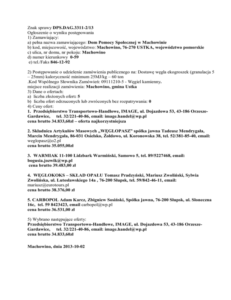 Znak sprawy DPS.DAG.3311-2/13 Ogłoszenie o wyniku postępowania 1) Zamawiający: a) pełna nazwa zamawiającego: Dom Pomocy Społecznej w Machowinie b) kod, miejscowość, województwo: Machowino, 76-270 USTKA, województwo pomorskie c) ulica, nr domu, nr pokoju: Machowino d) numer kierunkowy 0-59 e) tel./Faks 846-12-92 2) Postępowanie o udzielenie zamówienia publicznego na: Dostawę węgla ekogroszek (granulacja 5 – 25mm) kaloryczność minimum 25MJ/kg – 60 ton .Kod Wspólnego Słownika Zamówień: 09111210-5 - Węgiel kamienny. miejsce realizacji zamówienia: Machowino, gmina Ustka 3) Dane o ofertach: a) liczba złożonych ofert: 5 b) liczba ofert odrzuconych lub zwróconych bez rozpatrywania: 0 4) Ceny ofert: 1. Przedsiębiorstwo Transportowo-Handlowe, IMAGE, ul. Dojazdowa 53, 43-186 OrzeszeGardawice, tel. 32/221-40-86, email: [email protected] cena brutto 34.833,60zł – oferta najkorzystniejsza 2. Składnica Artykułów Masowych „WĘGLOPASZ” spółka jawna Tadeusz Mendrygała, Marcin Mendrygała, 86-031 Osielsko, Żołdowo, ul. Koronowska 38, tel. 52/381-85-40, email: [email protected] cena brutto 35.055,00zł 3. WARMIAK 11-100 Lidzbark Warmiński, Samowo 5, tel. 89/5227468, email: [email protected] cena brutto 39.483,00 zł 4. WĘGLOKOKS – SKŁAD OPAŁU Tomasz Pradzyński, Mariusz Zwoliński, Sylwia Zwolińska, ul. Lutosławskiego 14a , 76-200 Słupsk, tel. 59/842-46-11, email: [email protected] cena brutto 38.376,00 zł 5. CARBOPOL Adam Karcz, Zbigniew Sosiński, Spółka jawna, 76-200 Słupsk, ul. Słoneczna 16c, tel. 59 8423423, email [email protected] cena brutto 36.531,00 zł 5) Wybrano następujące oferty: Przedsiębiorstwo Transportowo-Handlowe, IMAGE, ul. Dojazdowa 53, 43-186 OrzeszeGardawice, tel. 32/221-40-86, email: [email protected] cena brutto 34.833,60zł Machowino, dnia 2013-10-02