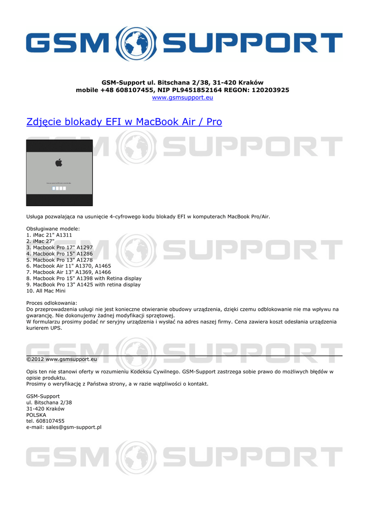 GSM-Support ul. Bitschana 2/38, 31-420 Kraków mobile +48 608107455, NIP PL9451852164 REGON: 120203925 www.gsmsupport.eu Zdjęcie blokady EFI w MacBook Air / Pro Usługa pozwalająca na usunięcie 4-cyfrowego kodu blokady EFI w komputerach MacBook Pro/Air. Obsługiwane modele: 1. iMac 21" A1311 2. iMac 27" 3. Macbook Pro 17" A1297 4. Macbook Pro 15" A1286 5. Macbook Pro 13" A1278 6. Macbook Air 11" A1370, A1465 7. Macbook Air 13" A1369, A1466 8. Macbook Pro 15" A1398 with Retina display 9. MacBook Pro 13" A1425 with retina display 10. All Mac Mini Proces odlokowania: Do przeprowadzenia usługi nie jest konieczne otwieranie obudowy urządzenia, dzięki czemu odblokowanie nie ma wpływu na gwarancję. Nie dokonujemy żadnej modyfikacji sprzętowej. W formularzu prosimy podać nr seryjny urządzenia i wysłać na adres naszej firmy. Cena zawiera koszt odesłania urządzenia kurierem UPS. ©2012 www.gsmsupport.eu Opis ten nie stanowi oferty w rozumieniu Kodeksu Cywilnego. GSM-Support zastrzega sobie prawo do możliwych błędów w opisie produktu. Prosimy o weryfikację z Państwa strony, a w razie wątpliwości o kontakt. GSM-Support ul. Bitschana 2/38 31-420 Kraków POLSKA tel. 608107455 e-mail: [email protected] Powered by TCPDF (www.tcpdf.org)