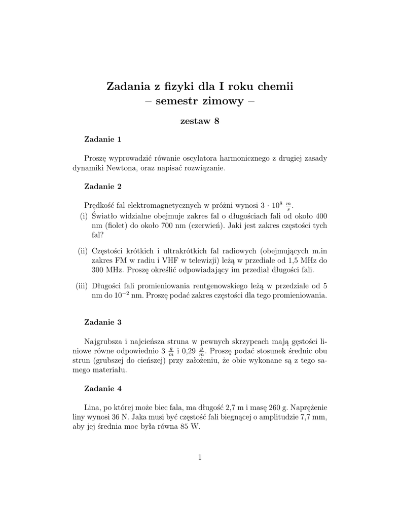 Zadania z fizyki dla I roku chemii – semestr zimowy – zestaw 8 Zadanie 1 Proszę wyprowadzić rówanie oscylatora harmonicznego z drugiej zasady dynamiki Newtona, oraz napisać rozwiązanie. Zadanie 2 Prędkość fal elektromagnetycznych w próżni wynosi 3 · 108 ms . (i) Światło widzialne obejmuje zakres fal o długościach fali od około 400 nm (fiolet) do około 700 nm (czerwień). Jaki jest zakres częstości tych fal? (ii) Częstości krótkich i ultrakrótkich fal radiowych (obejmujących m.in zakres FM w radiu i VHF w telewizji) leżą w przediale od 1,5 MHz do 300 MHz. Proszę określić odpowiadający im przediał długości fali. (iii) Długości fali promieniowania rentgenowskiego leżą w przedziale od 5 nm do 10−2 nm. Proszę podać zakres częstości dla tego promieniowania. Zadanie 3 Najgrubsza i najcieńsza struna w pewnych skrzypcach mają gęstości liniowe równe odpowiednio 3 mg i 0,29 mg . Proszę podać stosunek średnic obu strun (grubszej do cieńszej) przy założeniu, że obie wykonane są z tego samego materiału. Zadanie 4 Lina, po której może biec fala, ma długość 2,7 m i masę 260 g. Naprężenie liny wynosi 36 N. Jaka musi być częstość fali biegnącej o amplitudzie 7,7 mm, aby jej średnia moc była równa 85 W. 1 rysunek 1 Zadanie 5 Dwie identyczne fale biegnące w tym samym kierunku są przesunięte w fazie o π2 rad. Proszę znaleźć amplitudę fali wypadkowej i wyrazić ją za pomocą amplitudy ym fal składowych. Zadanie 6 Nylonowa struna w gitarze ma gęstość liniową 7,2 g/m i jest naciągnięta siłą 150 N. Stałe punkty podparcia oddalone są od siebie o 90 cm. W strunie wzbudzono falę stojącą przedstawioną na rysunku 1. Proszę obliczyć prędkość, długość fali oraz częstość fal biegnących, tworzących w wyniku złożenia daną falę stojącą. Zadanie 7 Linia rozpięta między dwoma sztywnymi wspornikami, znajdującymi się w odległości 75 cm od siebie, ma częstości rezonansowe 420 Hz i 315 Hz, przy czym żadna pośrednia częstość nie jest rezonansowa. Proszę obliczyć najmniejszą częstość rezonansową i prędkość fali. 2
