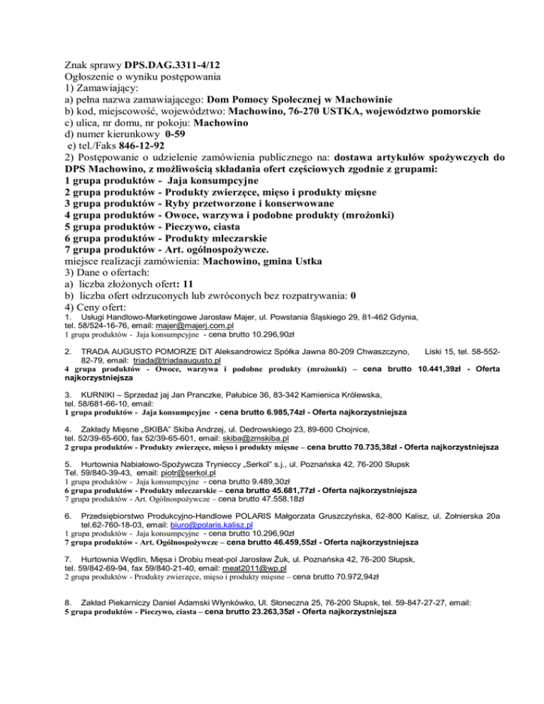 Znak sprawy DPS.DAG.3311-4/12 Ogłoszenie o wyniku postępowania 1) Zamawiający: a) pełna nazwa zamawiającego: Dom Pomocy Społecznej w Machowinie b) kod, miejscowość, województwo: Machowino, 76-270 USTKA, województwo pomorskie c) ulica, nr domu, nr pokoju: Machowino d) numer kierunkowy 0-59 e) tel./Faks 846-12-92 2) Postępowanie o udzielenie zamówienia publicznego na: dostawa artykułów spożywczych do DPS Machowino, z możliwością składania ofert częściowych zgodnie z grupami: 1 grupa produktów - Jaja konsumpcyjne 2 grupa produktów - Produkty zwierzęce, mięso i produkty mięsne 3 grupa produktów - Ryby przetworzone i konserwowane 4 grupa produktów - Owoce, warzywa i podobne produkty (mrożonki) 5 grupa produktów - Pieczywo, ciasta 6 grupa produktów - Produkty mleczarskie 7 grupa produktów - Art. ogólnospożywcze. miejsce realizacji zamówienia: Machowino, gmina Ustka 3) Dane o ofertach: a) liczba złożonych ofert: 11 b) liczba ofert odrzuconych lub zwróconych bez rozpatrywania: 0 4) Ceny ofert: 1. Usługi Handlowo-Marketingowe Jarosław Majer, ul. Powstania Śląskiego 29, 81-462 Gdynia, tel. 58/524-16-76, email: [email protected] 1 grupa produktów - Jaja konsumpcyjne - cena brutto 10.296,90zł 2. TRADA AUGUSTO POMORZE DiT Aleksandrowicz Spółka Jawna 80-209 Chwaszczyno, Liski 15, tel. 58-55282-79, email: [email protected] 4 grupa produktów - Owoce, warzywa i podobne produkty (mrożonki) – cena brutto 10.441,39zł - Oferta najkorzystniejsza 3. KURNIKI – Sprzedaż jaj Jan Pranczke, Pałubice 36, 83-342 Kamienica Królewska, tel. 58/681-66-10, email: 1 grupa produktów - Jaja konsumpcyjne - cena brutto 6.985,74zł - Oferta najkorzystniejsza 4. Zakłady Mięsne „SKIBA” Skiba Andrzej, ul. Dedrowskiego 23, 89-600 Chojnice, tel. 52/39-65-600, fax 52/39-65-601, email: [email protected] 2 grupa produktów - Produkty zwierzęce, mięso i produkty mięsne – cena brutto 70.735,38zł - Oferta najkorzystniejsza 5. Hurtownia Nabiałowo-Spożywcza Trynieccy „Serkol” s.j., ul. Poznańska 42, 76-200 Słupsk Tel. 59/840-39-43, email: [email protected] 1 grupa produktów - Jaja konsumpcyjne - cena brutto 9.489,30zł 6 grupa produktów - Produkty mleczarskie – cena brutto 45.681,77zł - Oferta najkorzystniejsza 7 grupa produktów - Art. Ogólnospożywcze – cena brutto 47.558,18zł 6. Przedsiębiorstwo Produkcyjno-Handlowe POLARIS Małgorzata Gruszczyńska, 62-800 Kalisz, ul. Żołnierska 20a tel.62-760-18-03, email: [email protected] 1 grupa produktów - Jaja konsumpcyjne - cena brutto 10.296,90zł 7 grupa produktów - Art. Ogólnospożywcze – cena brutto 46.459,55zł - Oferta najkorzystniejsza 7. Hurtownia Wędlin, Mięsa i Drobiu meat-pol Jarosław Żuk, ul. Poznańska 42, 76-200 Słupsk, tel. 59/842-69-94, fax 59/840-21-40, email: [email protected] 2 grupa produktów - Produkty zwierzęce, mięso i produkty mięsne – cena brutto 70.972,94zł 8. Zakład Piekarniczy Daniel Adamski Włynkówko, Ul. Słoneczna 25, 76-200 Słupsk, tel. 59-847-27-27, email: 5 grupa produktów - Pieczywo, ciasta – cena brutto 23.263,35zł - Oferta najkorzystniejsza 9. GELATO Firma Handlowo-Usługowa, Aleksandra, Andrzej Adamowicz, Reblinko 1, 76-251 Kobylnica, tel. 59/841-55-22, fax 59/841-55-23, email: [email protected] 3 grupa produktów - Ryby przetworzone i konserwowane – cena brutto 18.552,12zł 4 grupa produktów - Owoce, warzywa i podobne produkty (mrożonki) – cena brutto 11.260,43zł 10. Gminna Spółdzielnia „SAMOPOMOC CHŁOPSKA” 76-270 Ustka, ul. Pl. Wolności 9 Tel. 59-814-60-72, fax 59-814-44-77, email: [email protected] 5 grupa produktów - Pieczywo, ciasta – cena brutto 38.336,34zł 11. „FAMILY-ICE” Grzegorz Szczepański, ul. Wodna 15, 76-251 Kobylnica, Tel. 59/841 54 15, email: [email protected] 3 grupa produktów - Ryby przetworzone i konserwowane – cena brutto 13.854,26zł - Oferta najkorzystniejsza 4 grupa produktów - Owoce, warzywa i podobne produkty (mrożonki) – cena brutto 10.855,26zł 5) Wybrano następujące oferty: TRADA AUGUSTO POMORZE DiT Aleksandrowicz Spółka Jawna 80-209 Chwaszczyno, Liski 15, tel. 58-552-82-79, email: [email protected] 4 grupa produktów - Owoce, warzywa i podobne produkty (mrożonki) – cena brutto 10.441,39zł Hurtownia Nabiałowo-Spożywcza Trynieccy „Serkol” s.j., ul. Poznańska 42, 76-200 Słupsk Tel. 59/840-39-43, email: [email protected] 6 grupa produktów - Produkty mleczarskie – cena brutto 45.681,77zł KURNIKI – Sprzedaż jaj Jan Pranczke, Pałubice 36, 83-342 Kamienica Królewska, tel. 58/681-66-10, email: 1 grupa produktów - Jaja konsumpcyjne - cena brutto 6.985,74zł Zakłady Mięsne „SKIBA” Skiba Andrzej, ul. Dedrowskiego 23, 89-600 Chojnice, tel. 52/39-65-600, fax 52/39-65-601, email: [email protected] 2 grupa produktów - Produkty zwierzęce, mięso i produkty mięsne – cena brutto 70.735,38zł Przedsiębiorstwo Produkcyjno-Handlowe POLARIS Małgorzata Gruszczyńska, 62-800 Kalisz, ul. Żołnierska 20a tel.62-760-18-03, email: [email protected] 7 grupa produktów - Art. Ogólnospożywcze – cena brutto 46.459,55zł Zakład Piekarniczy Daniel Adamski Włynkówko, Ul. Słoneczna 25, 76-200 Słupsk, tel. 59-847-27-27, email: 5 grupa produktów - Pieczywo, ciasta – cena brutto 23.263,35zł FAMILY-ICE Grzegorz Szczepański, ul. Wodna 15, 76-251 Kobylnica, Tel. 59/841 54 15, email: [email protected] 3 grupa produktów - Ryby przetworzone i konserwowane – cena brutto 13.854,26zł 6) Uzasadnienie wyboru : Najniższa cena Machowino, dnia 2012-12-06 ___________________________ imię i nazwisko osoby uprawnionej