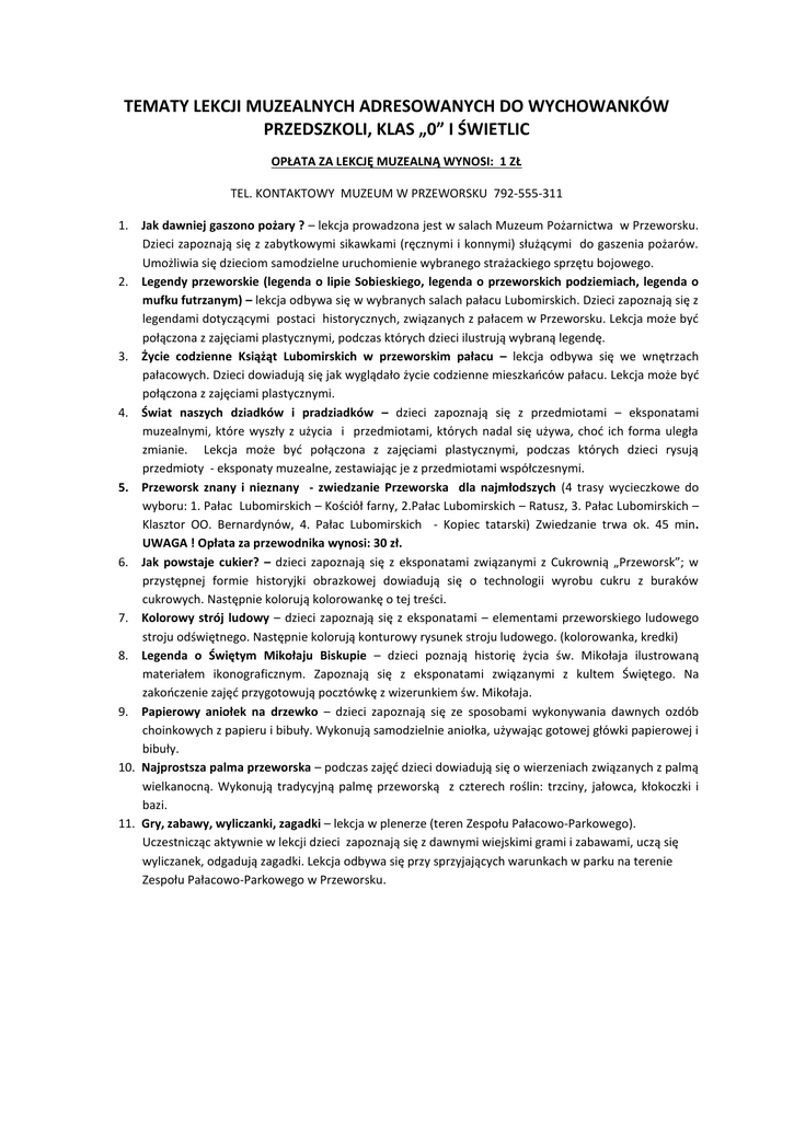 TEMATY LEKCJI MUZEALNYCH ADRESOWANYCH DO WYCHOWANKÓW PRZEDSZKOLI, KLAS „0” I ŚWIETLIC OPŁATA ZA LEKCJĘ MUZEALNĄ WYNOSI: 1 ZŁ TEL. KONTAKTOWY MUZEUM W PRZEWORSKU 792-555-311 1. Jak dawniej gaszono pożary ? – lekcja prowadzona jest w salach Muzeum Pożarnictwa w Przeworsku. Dzieci zapoznają się z zabytkowymi sikawkami (ręcznymi i konnymi) służącymi do gaszenia pożarów. Umożliwia się dzieciom samodzielne uruchomienie wybranego strażackiego sprzętu bojowego. 2. Legendy przeworskie (legenda o lipie Sobieskiego, legenda o przeworskich podziemiach, legenda o mufku futrzanym) – lekcja odbywa się w wybranych salach pałacu Lubomirskich. Dzieci zapoznają się z legendami dotyczącymi postaci historycznych, związanych z pałacem w Przeworsku. Lekcja może być połączona z zajęciami plastycznymi, podczas których dzieci ilustrują wybraną legendę. 3. Życie codzienne Książąt Lubomirskich w przeworskim pałacu – lekcja odbywa się we wnętrzach pałacowych. Dzieci dowiadują się jak wyglądało życie codzienne mieszkańców pałacu. Lekcja może być połączona z zajęciami plastycznymi. 4. Świat naszych dziadków i pradziadków – dzieci zapoznają się z przedmiotami – eksponatami muzealnymi, które wyszły z użycia i przedmiotami, których nadal się używa, choć ich forma uległa zmianie. Lekcja może być połączona z zajęciami plastycznymi, podczas których dzieci rysują przedmioty - eksponaty muzealne, zestawiając je z przedmiotami współczesnymi. 5. Przeworsk znany i nieznany - zwiedzanie Przeworska dla najmłodszych (4 trasy wycieczkowe do wyboru: 1. Pałac Lubomirskich – Kościół farny, 2.Pałac Lubomirskich – Ratusz, 3. Pałac Lubomirskich – Klasztor OO. Bernardynów, 4. Pałac Lubomirskich - Kopiec tatarski) Zwiedzanie trwa ok. 45 min. UWAGA ! Opłata za przewodnika wynosi: 30 zł. 6. Jak powstaje cukier? – dzieci zapoznają się z eksponatami związanymi z Cukrownią „Przeworsk”; w przystępnej formie historyjki obrazkowej dowiadują się o technologii wyrobu cukru z buraków cukrowych. Następnie kolorują kolorowankę o tej treści. 7. Kolorowy strój ludowy – dzieci zapoznają się z eksponatami – elementami przeworskiego ludowego stroju odświętnego. Następnie kolorują konturowy rysunek stroju ludowego. (kolorowanka, kredki) 8. Legenda o Świętym Mikołaju Biskupie – dzieci poznają historię życia św. Mikołaja ilustrowaną materiałem ikonograficznym. Zapoznają się z eksponatami związanymi z kultem Świętego. Na zakończenie zajęć przygotowują pocztówkę z wizerunkiem św. Mikołaja. 9. Papierowy aniołek na drzewko – dzieci zapoznają się ze sposobami wykonywania dawnych ozdób choinkowych z papieru i bibuły. Wykonują samodzielnie aniołka, używając gotowej główki papierowej i bibuły. 10. Najprostsza palma przeworska – podczas zajęć dzieci dowiadują się o wierzeniach związanych z palmą wielkanocną. Wykonują tradycyjną palmę przeworską z czterech roślin: trzciny, jałowca, kłokoczki i bazi. 11. Gry, zabawy, wyliczanki, zagadki – lekcja w plenerze (teren Zespołu Pałacowo-Parkowego). Uczestnicząc aktywnie w lekcji dzieci zapoznają się z dawnymi wiejskimi grami i zabawami, uczą się wyliczanek, odgadują zagadki. Lekcja odbywa się przy sprzyjających warunkach w parku na terenie Zespołu Pałacowo-Parkowego w Przeworsku.