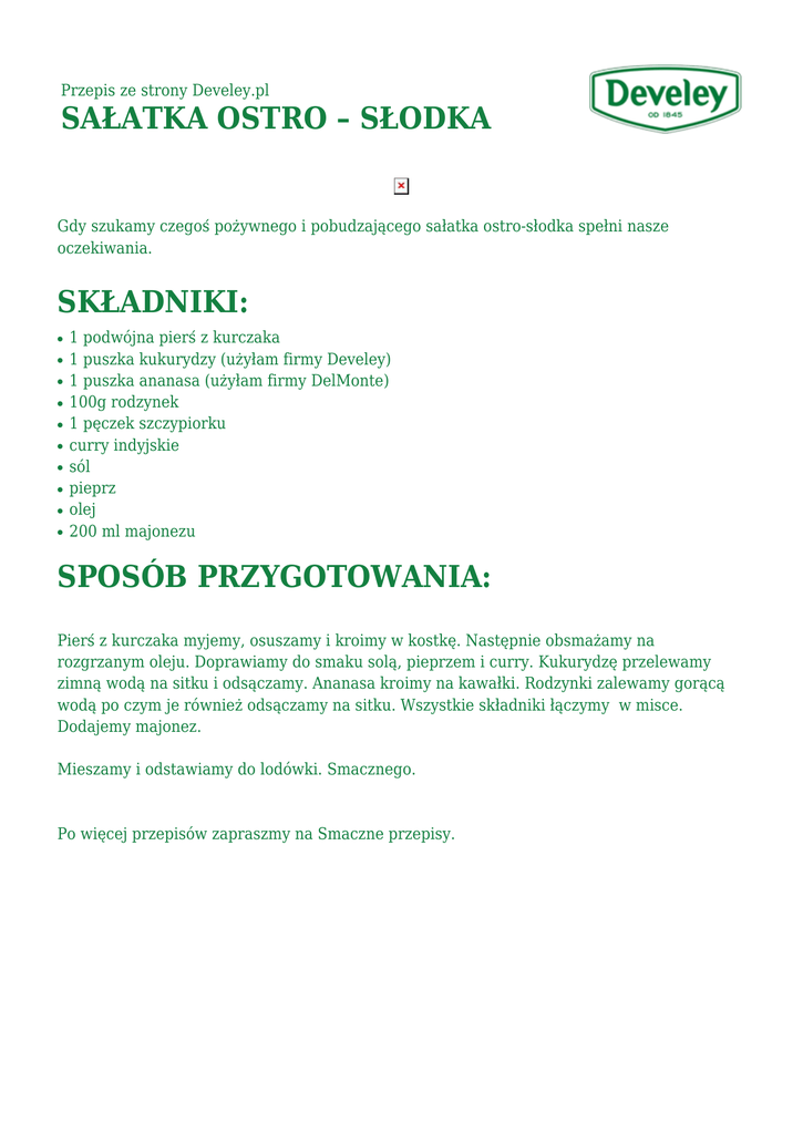 Przepis ze strony Develey.pl SAŁATKA OSTRO – SŁODKA Gdy szukamy czegoś pożywnego i pobudzającego sałatka ostro-słodka spełni nasze oczekiwania. SKŁADNIKI: ● ● ● ● ● ● ● ● ● ● 1 podwójna pierś z kurczaka 1 puszka kukurydzy (użyłam firmy Develey) 1 puszka ananasa (użyłam firmy DelMonte) 100g rodzynek 1 pęczek szczypiorku curry indyjskie sól pieprz olej 200 ml majonezu SPOSÓB PRZYGOTOWANIA: Pierś z kurczaka myjemy, osuszamy i kroimy w kostkę. Następnie obsmażamy na rozgrzanym oleju. Doprawiamy do smaku solą, pieprzem i curry. Kukurydzę przelewamy zimną wodą na sitku i odsączamy. Ananasa kroimy na kawałki. Rodzynki zalewamy gorącą wodą po czym je również odsączamy na sitku. Wszystkie składniki łączymy w misce. Dodajemy majonez. Mieszamy i odstawiamy do lodówki. Smacznego. Po więcej przepisów zapraszmy na Smaczne przepisy.