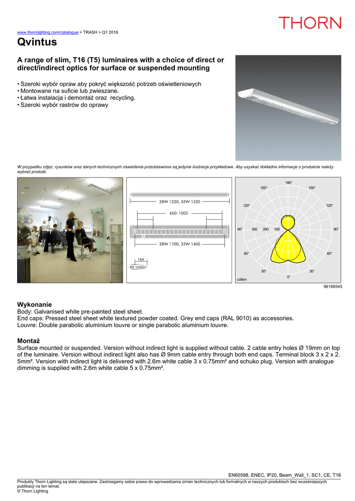 www.thornlighting.com/catalogue > TRASH > Q1 2016 Qvintus A range of slim, T16 (T5) luminaires with a choice of direct or direct/indirect optics for surface or suspended mounting • Szeroki wybór opraw aby pokryć większość potrzeb oświetleniowych • Montowane na suficie lub zwieszane. • Łatwa instalacja i demontaż oraz recycling. • Szeroki wybór rastrów do oprawy W przypadku zdjęć, rysunków oraz danych technicznych oświetlenia przedstawione są jedynie ilustracje przykładowe. Aby uzyskać dokładne informacje o produkcie należy wybrać produkt. 180° 150° 150° 120° 90° 120° 300 200 100 90° 60° 60° 30° cd/klm 30° 0° 96189345 Wykonanie Body: Galvanised white pre-painted steel sheet. End caps: Pressed steel sheet white textured powder coated. Grey end caps (RAL 9010) as accessories. Louvre: Double parabolic aluminium louvre or single parabolic aluminium louvre. Montaż Surface mounted or suspended. Version without indirect light is supplied without cable. 2 cable entry holes Ø 19mm on top of the luminaire. Version without indirect light also has Ø 9mm cable entry through both end caps. Terminal block 3 x 2 x 2. 5mm². Version with indirect light is delivered with 2.6m white cable 3 x 0.75mm² and schuko plug. Version with analogue dimming is supplied with 2.6m white cable 5 x 0.75mm². EN60598, ENEC, IP20, Beam_Wall_1, SC1, CE, T16 Produkty Thorn Lighting są stale ulepszane. Zastrzegamy sobie prawo do wprowadzania zmian technicznych lub formalnych w naszych produktach bez wcześniejszych publikacji na ten temat. © Thorn Lighting