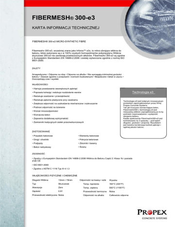 FIBERMESH® 300-e3 KARTA INFORMACJI TECHNICZNEJ FIBERMESH® 300-e3 MICRO-SYNTHETIC FIBRE Fibermesh® 300-e3, wcześniej znane jako Inforce™ e3®, to mikro-zbrojące włókna do betonu, które wykonane są z w 100% czystych homopolimerów polipropylenu Włókna skurczowe 300-e3 nie zawierają przetworzonych alkenów. Fibermesh® 300-e3 są zgodne z Europejskim Standardem EN 14889-2:2006 i zostały wytworzone zgodnie z normą ISO 9001-2000. ZALETY Amagnetyczne • Odporne na rdzę • Odporne na alkalia • Nie wymagają minimalnej grubości betonu • Zawsze zgodne z przepisami i normami budowlanymi • Bezpieczne i łatwe w użyciu • Oszczędzają czas i wysiłek WŁAŚCIWOŚCI • Hamuje powstawanie wewnętrznych pęknięć Technologia e3 • Poprawia kohezję i redukuje rozdzielanie warstw • Redukuje osadzanie i przesiąkliwość • Redukuje pękanie plastyczne przy osadzaniu Technologia e3 jest kolejnym innowacyjnym produktem zapoczątkowanym przez firmę Propex Concrete Systems. Tak jak kruszywo wzmacniające beton, Fibermesh®300 z technologią e3 jest mieszanką włókien zaprojektowaną po to by podnieść rozprowadzenie i wydajność zbrojenia betonu. Każde opakowanie Fibermesh®300-e3 jest kontrolowane na 3 sposoby – pod kątem długości, grubości i proporcji. Rezultatem jest świetna kombinacja kontroli pęknięć i ogólnej jakości betonu. • Zwiększa odporność na uszkodzenia mechaniczne i rozkruszanie • Podnosi odporność na ścieranie • Wzrost mrozoodporności • Wzmacnia beton • Zapewnia dodatkową wytrzymałość • Zamiennik tradycyjnych siatek przeciwskurczowych ZASTOSOWANIE • Posadzki betonowe • Elementy betonowe • Drogi i chodniki • Pokrycia betonowe • Podjazdy • Zbiorniki i baseny • Beton natryskowy • Ściany ZGODNOŚĆ • Zgodny z Europejskim Standardem EN 14889-2:2006 Włókna do Betonu Część 2: Klasa 1b i posiada znak CE • ISO 9001-2000 • Zgodne z ASTM C 1116 Typ III 4.1.3 WŁĄŚCIWOŚCI FIZYCZNE I CHEMICZNE Odporność na kwasy i sole Długość Włókna 13mm i 19mm Typ Skurczowe Temp. topnienia 162°C (324°F) Absorpcja Zero Temp. zapłonu 593°C (1100°F) Gęstość 0.91 Przewodność termiczna Niska Odporność na alkalia Całkowicie odporne Przewodność elektryczna Niska Wysoka FIBERMESH® 300-e3 SPOSÓB UŻYCIA WSPARCIE TECHNICZNE MIESZANIE: Mikro zbrojenia Fibermesh® 300-e3 są wzmocnieniem mechanicznym, zatem nie wymagają wody, ani żadnych innych dodatków. Włókna Fibermesh® 300-e3 mogą być dodawane do mieszalnika przed, w trakcie, lub po dodaniu innych składników betonu. Po dodaniu włókien, beton powinien być mieszany przez wystarczający okres czasu (minimum 5 minut przy pełnej prędkości mieszania), aby zapewnić równomierny rozkład włókna na całej objętości betonu. Propex Concrete Systems zapewnia wsparcie specjalistów w dziedzinie wzmacniania konstrukcji betonowych, którzy są w stanie po przeanalizowaniu problemu zaproponować najlepsze możliwe rozwiązanie. UŻYCIE: mikro-zbrojony beton może być pompowany, nakładany natryskowo, albo aplikowany tradycyjnymi metodami przy użyciu konwencjonalnych urządzeń. Listwy kierunkowe, wibratory itp. urządzenia wyrównujące również mogą zostać użyte. • Europejski Standard EN 14889-2: 2006 Włókna do Betonu WYKAŃCZANIE: mikro-zbrojony beton może być wykańczany jakąkolwiek techniką. DAWKOWANIE: Rekomendowana dawka włókien Fibermesh® 300-e3 by osiągnąć najlepsze rezultaty to 0.9 kg/m³. Przy niestandardowych projektach prosimy o kontakt z lokalnym dystrybutorem w celu ustalenia właściwych proporcji do danego zastosowania. WSKAZÓWKI Włókna Fibermesh® 300-e3 nie powinny być używane jako: - zamiennik strukturalnego zbrojenia nośnego, - wzmocnienie, aby użyć cieńszej warstwy betonu niż jest to wspomniane w projekcie, - wzmocnienie, aby zwiększyć odległość pomiędzy połączeniami ponad tę zalecaną dla niewzmocnionego betonu. REFERENCJE • Concrete Society (UK) Technical Report 34 Concrete Industrial Floors • Concrete Society (UK) Technical Report 22 Non-structural cracks in concrete. • Fibermesh® Guidance notes for Fibermesh® Reinforced concrete ground supported slabs. KLAUZULA SPECYFIKACJI Powyższa specyfikacja odnosi się tylko i wyłącznie do produktu Fibermesh® 300-e3. Opisywane włókna są zrobione z w 100% czystych homopolimerów polipropylenu (zgodnie z ISO 1873-PP-H, klasyfikacja FN 28-02-045) zgodne z EN 14889-2: 2006 Klasa Ib i wytwarzane w zakładzie produkcyjnym posiadającym. ISO 9001-2000. Wytwórca musi mieć minimum 5 lat udokumentowanej produkcji i osiągać średnią wytrzymałość resztkową 0,35MPa (odnosząc się do ASTM 1399). Włókna Fibermesh® 300-e3 powinny być przygotowane w mieszalni w zalecanej dawce 0.9 kg/m³ i wymieszane przez minimum 5 minut przy pełnej prędkości mieszalnika. Włókna powinny być wyprodukowane przez: KOMPATYBILNOŚĆ Włókna Fibermesh® 300-e3 są kompatybilne ze wszystkimi substancjami chemicznymi dodawanymi do betonu. BEZPIECZEŃSTWO Propex Concrete Systems, Propex House, 9 Royal Court, Basil Close, Chesterfield, Derbyshire, S41 7SL. United Kingdom. Telephone: + 44 (0) 1246 564200, Fax: + 44 (0) 1246 564201, e-mail: [email protected] Nie są wymagane żadne specjalne zasady dotyczące użytkowania włókien Fibermesh® 300-e3. OPAKOWANIA Włókna Fibermesh® 300-e3 są dostępne w standardowych opakowaniach 0.9 kg. Opakowania te są przeznaczone do umieszczania bezpośrednio w urządzeniu mieszającym (bez ich otwierania). Dostępne są również większe opakowania zbiorcze. DYSTRYBUTOR Noxan Sp. z o.o. ul. Pułtuska 13, 61-052 Poznań tel: +48 61 870 87 03 fax: +48 61 624 32 98 www.noxan.pl “Fibermesh®”, “Novomesh®”, “Novocon®”, “ENDURO®” and “e3®” are registered trademarks of Propex Concrete Systems Corp. © 2008 Propex Concrete Systems Corp. CS/INT-520 07/08A INTERNATIONAL Propex House, 9 Royal Court