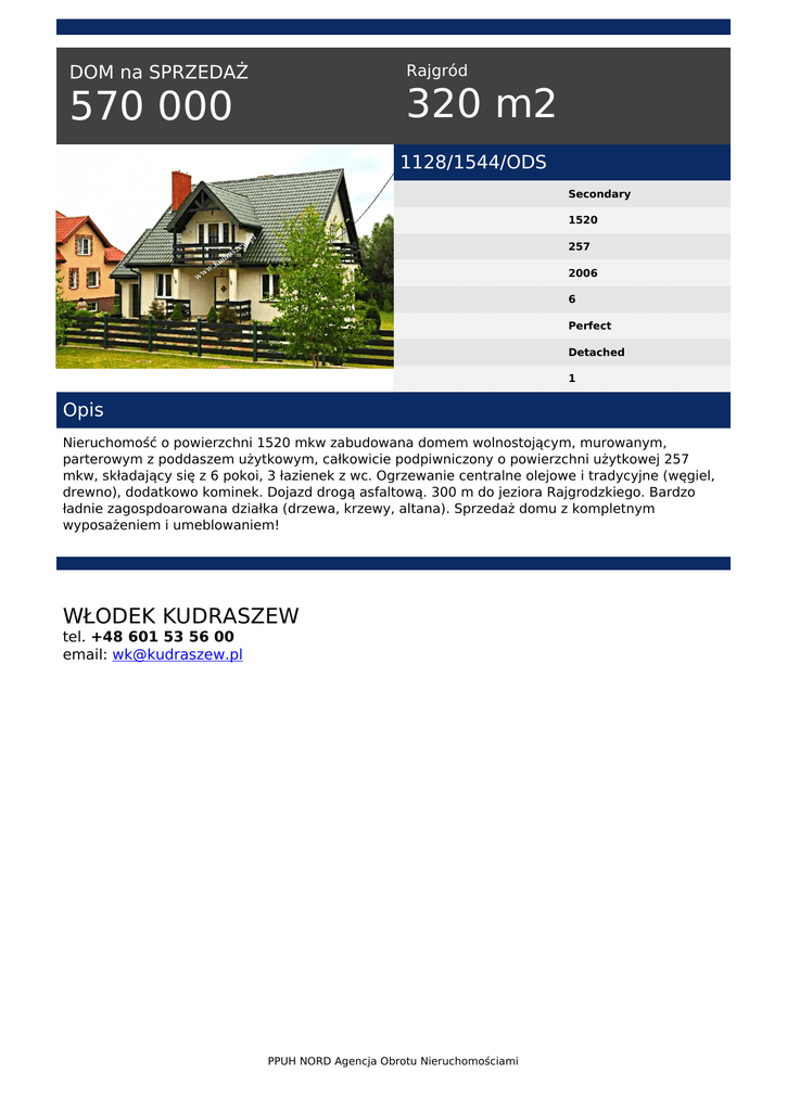 Rajgród DOM na SPRZEDAŻ 320 m2 570 000 1128/1544/ODS Secondary 1520 257 2006 6 Perfect Detached 1 Opis Nieruchomość o powierzchni 1520 mkw zabudowana domem wolnostojącym, murowanym, parterowym z poddaszem użytkowym, całkowicie podpiwniczony o powierzchni użytkowej 257 mkw, składający się z 6 pokoi, 3 łazienek z wc. Ogrzewanie centralne olejowe i tradycyjne (węgiel, drewno), dodatkowo kominek. Dojazd drogą asfaltową. 300 m do jeziora Rajgrodzkiego. Bardzo ładnie zagospdoarowana działka (drzewa, krzewy, altana). Sprzedaż domu z kompletnym wyposażeniem i umeblowaniem! WŁODEK KUDRASZEW tel. +48 601 53 56 00 email: [email protected] PPUH NORD Agencja Obrotu Nieruchomościami Powered by TCPDF (www.tcpdf.org)