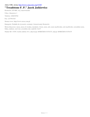 Adres URL strony http://www.smacznie.org/15387 "Treadstone F. P." Jacek Jaśkiewicz Komorów, 05-806, woj. mazowieckie Ulica: Akacjowa 1 Telefon: 228638782 Fax: 227591363 Strona www: http://www.noze.com.pl Kategorie: Dodatki do żywności, aromaty i konserwanty Komorów Słowa kluczowe: mora, mora of sweden, morakniv, frosts, noże, nóż, noże myśliwskie, nóż myśliwski, szwedzkie noże, finka, outdoor, survival, szwedzka stal, sandvik 12c27 Numer ID: 15387, liczba odsłon: 611, aktywacja: 04/06/2010 18:56:55, edycja: 04/06/2010 18:56:55 Strona 1 / 1