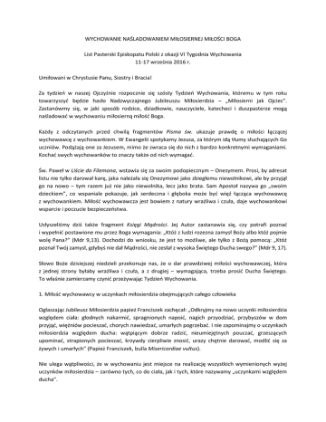 WYCHOWANIE NAŚLADOWANIEM MIŁOSIERNEJ MIŁOŚCI BOGA List Pasterski Episkopatu Polski z okazji VI Tygodnia Wychowania 11-17 września 2016 r. Umiłowani w Chrystusie Panu, Siostry i Bracia! Za tydzień w naszej Ojczyźnie rozpocznie się szósty Tydzień Wychowania, któremu w tym roku towarzyszyć będzie hasło Nadzwyczajnego Jubileuszu Miłosierdzia – „Miłosierni jak Ojciec”. Zastanówmy się, w jaki sposób rodzice, dziadkowie, nauczyciele, katecheci i duszpasterze mogą naśladować w wychowaniu miłosierną miłość Boga. Każdy z odczytanych przed chwilą fragmentów Pisma św. ukazuje prawdę o miłości łączącej wychowawcę z wychowankiem. W Ewangelii spotykamy Jezusa, za którym idą tłumy słuchających Go uczniów. Podążają one za Jezusem, mimo że zwraca się do nich z bardzo konkretnymi wymaganiami. Kochać swych wychowanków to znaczy także od nich wymagać. Św. Paweł w Liście do Filemona, wstawia się za swoim podopiecznym – Onezymem. Prosi, by adresat listu nie tylko darował karę, jaka należała się Onezymowi jako zbiegłemu niewolnikowi, ale by przyjął go na nowo – tym razem już nie jako niewolnika, lecz jako brata. Sam Apostoł nazywa go „swoim dzieckiem”, co wspaniale pokazuje, jak serdeczna i głęboka może być więź łącząca wychowawcę z wychowankiem. Miłość wychowawcza jest bowiem z natury wrażliwa i czuła, daje wychowankowi wsparcie i poczucie bezpieczeństwa. Usłyszeliśmy dziś także fragment Księgi Mądrości. Jej Autor zastanawia się, czy potrafi poznać i wypełnić postawione mu przez Boga wymagania: „Któż z ludzi rozezna zamysł Boży albo któż pojmie wolę Pana?” (Mdr 9,13). Dochodzi do wniosku, że jest to możliwe, ale tylko z Bożą pomocą: „Któż poznał Twój zamysł, gdybyś nie dał Mądrości, nie zesłał z wysoka Świętego Ducha swego?” (Mdr 9, 17). Słowo Boże dzisiejszej niedzieli przekonuje nas, że o dar prawdziwej miłości wychowawczej, która z jednej strony byłaby wrażliwa i czuła, a z drugiej – wymagająca, trzeba prosić Ducha Świętego. To właśnie zamierzamy czynić przeżywając Tydzień Wychowania. 1. Miłość wychowawcy w uczynkach miłosierdzia obejmujących całego człowieka Ogłaszając Jubileusz Miłosierdzia papież Franciszek zachęcał: „Odkryjmy na nowo uczynki miłosierdzia względem ciała: głodnych nakarmić, spragnionych napoić, nagich przyodziać, przybyszów w dom przyjąć, więźniów pocieszać, chorych nawiedzać, umarłych pogrzebać. I nie zapominajmy o uczynkach miłosierdzia względem ducha: wątpiącym dobrze radzić, nieumiejętnych pouczać, grzeszących upominać, strapionych pocieszać, krzywdy cierpliwie znosić, urazy chętnie darować, modlić się za żywych i umarłych” (Papież Franciszek, bulla Misericordiae vultus). Nie ulega wątpliwości, że w wychowaniu jest miejsce na realizację wszystkich wymienionych wyżej uczynków miłosierdzia – zarówno tych, co do ciała, jak i tych, które nazywamy „uczynkami względem ducha”. 2. Miłość wychowawcza potrzebuje wsparcia Święty arcybiskup Lwowa, Józef Bilczewski, w liście pasterskim o wychowaniu przytaczał obraz ze starożytnej Grecji. Pisze o mędrcach ateńskich, którzy zebrali się, by radzić, jak ratować chylącą się ku upadkowi Ojczyznę. Jeden z nich w milczeniu rzucił na ziemię zepsute jabłko. Owoc rozpadł się na kawałki, ale oczom zebranych ukazały się zdrowe ziarna. Wszyscy zrozumieli wymowę tego przykładu: nadzieję społeczeństwa stanowią dzieci i młodzież: „…wychowajmy ją zdrową fizycznie i moralnie, a Grecja wyzdrowieje” (św. abp J. Bilczewski, Młodości! Ty nad poziomy wylatuj! List pasterski do uczniów szkół średnich i seminariów nauczycielskich, 20 stycznia 1905 r.). O wychowaniu warto rozmawiać zawsze, jednak aktualność problematyki wychowawczej jako przedmiotu refleksji osobistej i społecznej w obecnym czasie wydaje się szczególnie ważna. Rozwój cywilizacyjny jest tak szybki i pociąga za sobą tyle nowych problemów, że bez pomocy pedagogów, psychologów czy lekarzy wychowawcy są często bezradni. Przykładem może tu być chociażby zjawisko uzależniania się nawet bardzo małych dzieci od tabletów czy smartfonów, powodujące między innymi ich zamykanie się na budowanie prawdziwych relacji z bliskimi. Znamienny jest widok dziecka, które przyzwyczajone do dotykowych ekranów usiłuje rączką przesuwać ilustracje w oglądanej książce. Program uczynków miłosierdzia, które wzywają do tego, by „nieumiejętnych pouczać” czy „wątpiącym dobrze radzić”, zachęca do korzystania w praktyce wychowawczej ze wsparcia kompetentnych osób i wzajemnej współpracy. Również Kościół, którego dorobek w dziedzinie wychowania zaowocował powstaniem wielu kierunków i systemów pedagogicznych, pragnie służyć rodzicom i nauczycielom. Czyni to poprzez refleksję naukową z zakresu pedagogiki i dydaktyki kontynuowaną na katolickich uczelniach, przez prowadzenie przedszkoli i szkół katolickich, a także przez posługę duszpasterzy i katechetów w parafiach oraz w każdym polskim przedszkolu i szkole. Mądrość wychowawców podpowie im, by nie marnowali okazji do korzystania z tej pomocy. 3. Miłość wychowawcza prowadzi do świadectwa Wielu rodziców, dziadków, nauczycieli zadaje sobie pytanie, co robić, by podejmowane przez nich wysiłki wychowawcze były owocne. Wypełniając program wyznaczony przez Chrystusowe przykazanie miłości, przełożone na konkretny język uczynków miłosierdzia, trzeba pamiętać, że „radzić”, „pouczać”, „upominać”, „pocieszać” należy nie tylko słowem, ale przede wszystkim czynem, a zwłaszcza przykładem własnego życia. Najskuteczniejsze jest wychowanie poprzez osobiste świadectwo wychowawcy. Dziecko potrafi bowiem czytać „pomiędzy wierszami” wypowiadanych przez rodziców słów. Nie sposób oddać koloru lub smaku 