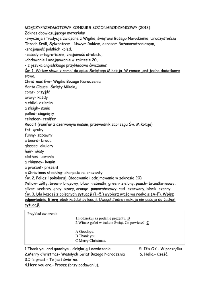 MIĘDZYPRZEDMOTOWY KONKURS BOŻONARODZENIOWY (2013) Zakres obowiązującego materiału: -zwyczaje i tradycje związane z Wigilią, świętami Bożego Narodzenia, Uroczystością Trzech Króli, Sylwestrem i Nowym Rokiem, okresem Bożonarodzeniowym, -znajomość polskich kolęd, -zasady ortograficzne, znajomość alfabetu, -dodawanie i odejmowanie w zakresie 20, - z języka angielskiego przykładowe ćwiczenia: Ćw. 1. Wstaw słowa z ramki do opisu Świętego Mikołaja. W ramce jest jedno dodatkowe słowo. Christmas Eve- Wigilia Bożego Narodzenia Santa Clause- Święty Mikołaj come- przyjść every- każdy a child- dziecko a sleigh- sanie pulled- ciągnięty reindeer- renifer Rudolf (renifer z czerwonym nosem, przewodnik zaprzęgu Św. Mikołaja) fat- gruby funny- zabawny a beard- broda glasses- okulary hair- włosy clothes- ubrania a chimney- komin a present- prezent a Christmas stocking- skarpeta na prezenty Ćw. 2. Policz i pokoloruj. (dodawanie i odejmowanie w zakresie 20) Yellow- żółty, brown- brązowy, blue- niebieski, green- zielony, peach- brzoskwiniowy, silver- srebrny, grey- szary, orange- pomarańczowy, red- czerwony, black- czarny Ćw. 3. Dla każdej z opisanych sytuacji (1.–5.) wybierz właściwą reakcję (A–F). Wpisz odpowiednią literę obok każdej sytuacji. Uwaga! Jedna reakcja nie pasuje do żadnej sytuacji. Przykład ćwiczenia: 1.Podziękuj za podanie prezentu. B 2.Witasz gości w trakcie Świąt. Co powiesz?. C A Goodbye. B Thank you. C Merry Christmas. 1.Thank you and goodbye.- dziękuję i dowidzenia 2.Merry Christmas- Wesołych Świąt Bożego Narodzenia 3.It’s great.- To jest świetne. 4.Here you are.- Proszę (przy podawaniu). 5. It’s OK.- W porządku. 6. Hello.- Cześć.